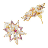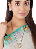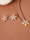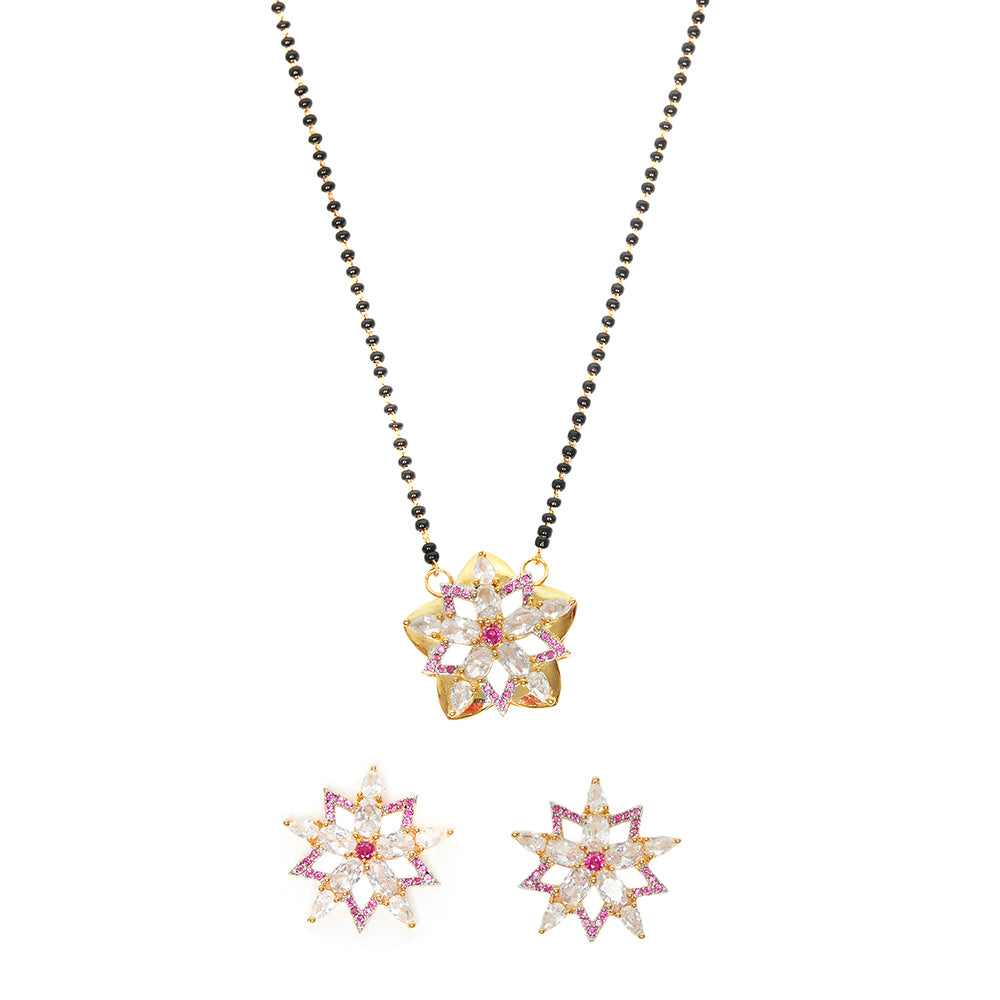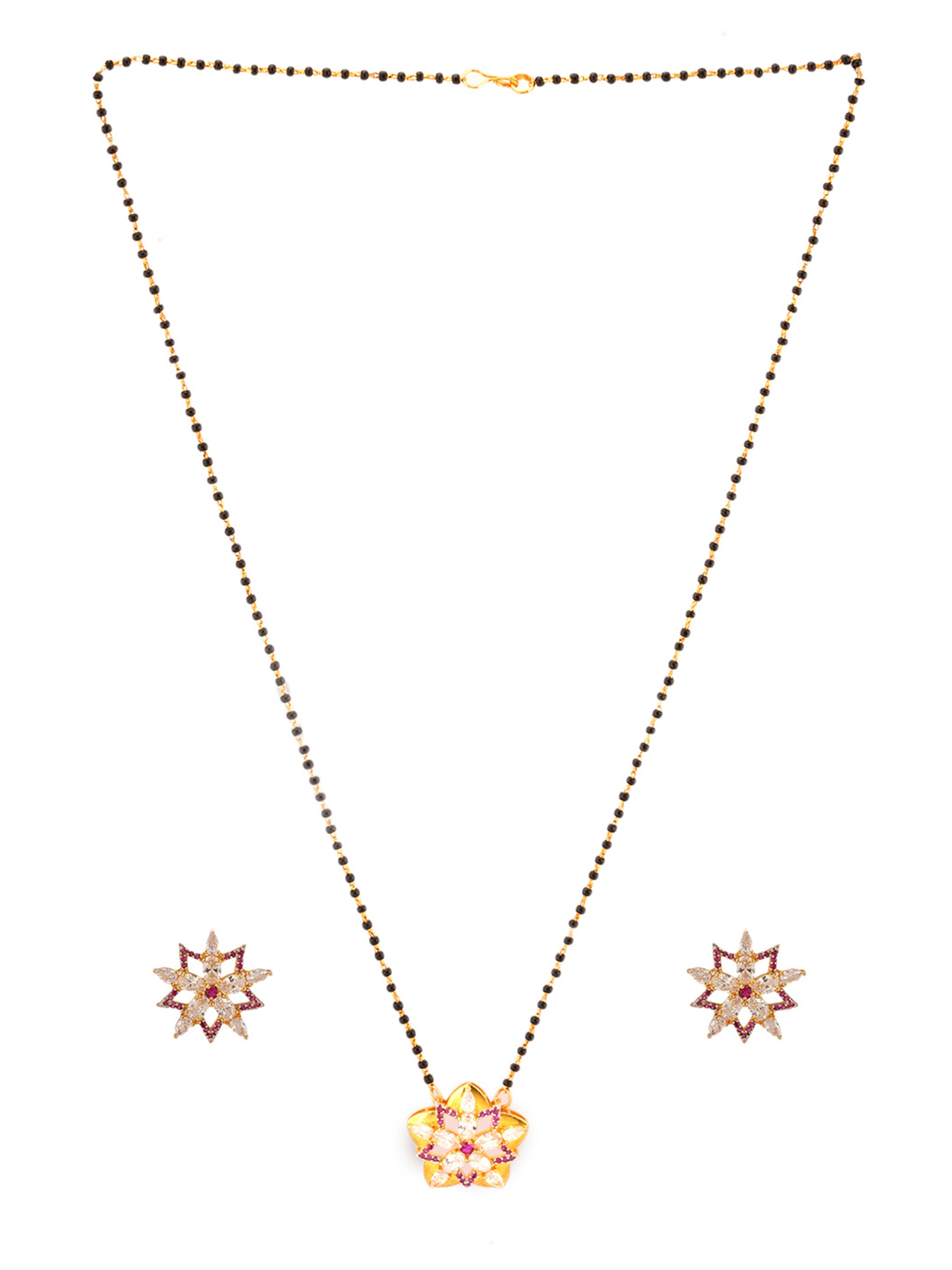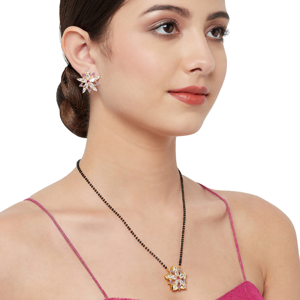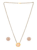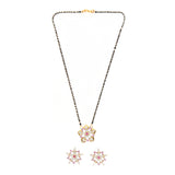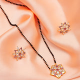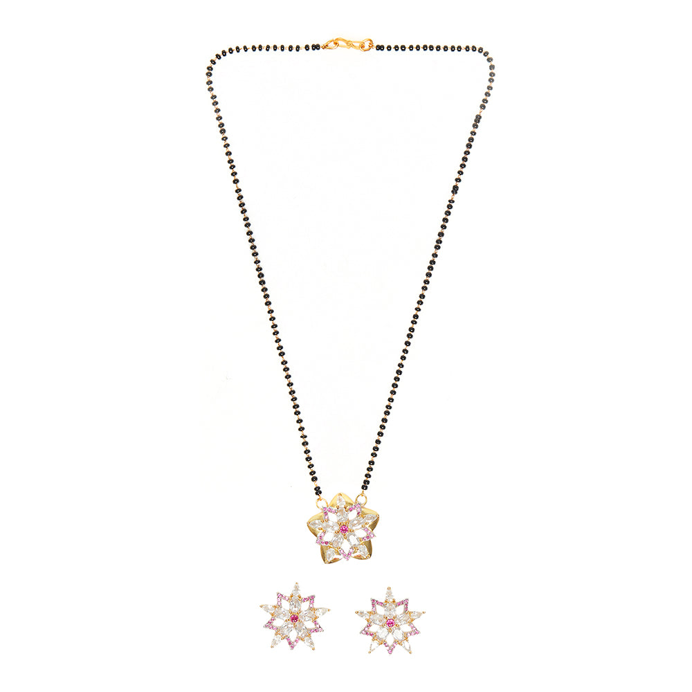 Shimmering Floret American Diamond CZ Elegant Gold Plated Brass Black Beaded Mangalsutra with Earrings