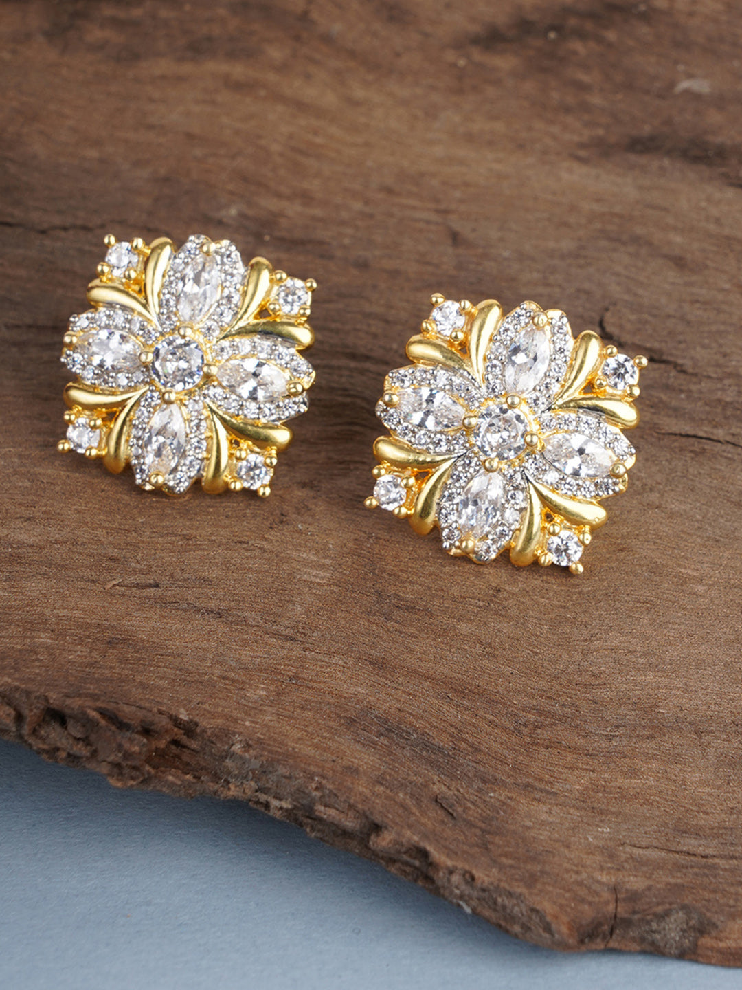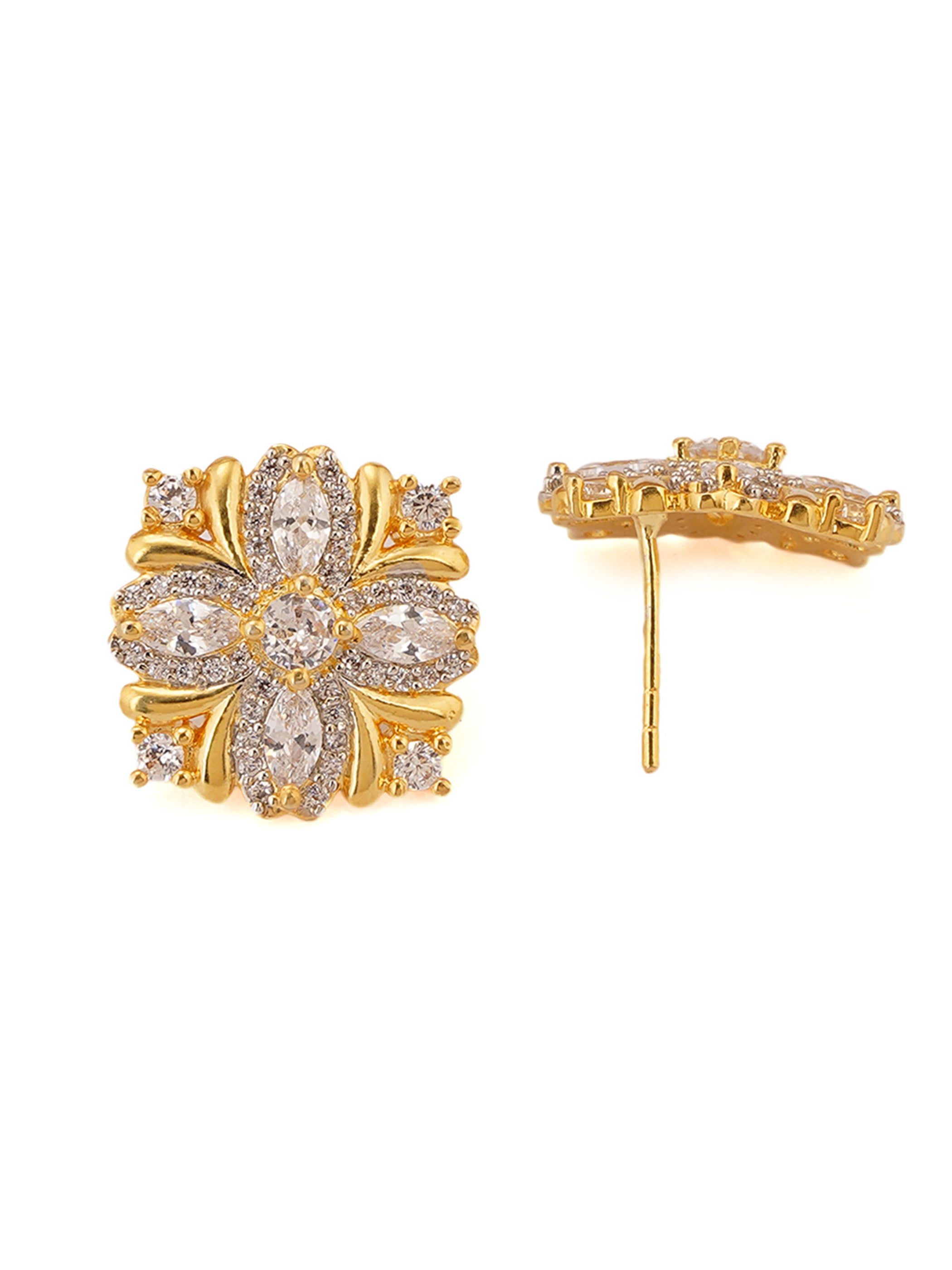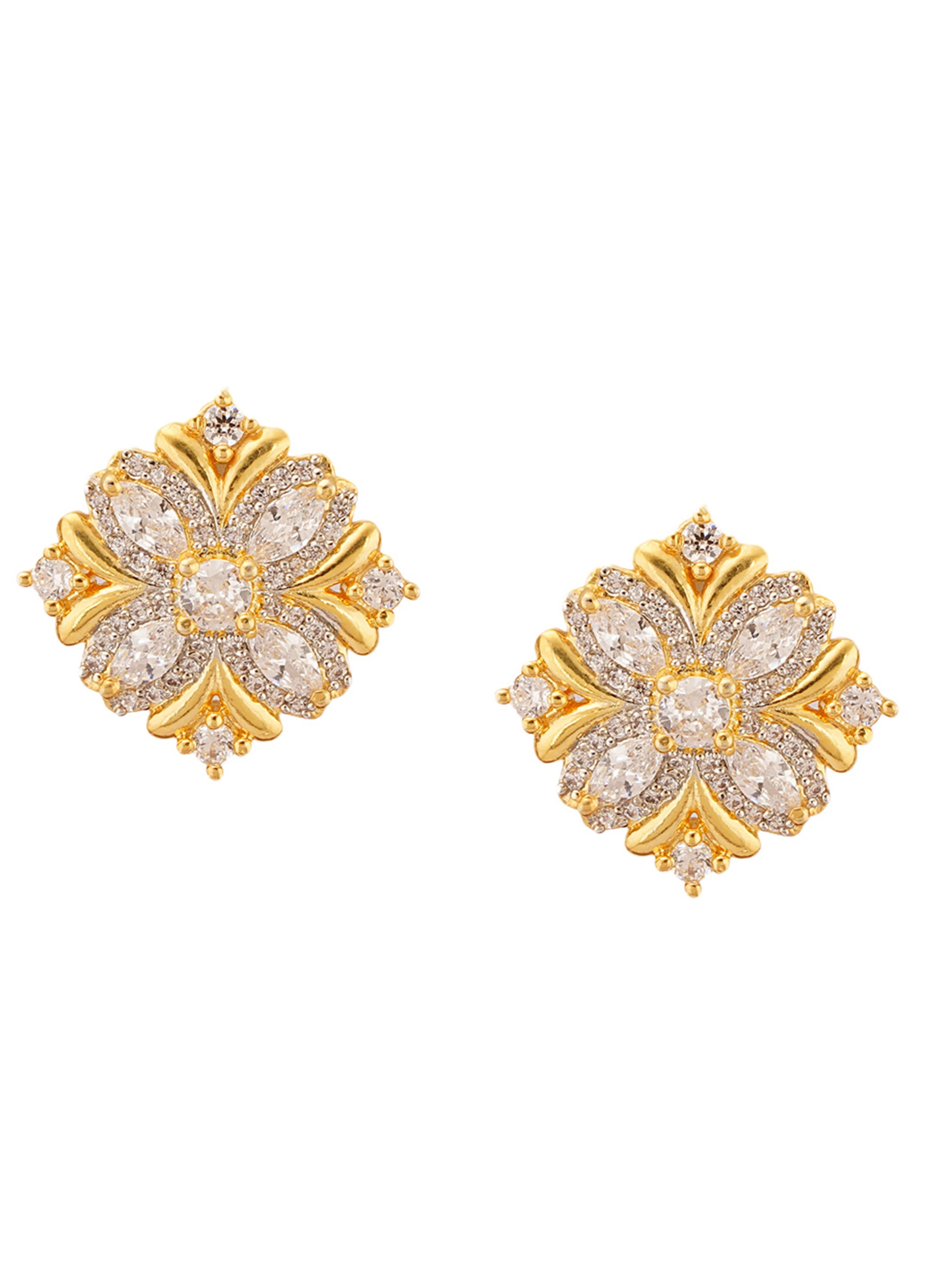 Shimmering Floret American Diamond CZ Gold Plated Silver Brass Stud Earrings