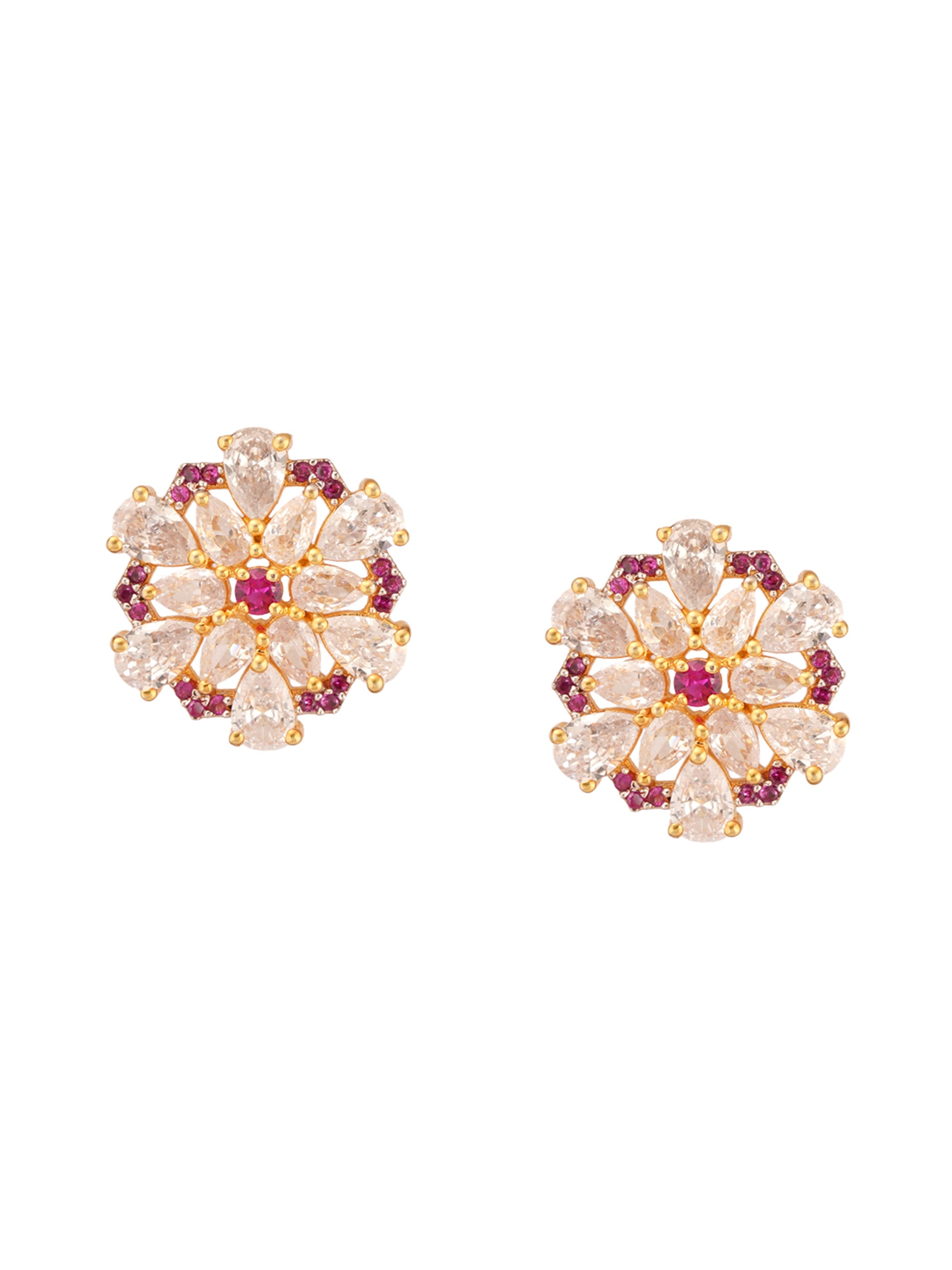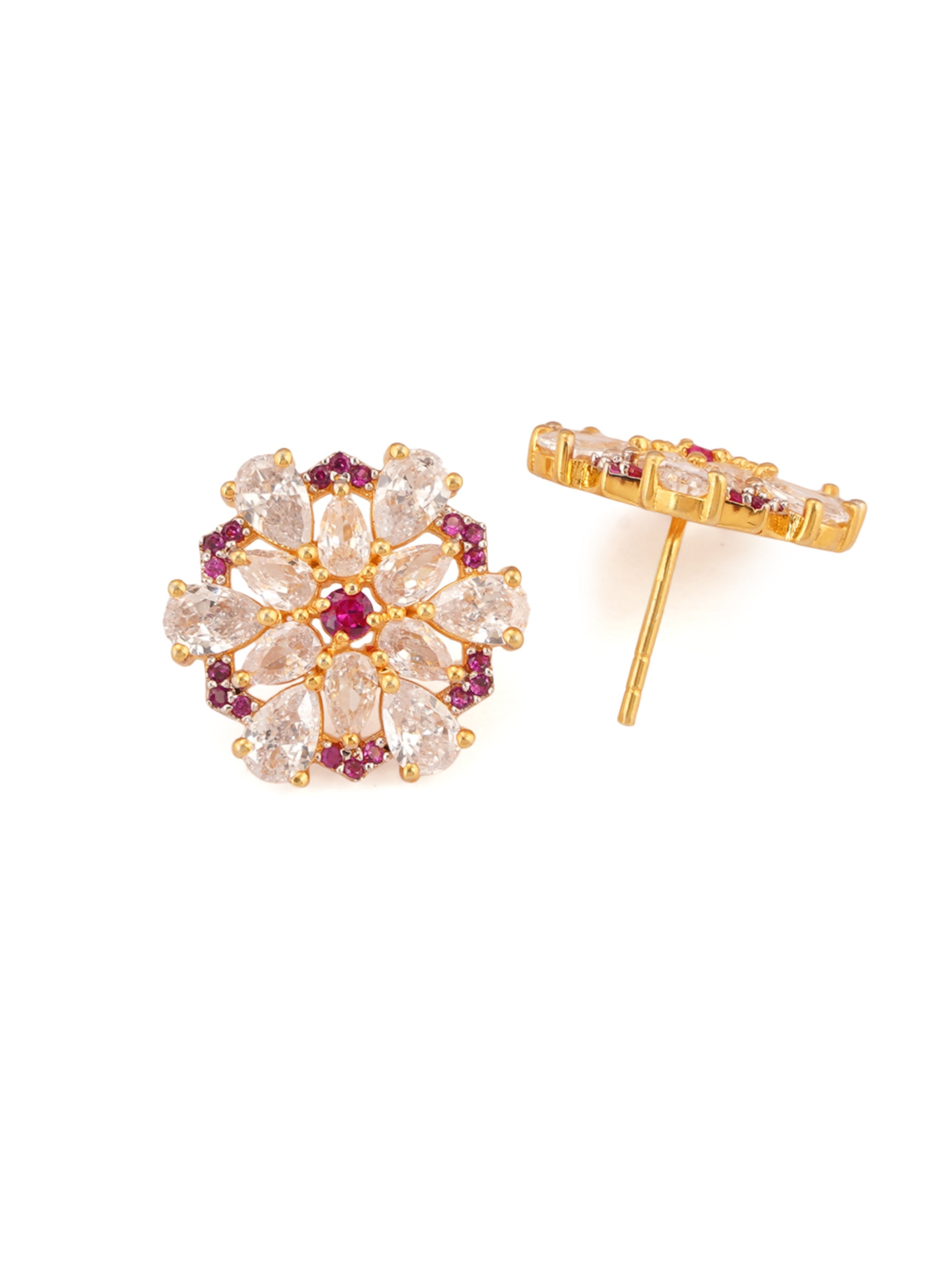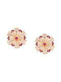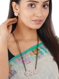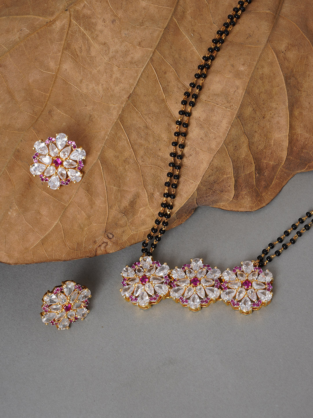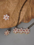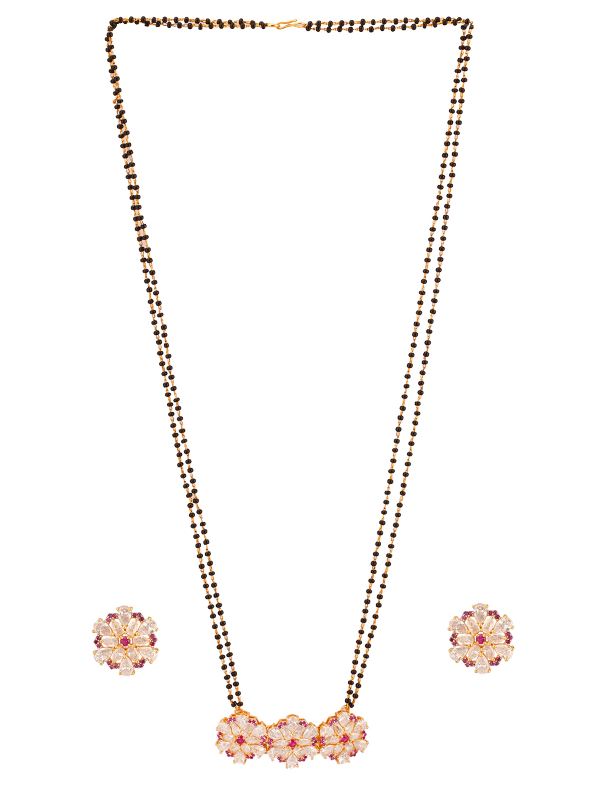 Shimmering Floret American Diamond CZ 3 Flowers Gold Plated Brass Black Beaded Mangalsutra with Earrings