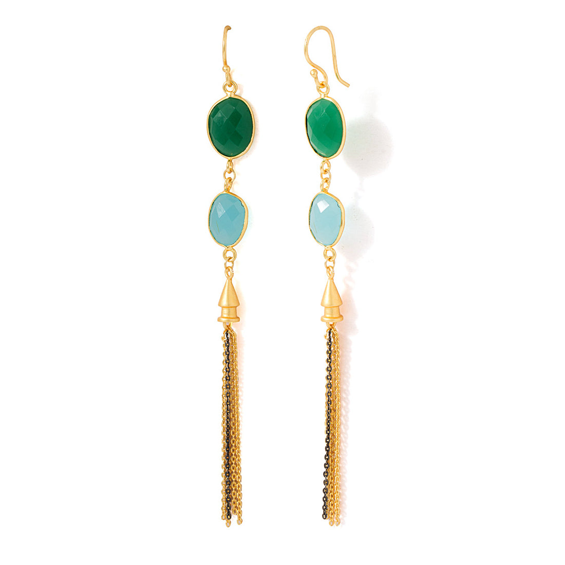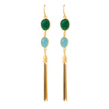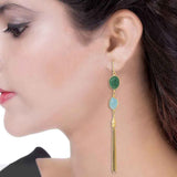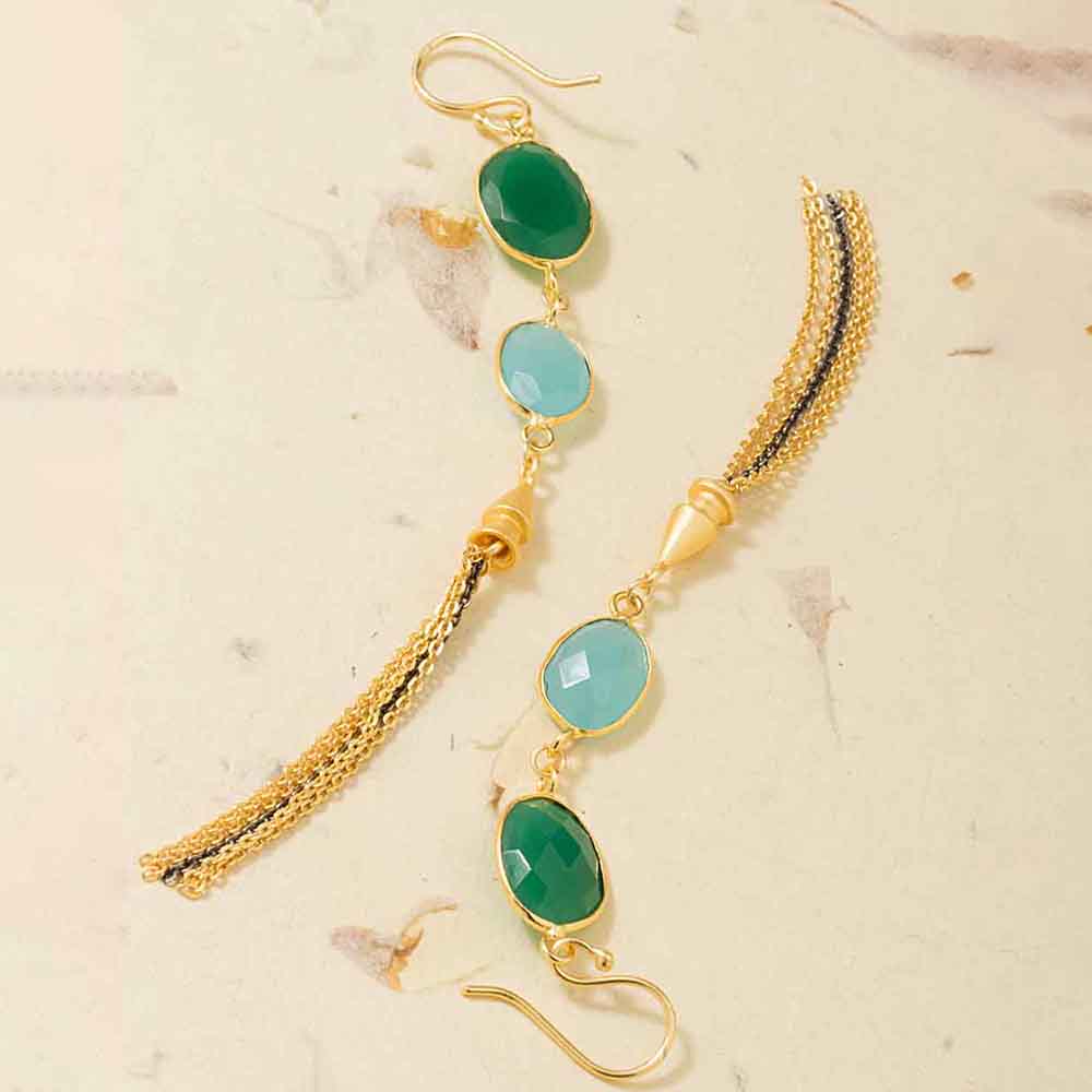 Elate your divine beauty with this beautiful statement pair of earrings. It is studded with green onyx and divine blue aquamarine stone is perfect for fashion forward women.