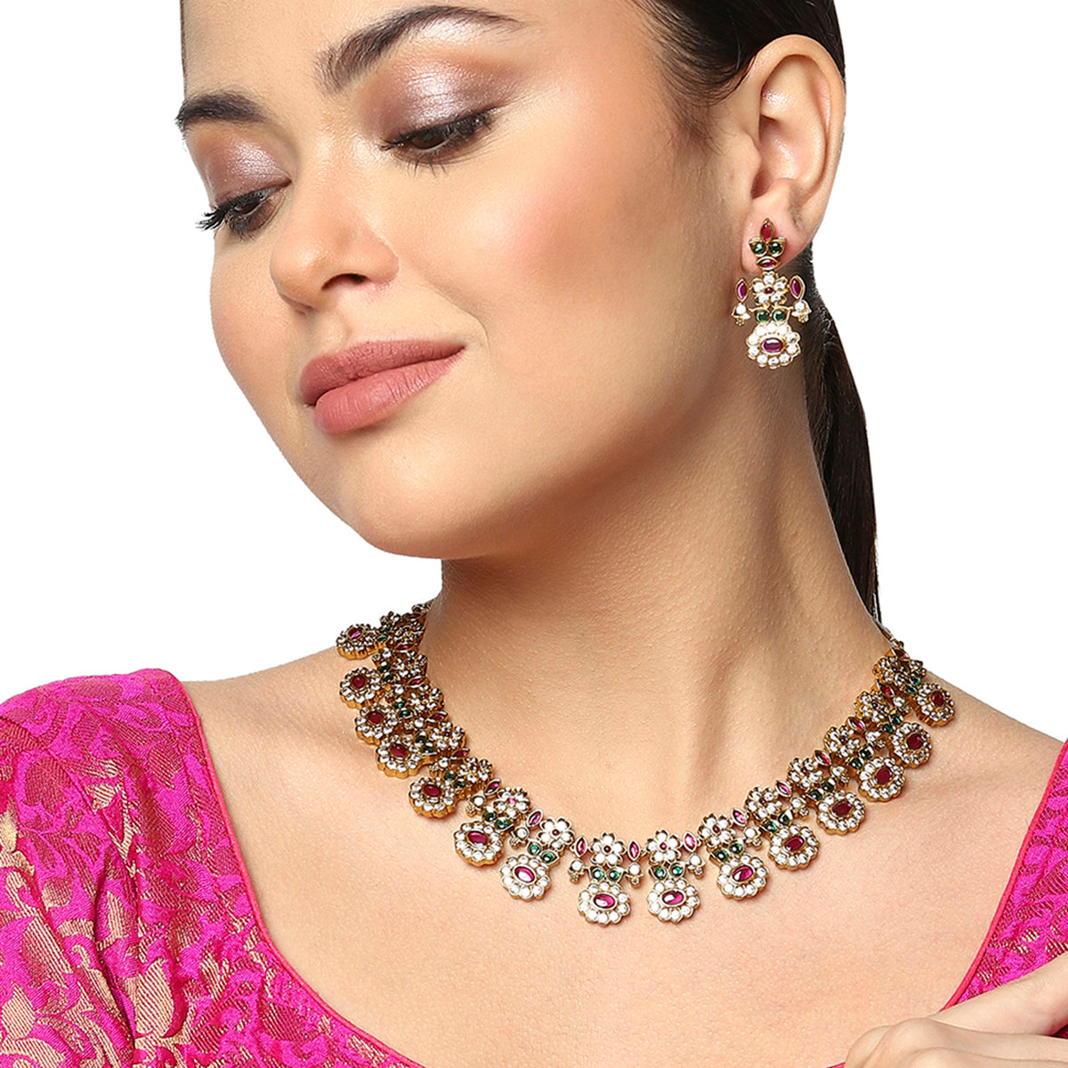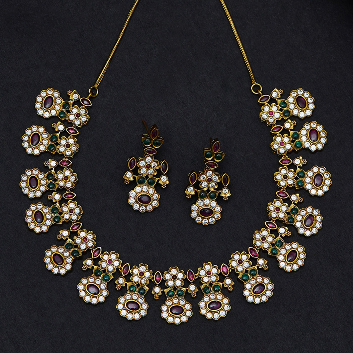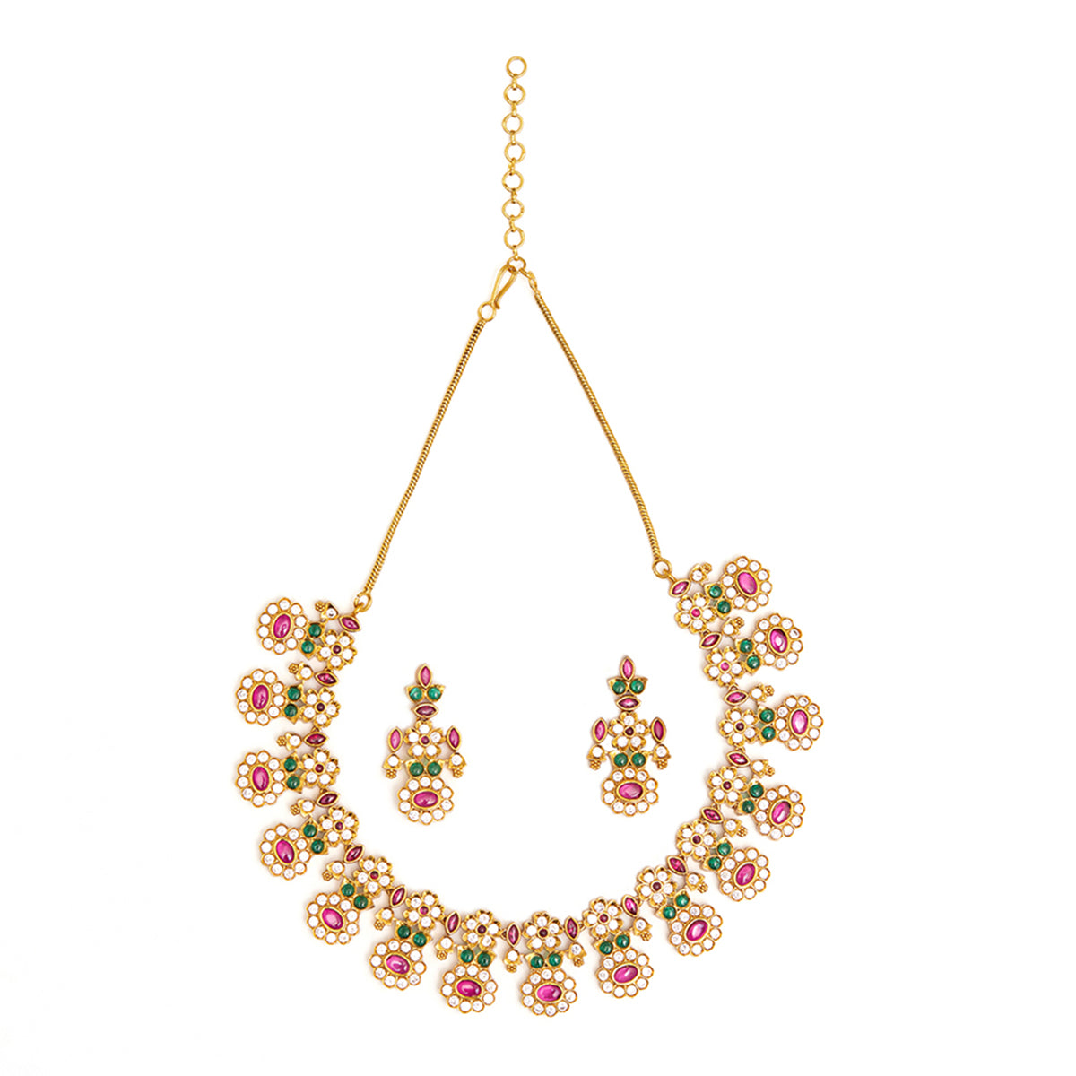 Jewellery set fashioned out of brass into delicate floral motifs. CZ gems adorned, the yellow gold plated necklace and earrings are lightweight and promise to be a comfortable wear at all times. Pair with Indian and Indo-Western outfits.