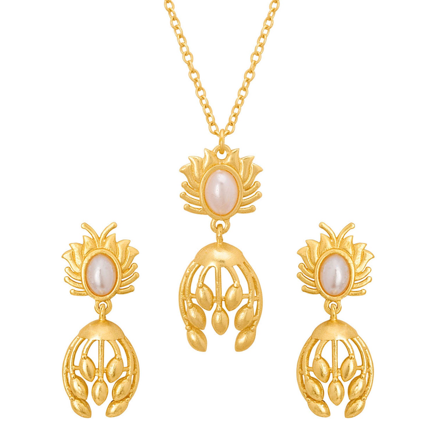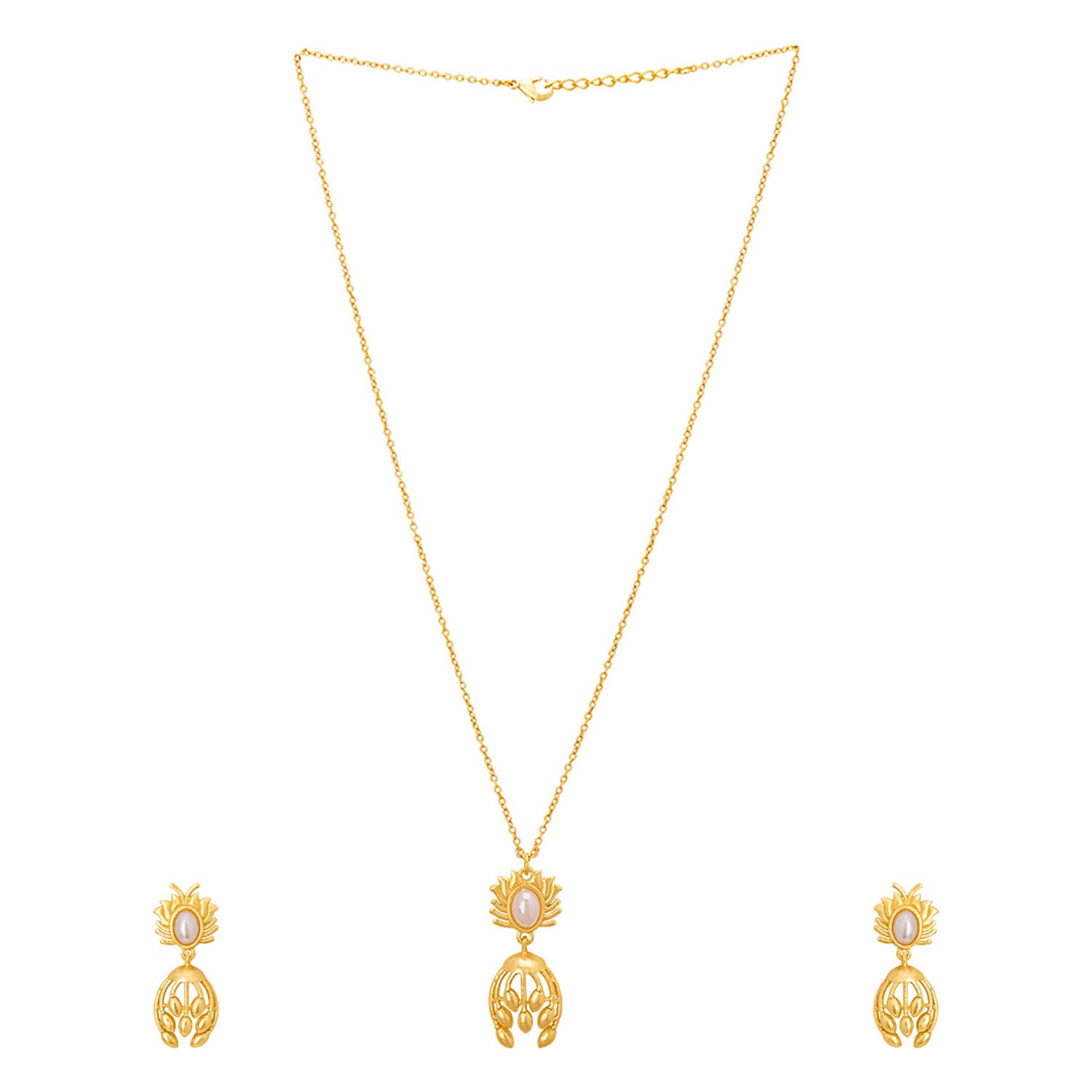 This dainty pendant set , crafted delicately into a classic floral design, will look splendid no matter what you wear it with. Brass has been used to carve the lovely pendant with chain and matching earrings, which have been given a yellow gold plating and adorned with unblemished white pearls. Perfect for all casual and formal affairs, the set promises to add bling to all your looks. This piece of jewelry comes with the Voylla assurance of quality and durability. Caring for your fashion jewelry: We at Voylla take care of every piece of jewelry so that you don't need to spend hours caring for them.
