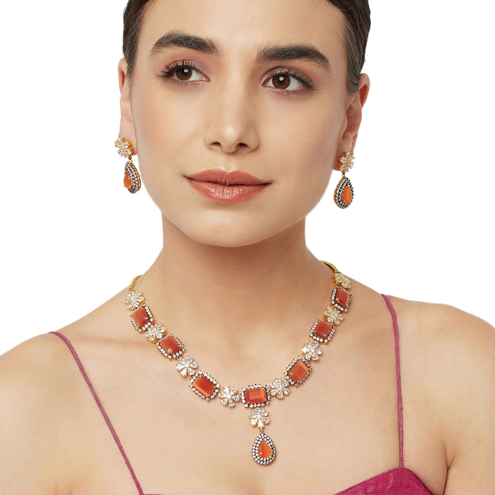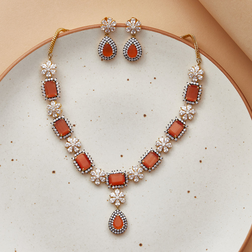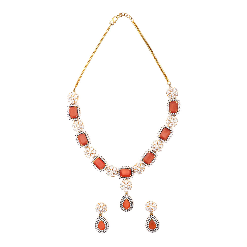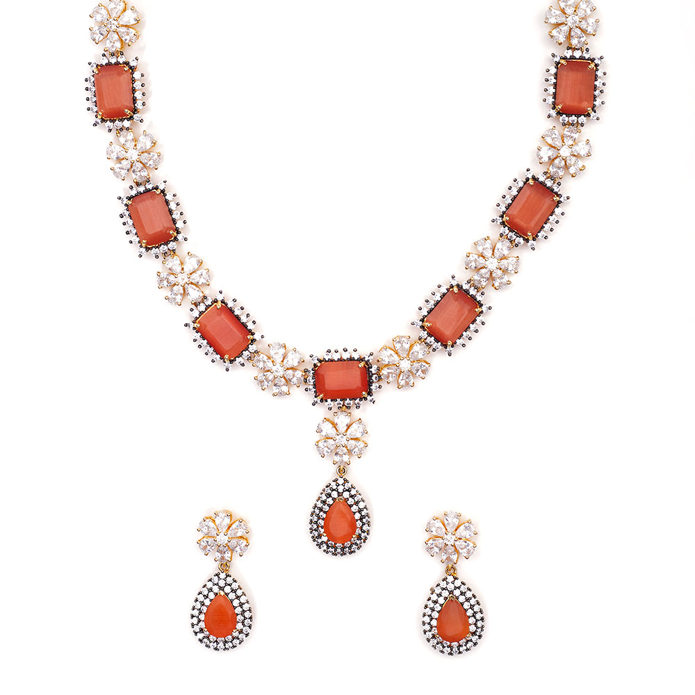 Designer necklace set made from brass. CZ gems adorned and two tone plated. Wear with formal attire.