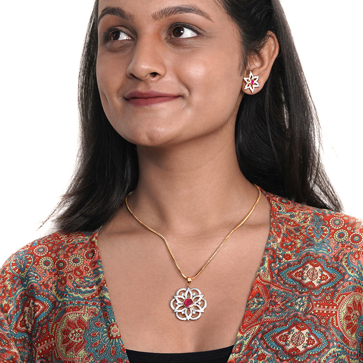 Round cut zirconia gemstones adorned jewellery set. Made from brass and silver plated. Wear with a cocktail gown or designer saree.Caring for your fashion jewelry: We, at Voylla, take care of every piece of jewelry so that you don't spend...