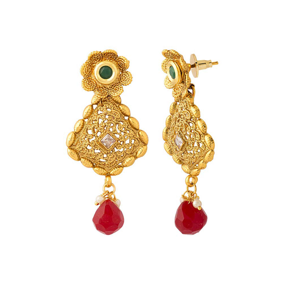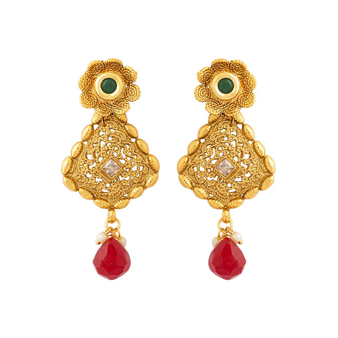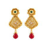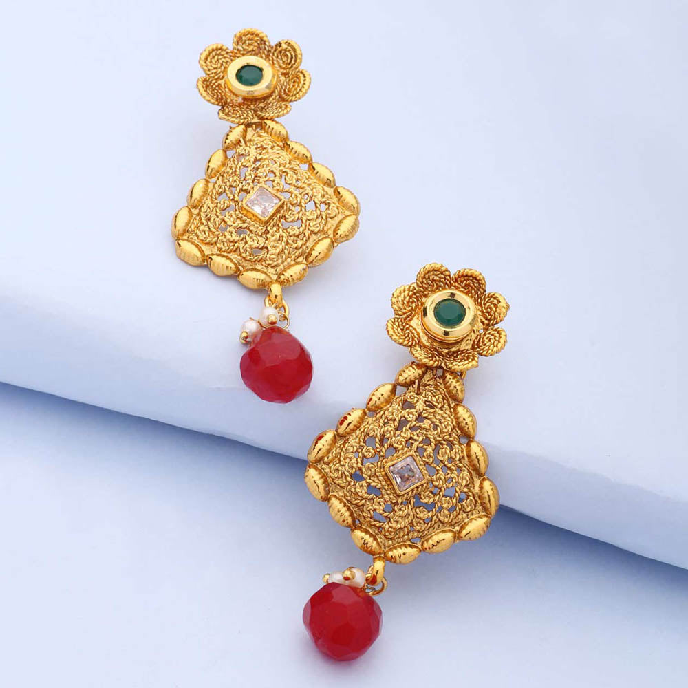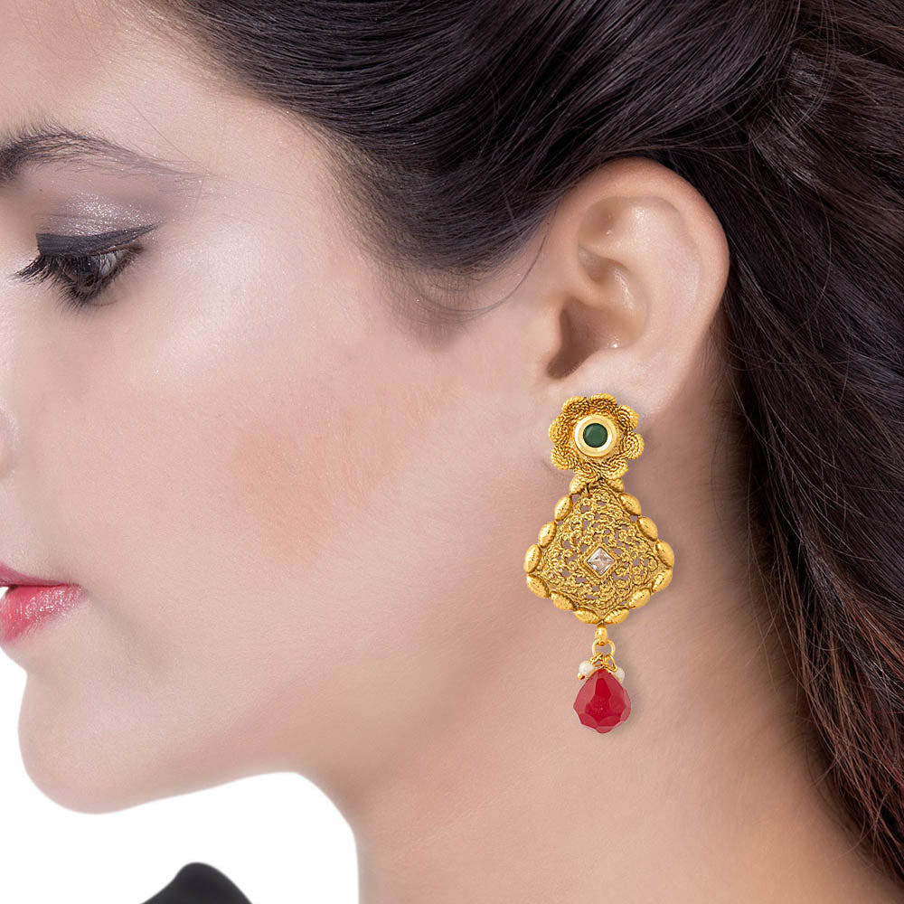 Traditional pair of earrings for the upcoming festive season. This gold plated pair has red pearl beads dangled which makes them more attractive.