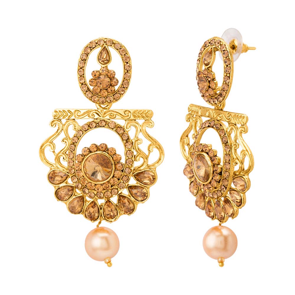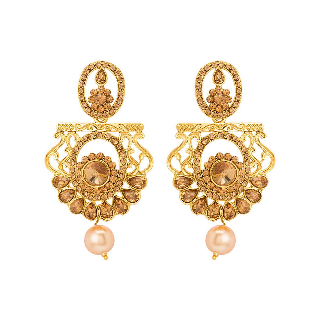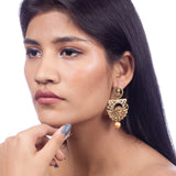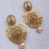 Highlight your traditional appearance with this elegant designer sparkling studded dangler earrings from the House of Voylla. A yellow gold plated pair features ethnic design, adorned with pearl beads that goes well with all your traditional outfits.