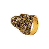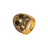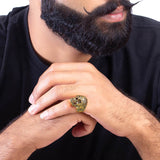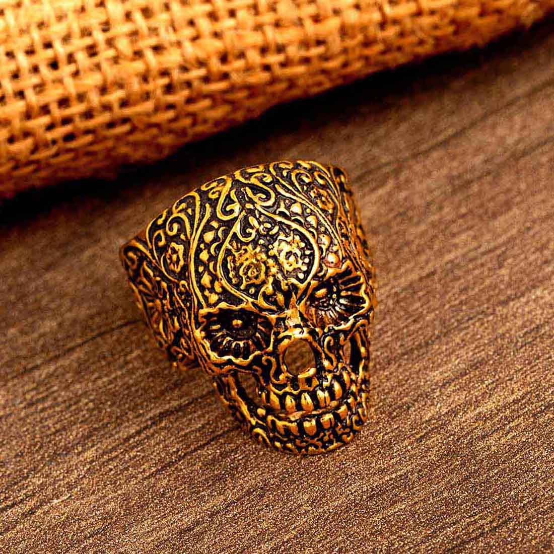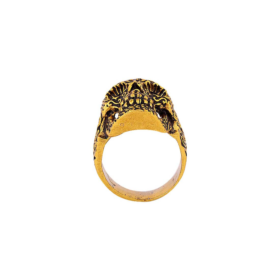 Death mask ring for men made from brass. Oxidized yellow gold plated. Good for party outfits.