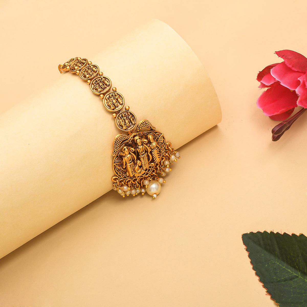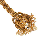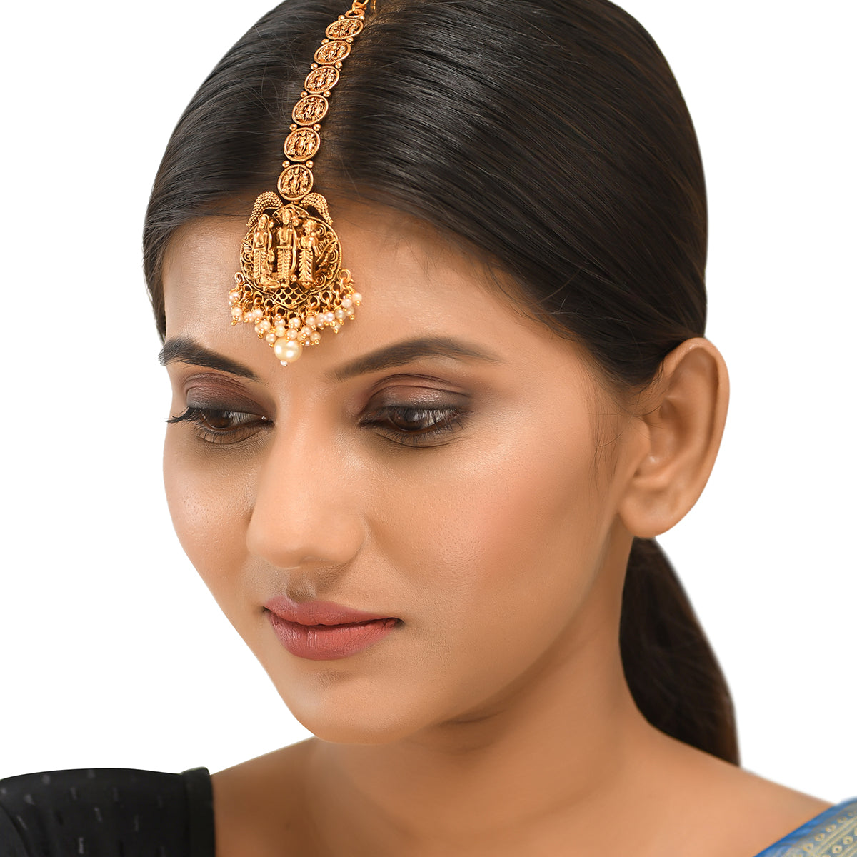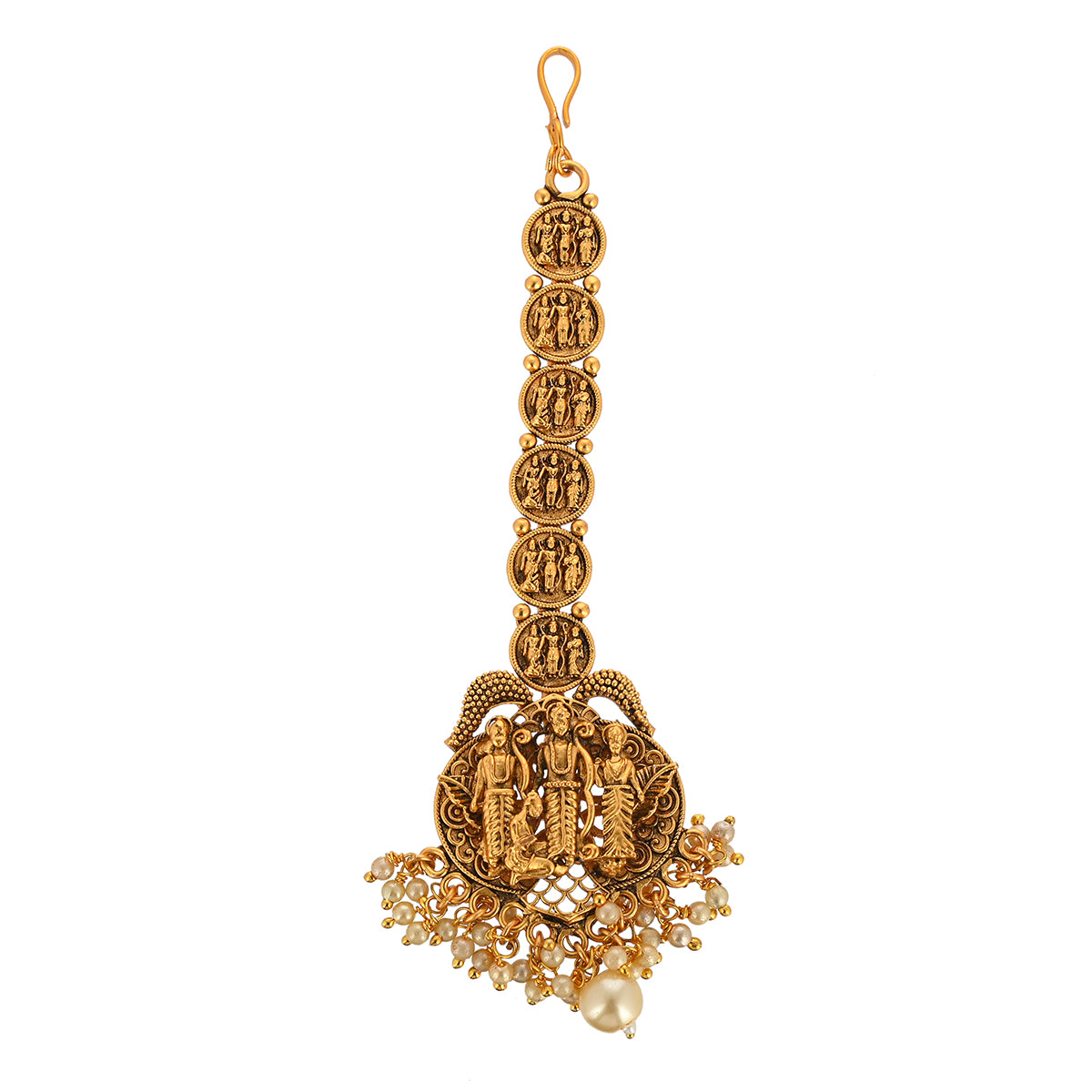 An ethnic coin maang tika, fashioned from brass into a classic temple design. Adorned with divine motifs and embellished with white faux pearls, the tika has been yellow gold plated for added charm. Pair with formal Indian looks.