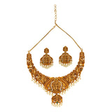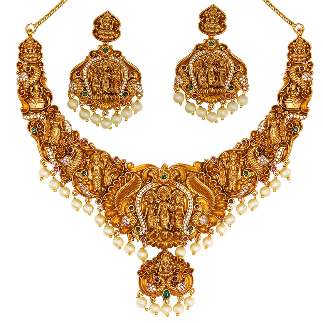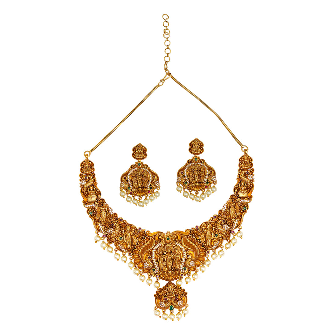 Traditional jewellery set, each piece of which has been adorned with divine motifs. The temple inspired set has been crafted from brass and embellished with faux pearls and zircon gems. Yellow gold plating adds to the allure of this lightweight and comfortable set. Wear with your favourite silk saree or lehenga.