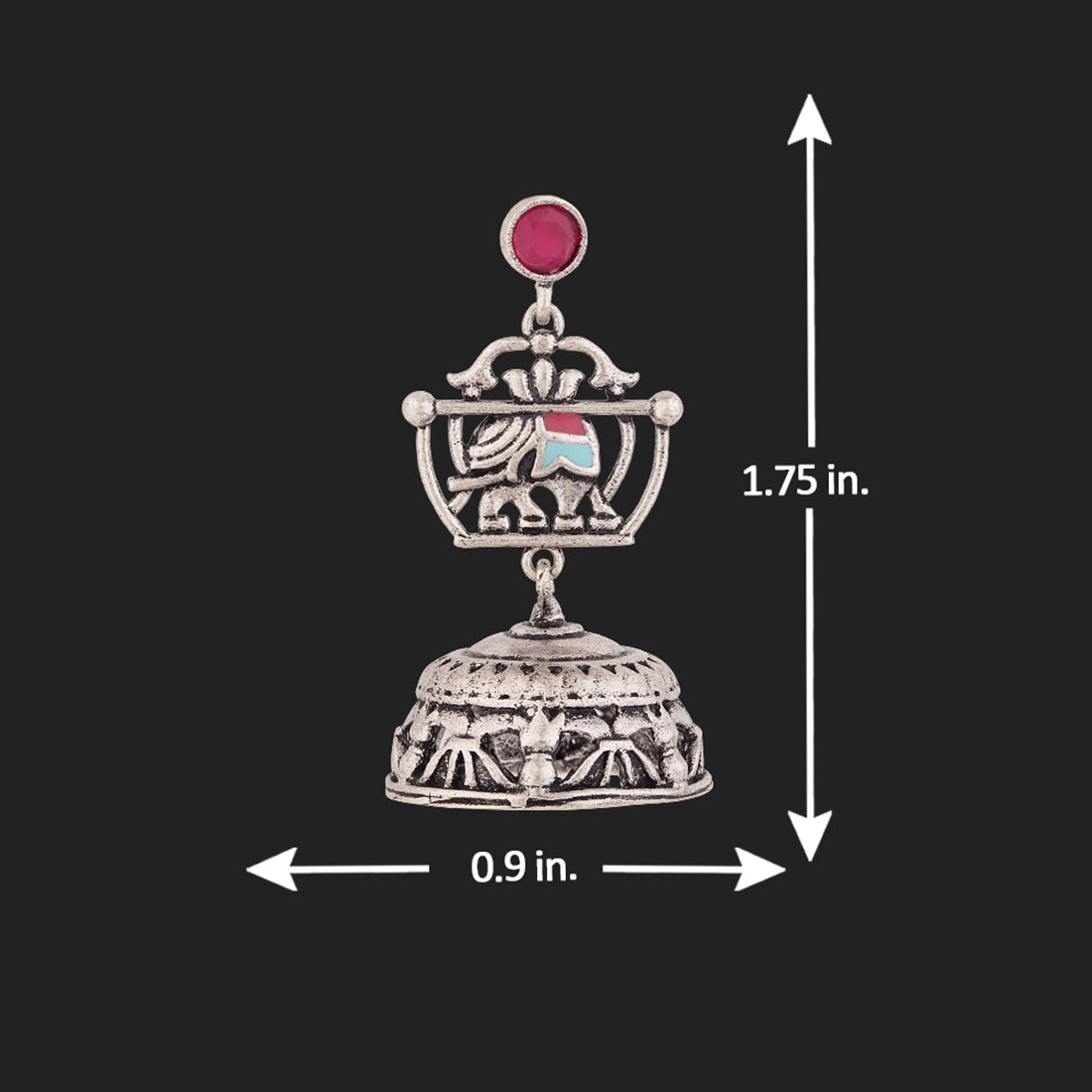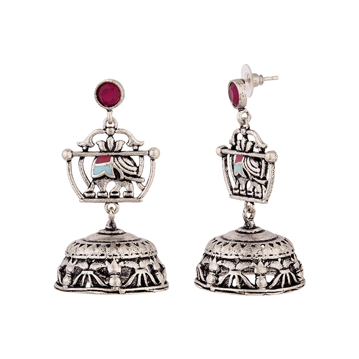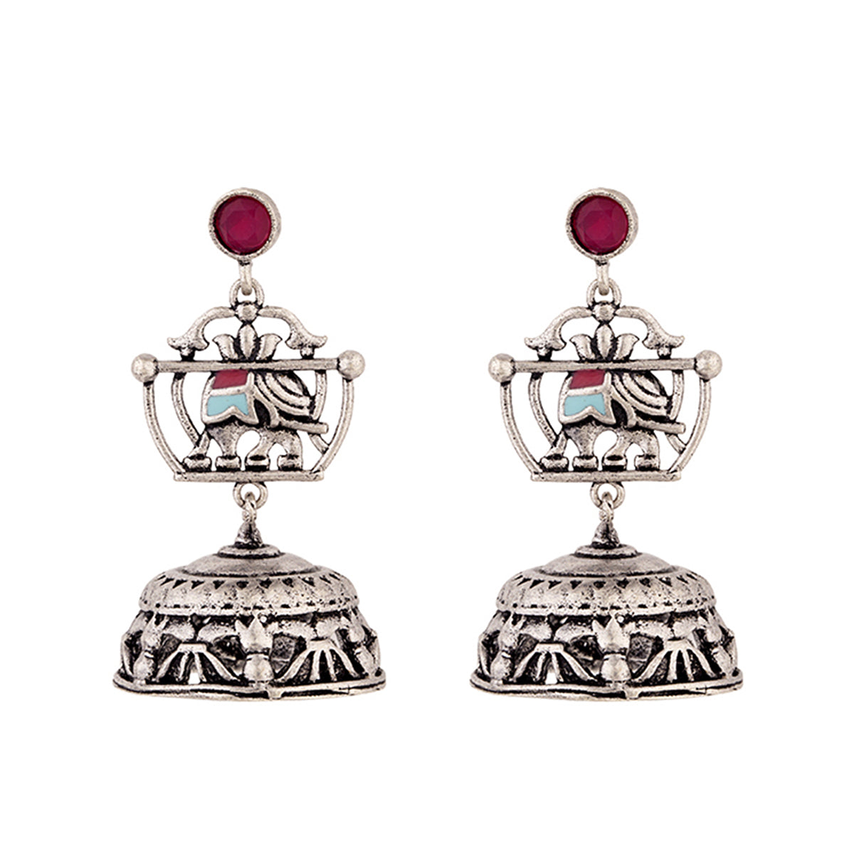 Inspired by Indian wedding processions and barats, these elephant motif jhumka earrings have been fashioned out of brass. Oxidised silver plated and enameled, these can be paired with Indian and Indo-Western attire.