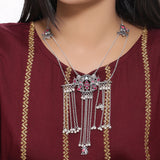 Palki and elephant motifs adorned tassels necklace, made from brass and inspired by the symbols associated with grand Indian weddings. Oxidised silver plated, lightly embellished and good for formal and casual ethnic looks.