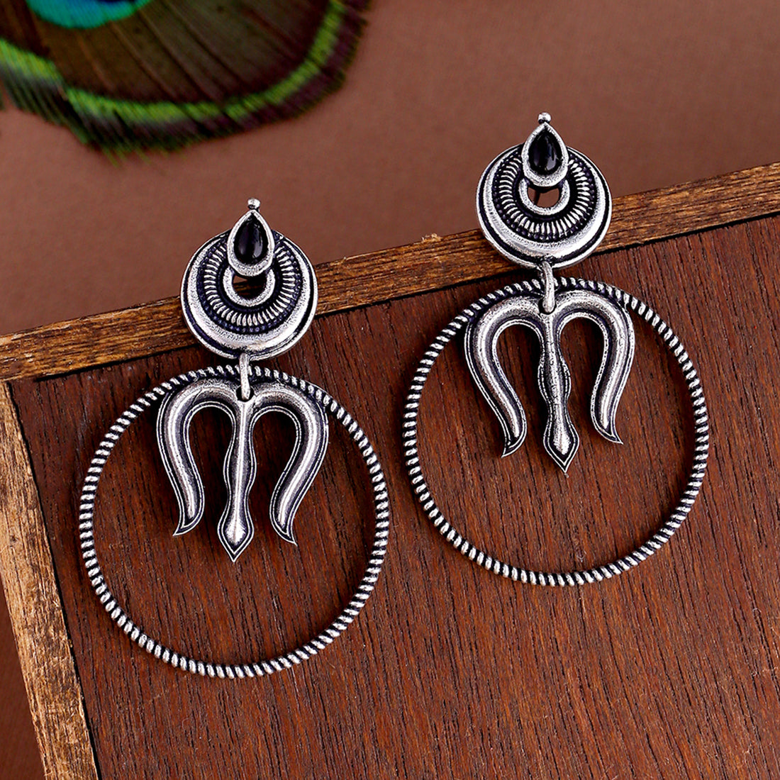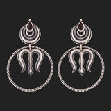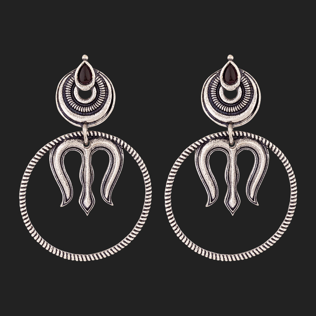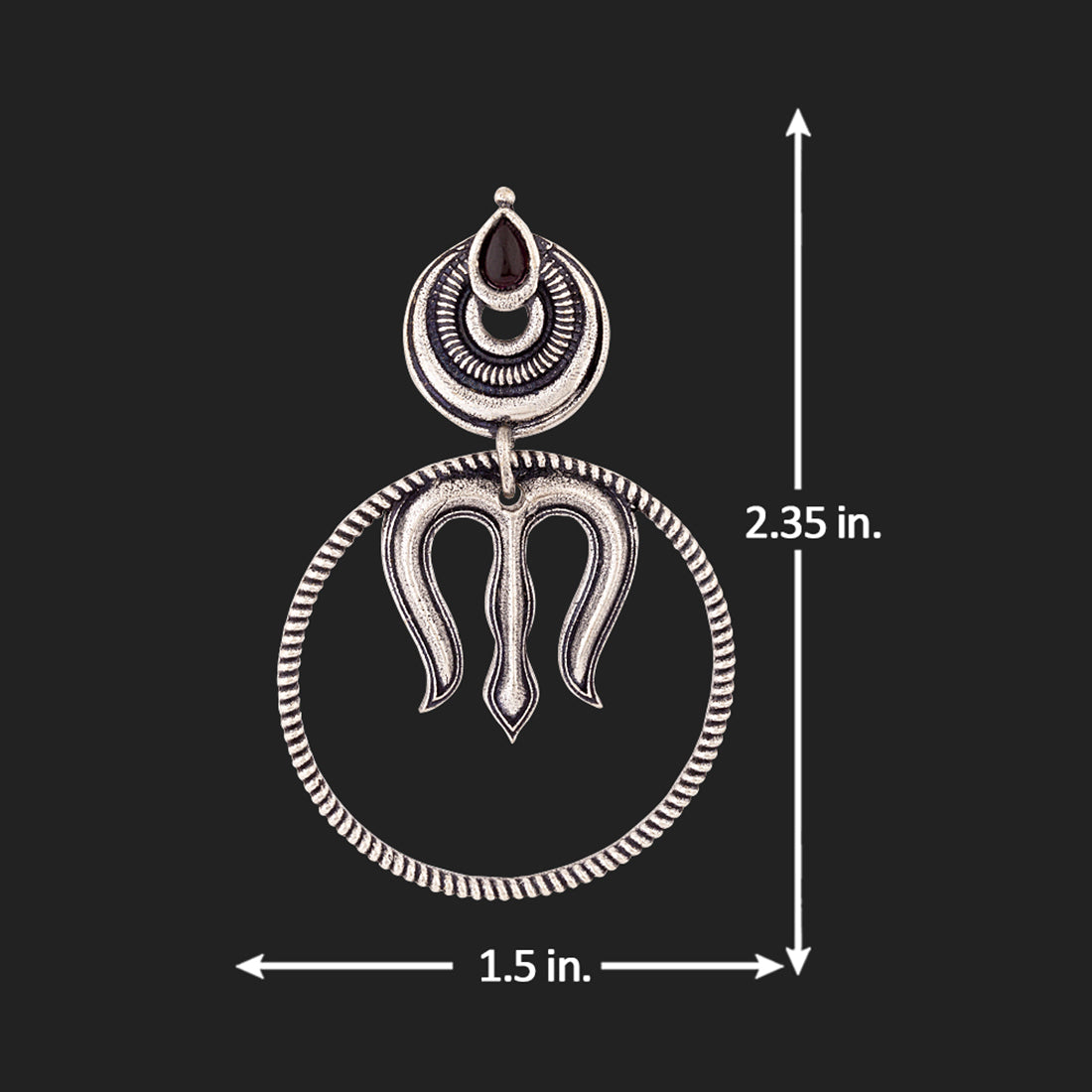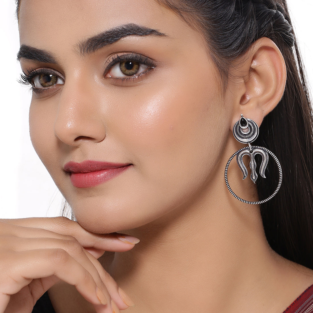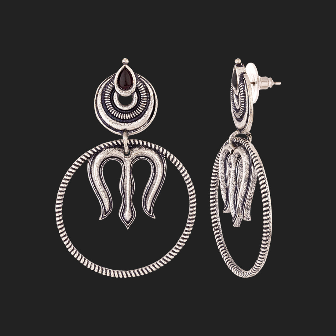 Bindu and Trishul earrings, inspired by Goddess Durga and her 9 forms. Made from brass and oxidised silver plated. The lightly embellished pair with look splendid with a casual kurta or saree. This piece of jewelry comes with the Voylla assurance of quality and durability.