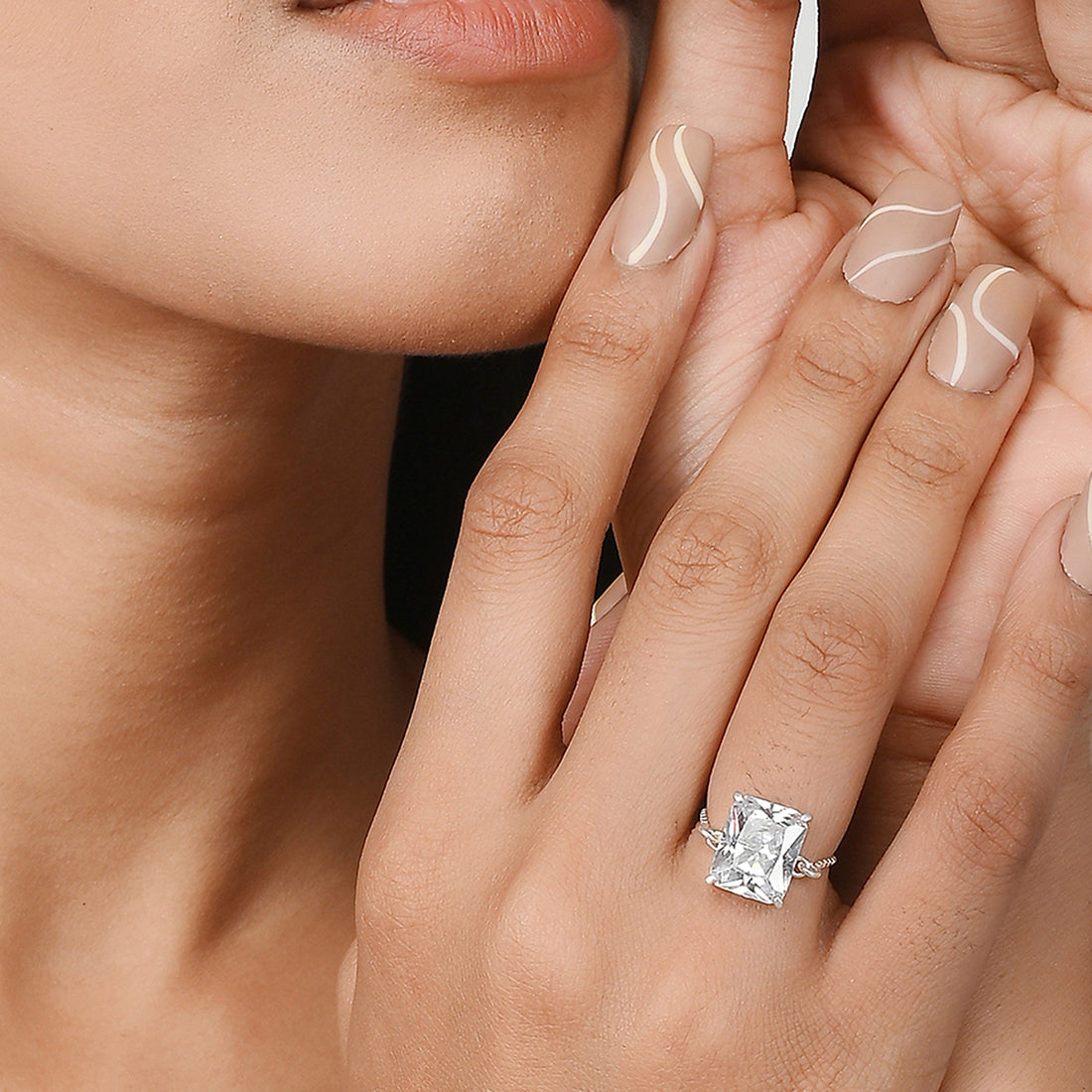 Glamorize yourself with this elegant cocktail ring in sterling silver dorned with beautiful American Diamond in the center