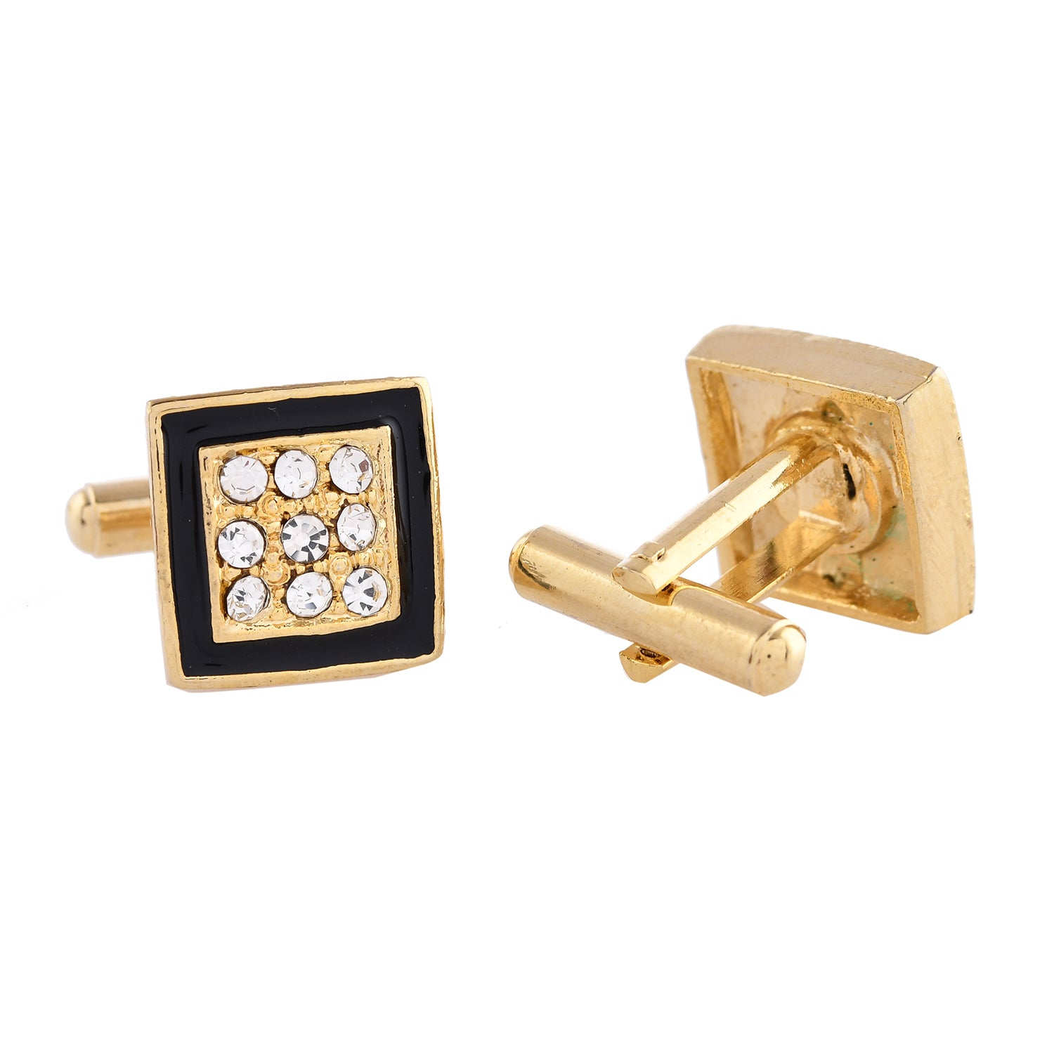 Embody sophistication and elegance with the Elite Aura Men's Cufflinks, designed to be the pinnacle of luxurious style. These cufflinks feature a distinctive square design adorned with brilliant American diamonds, set against a sleek black enamel backdrop. Crafted from premium alloy and finished with exquisite gold plating, they promise durability and a refined appearance that lasts. Part of the exclusive "Gentleman's Club" collection, these cufflinks are perfect for any formal, festive, or everyday occasion. Whether you're dressing for a wedding, cocktail event, festive celebration, or simply elevating your daily work attire, these cufflinks add a chic and sophisticated touch to your look. Additionally, they make a perfect gift for men, suitable for occasions like Valentine's Day, Diwali, Rakshabandhan, Christmas, and New Year, making them an exceptional present for a boyfriend, husband, father, or brother. The Elite Aura Men's Cufflinks seamlessly blend contemporary and traditional styles, making them an essential accessory for the modern gentleman.