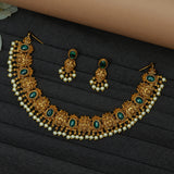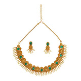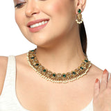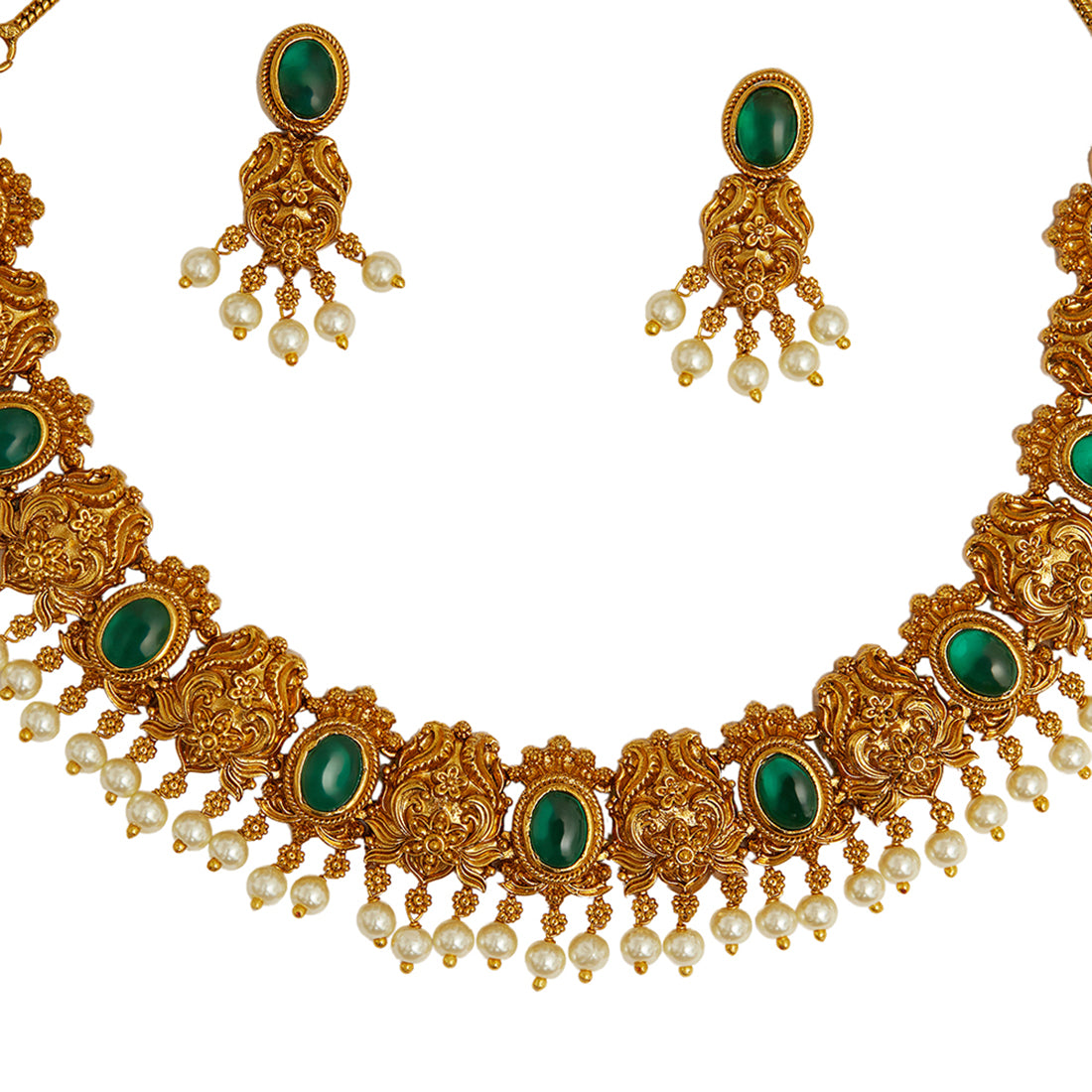Yellow gold plated guluband jewellery set, fashioned out of brass. Embellished with emerald cut CZ gemstones and faux pearls, the necklace and drop earrings are lightweight and comfortable yet luxurious. The set can be paired with sarees, formal ethnic gowns and even Indo-Western looks.