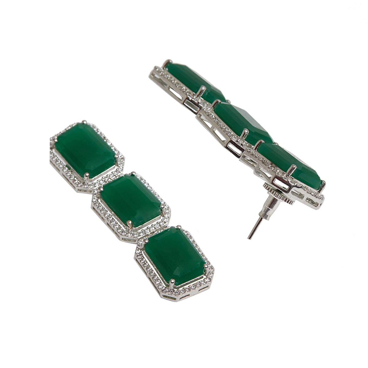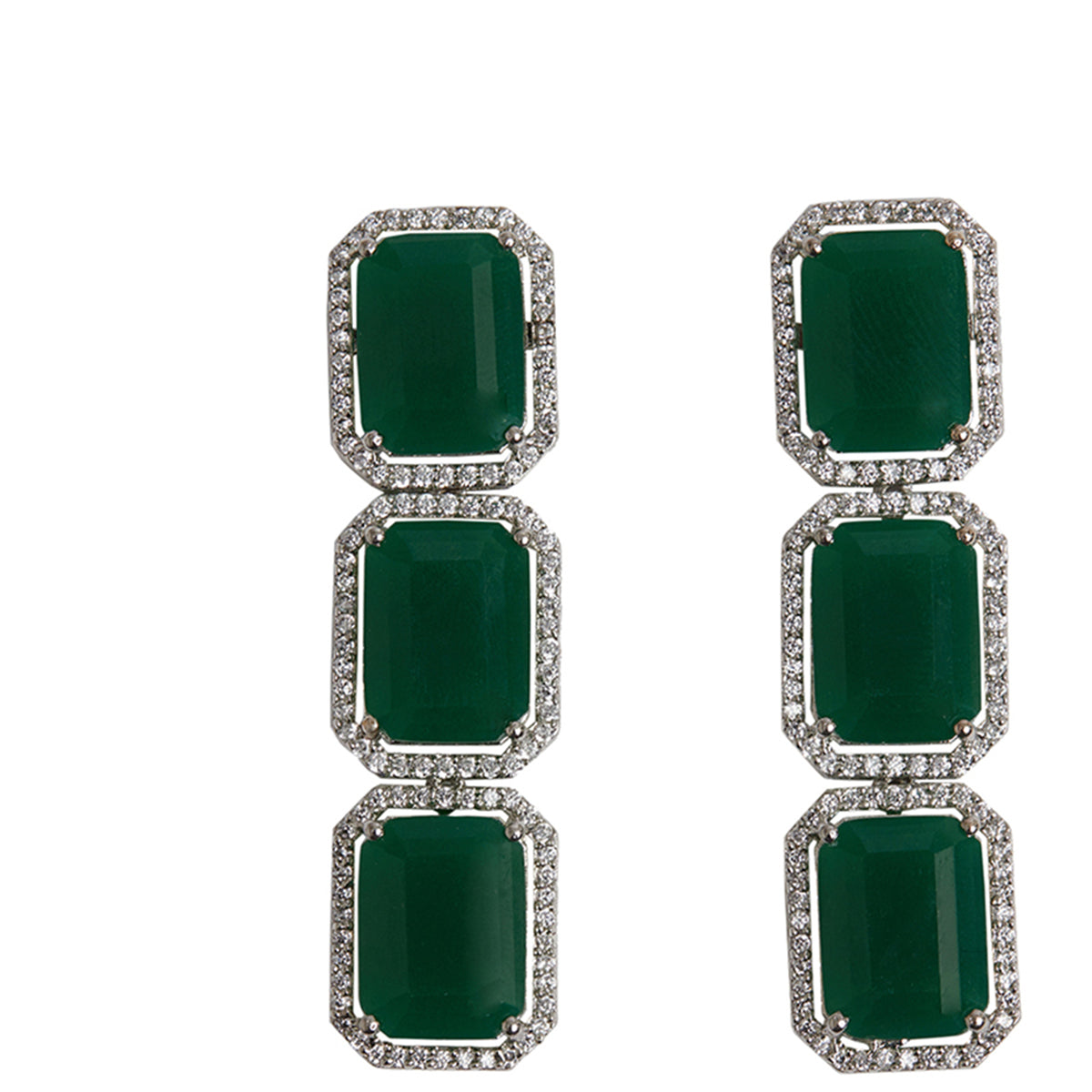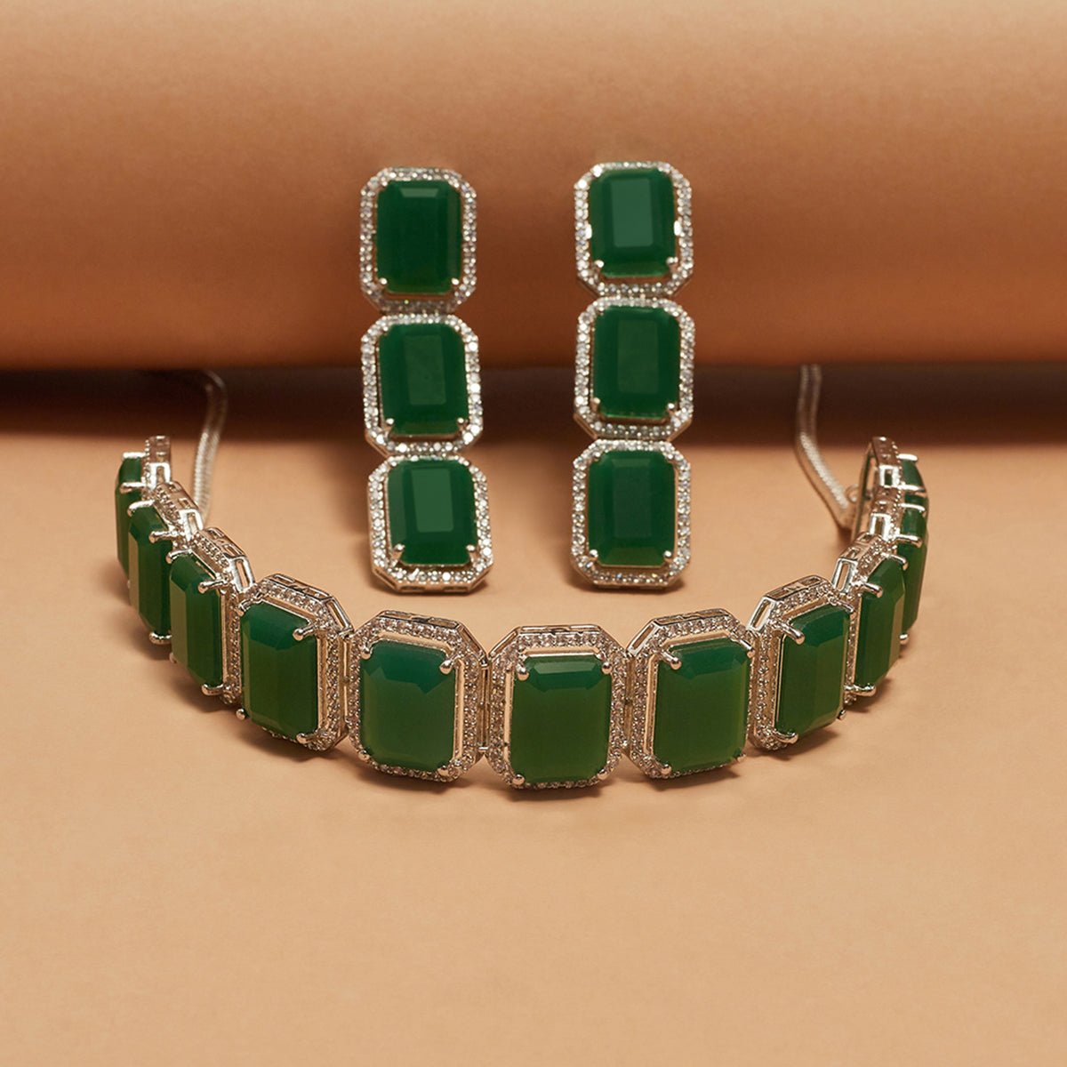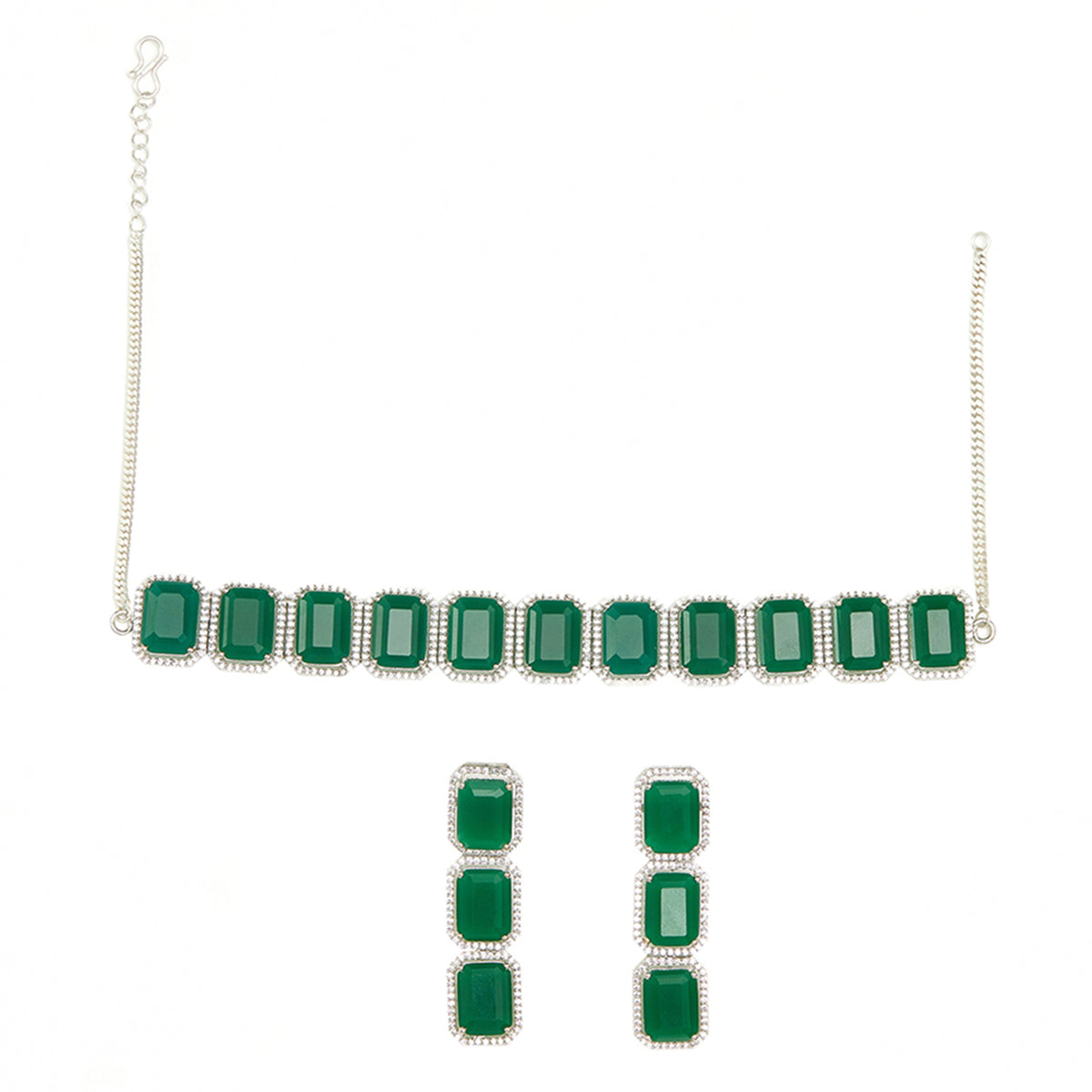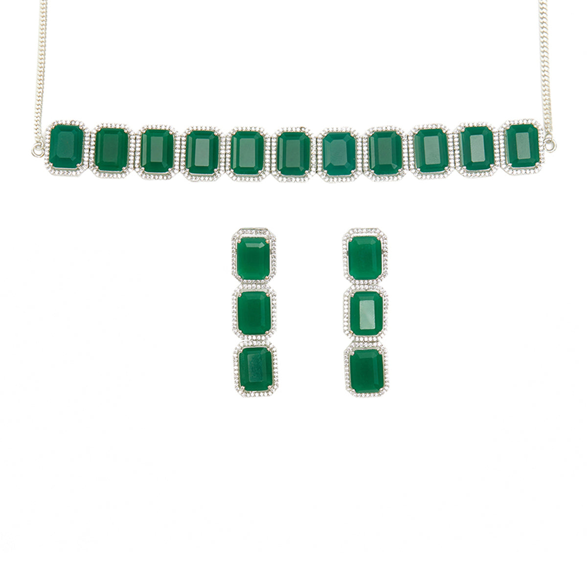 Cubic zirconia gemstones in a classic emerald cut adorn this jewellery set, which has been fashioned out of brass. White rhodium plating adds to the allure of this choker and drop earrings set, which is the perfect match for almost every formal outfit.