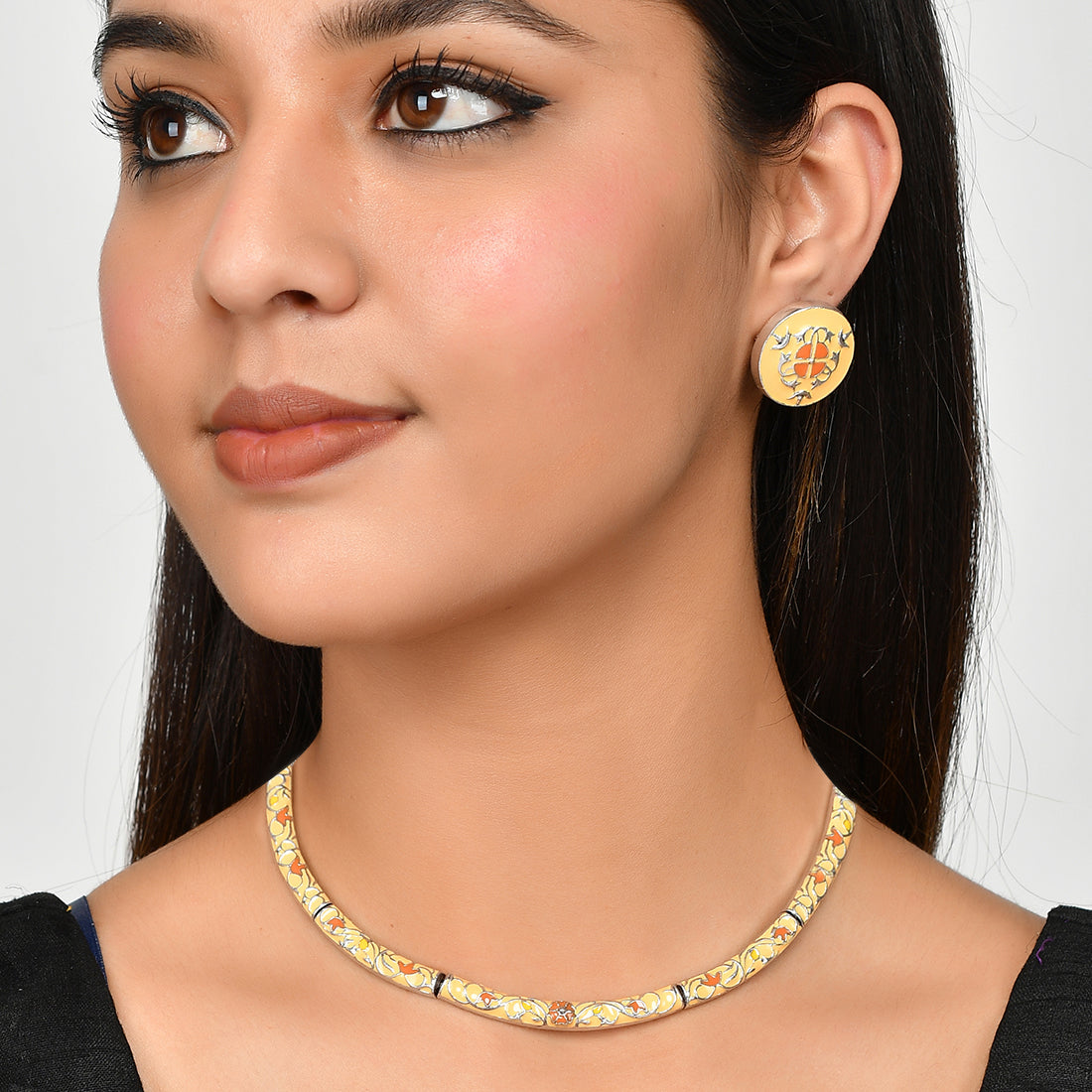 Enameled Elegance Yellow Floral Gold-Plated Necklace Set