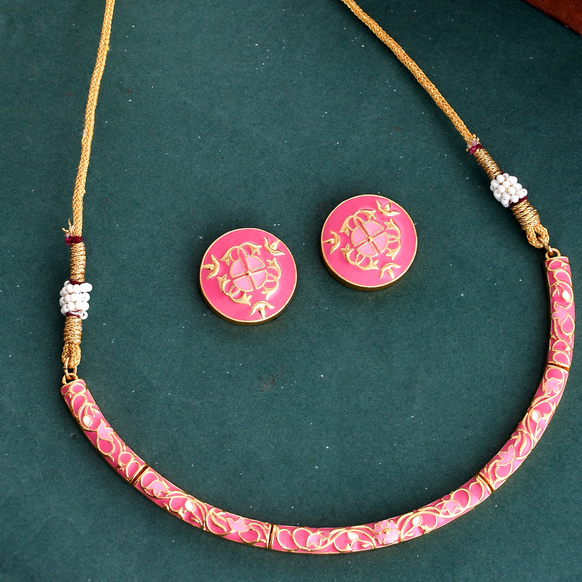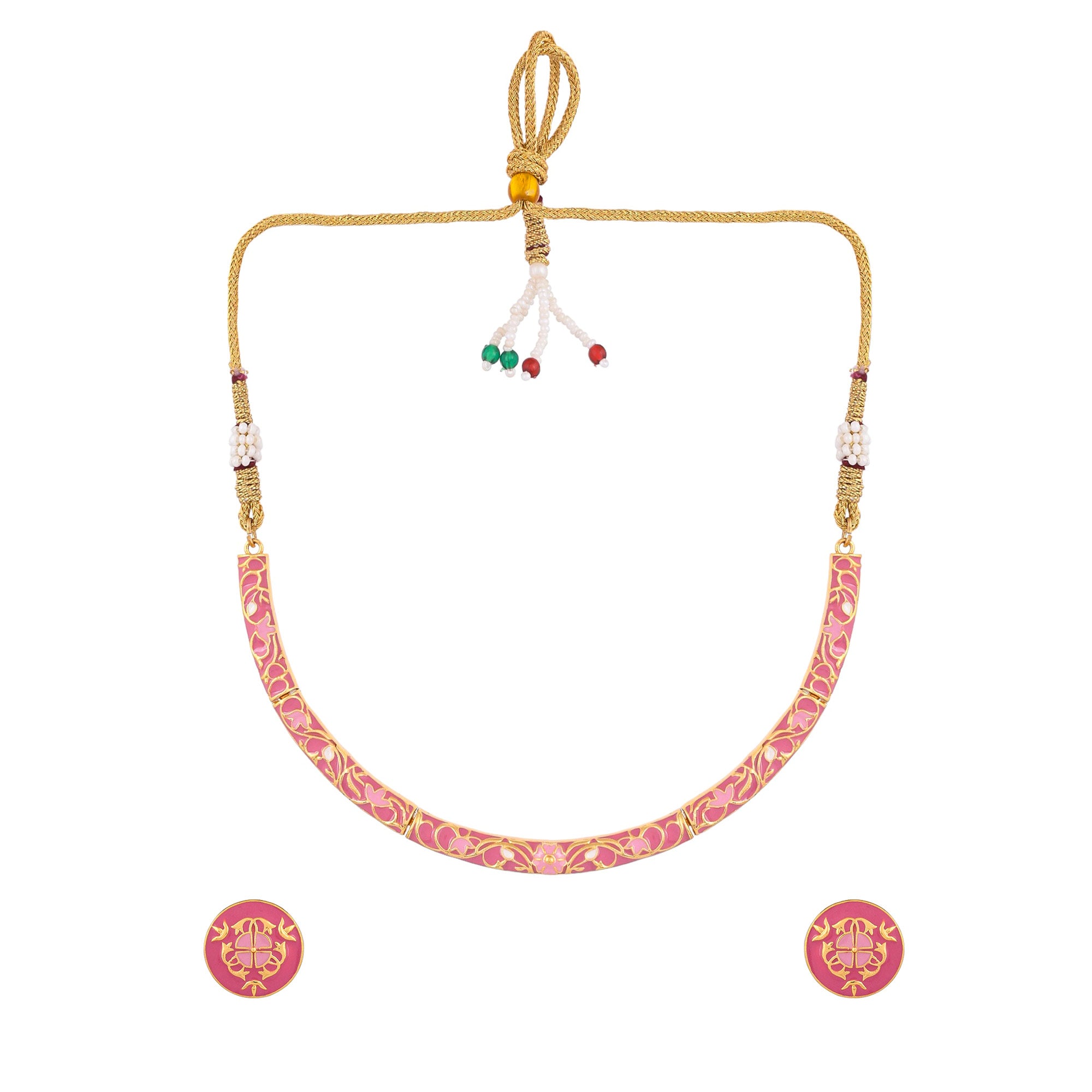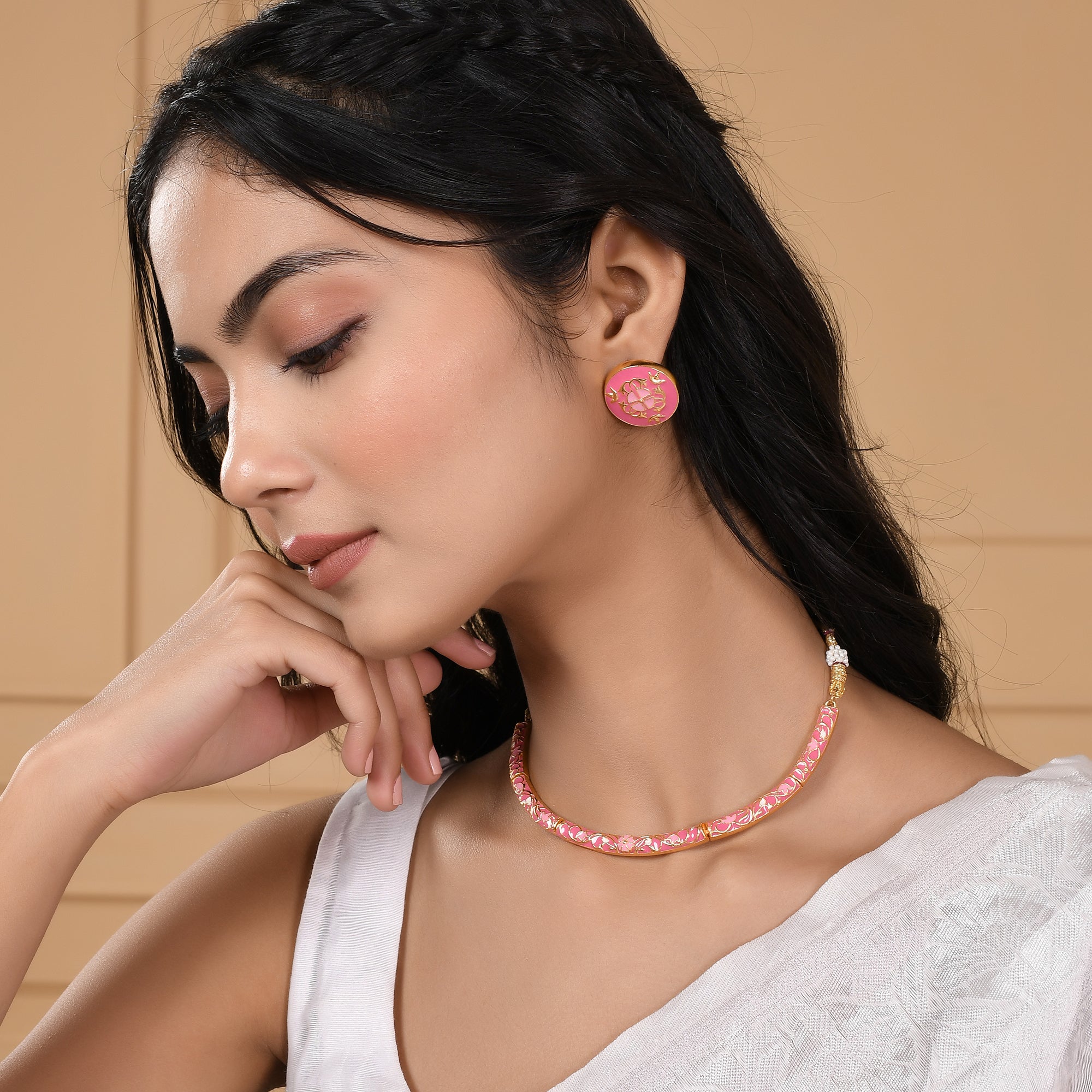 Brass jewellery set embellished with lovely pink enamel details. The choker and stud earrings have been given a luxurious gold plating. Pair with traditional and Indo-Western looks.