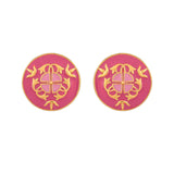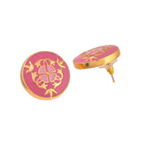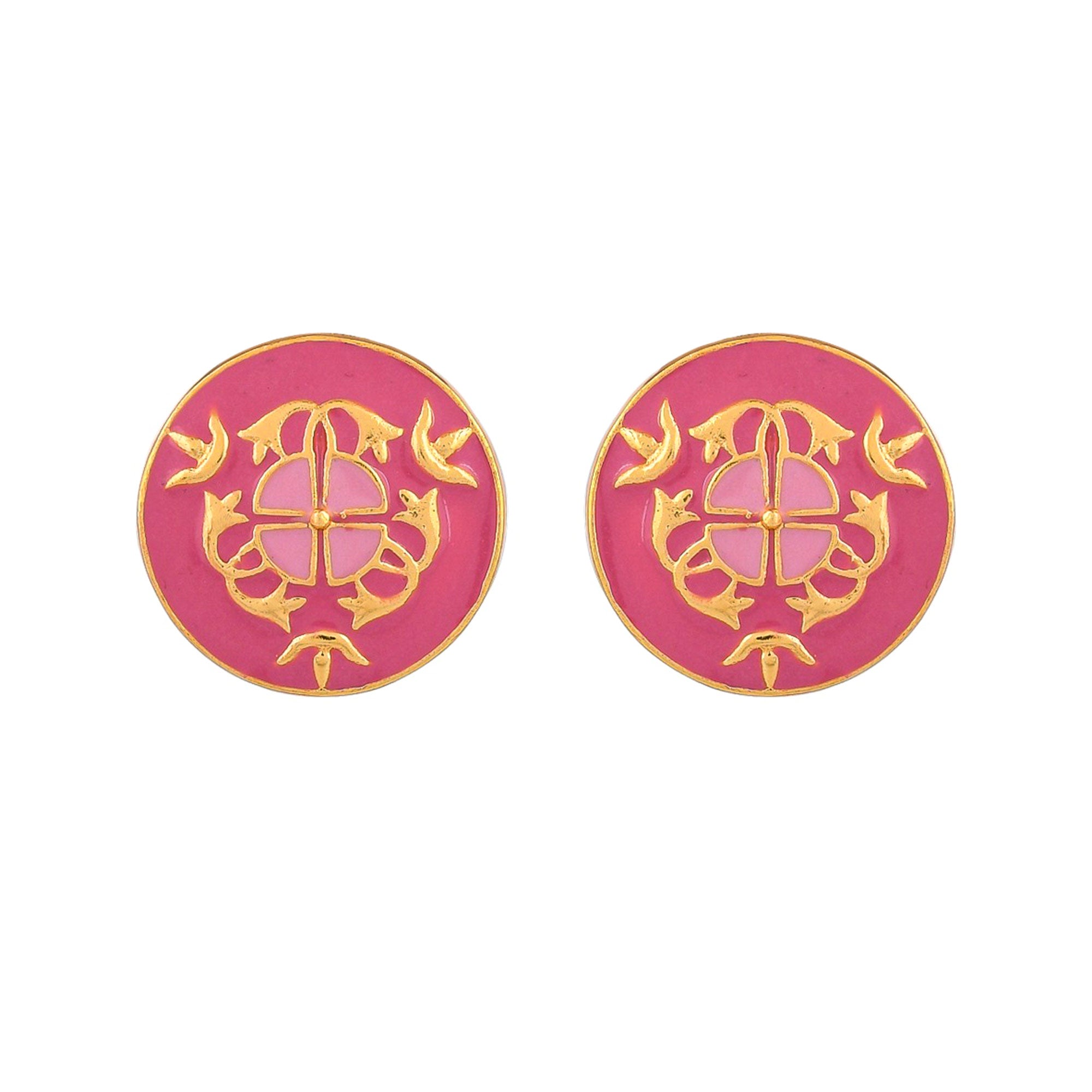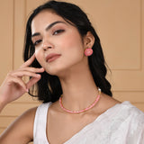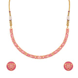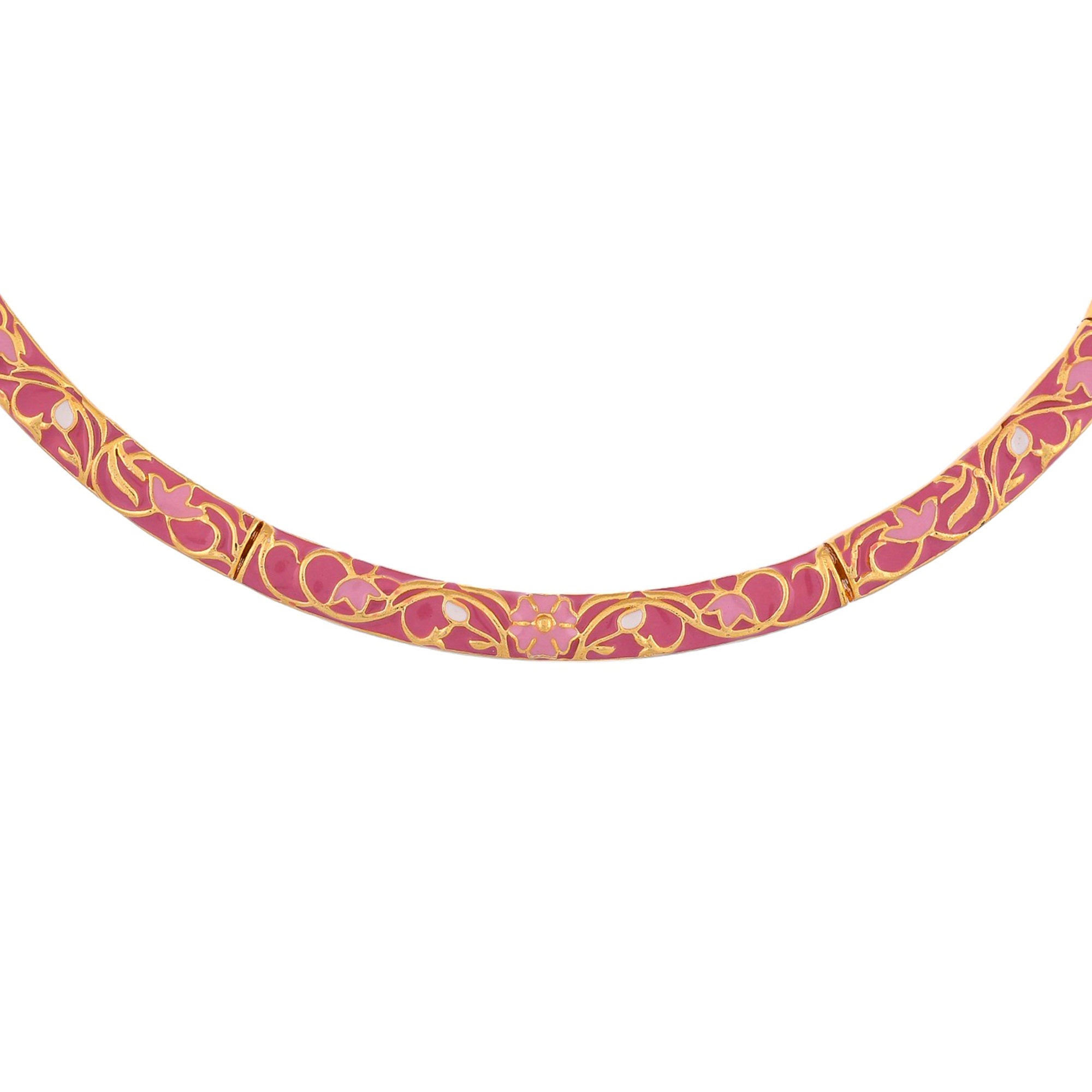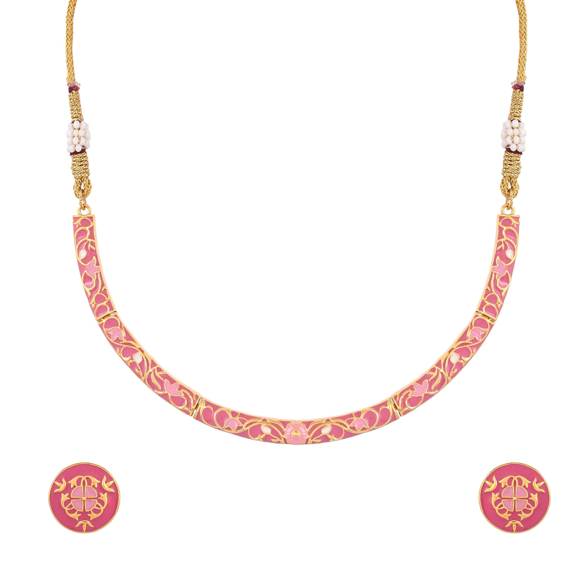 Brass jewellery set embellished with lovely pink enamel details. The choker and stud earrings have been given a luxurious gold plating. Pair with traditional and Indo-Western looks.