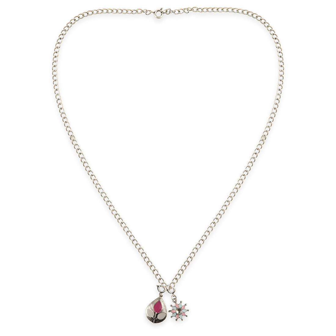 Spice up your casuals by accessorizing with this trendy pendant necklace. This brass piece features beautiful enameled teardrop and floral charms in the dual coating. Plus, you can wear it as a face mask holder chain which will top off the look in a very stylish and noticeable way.