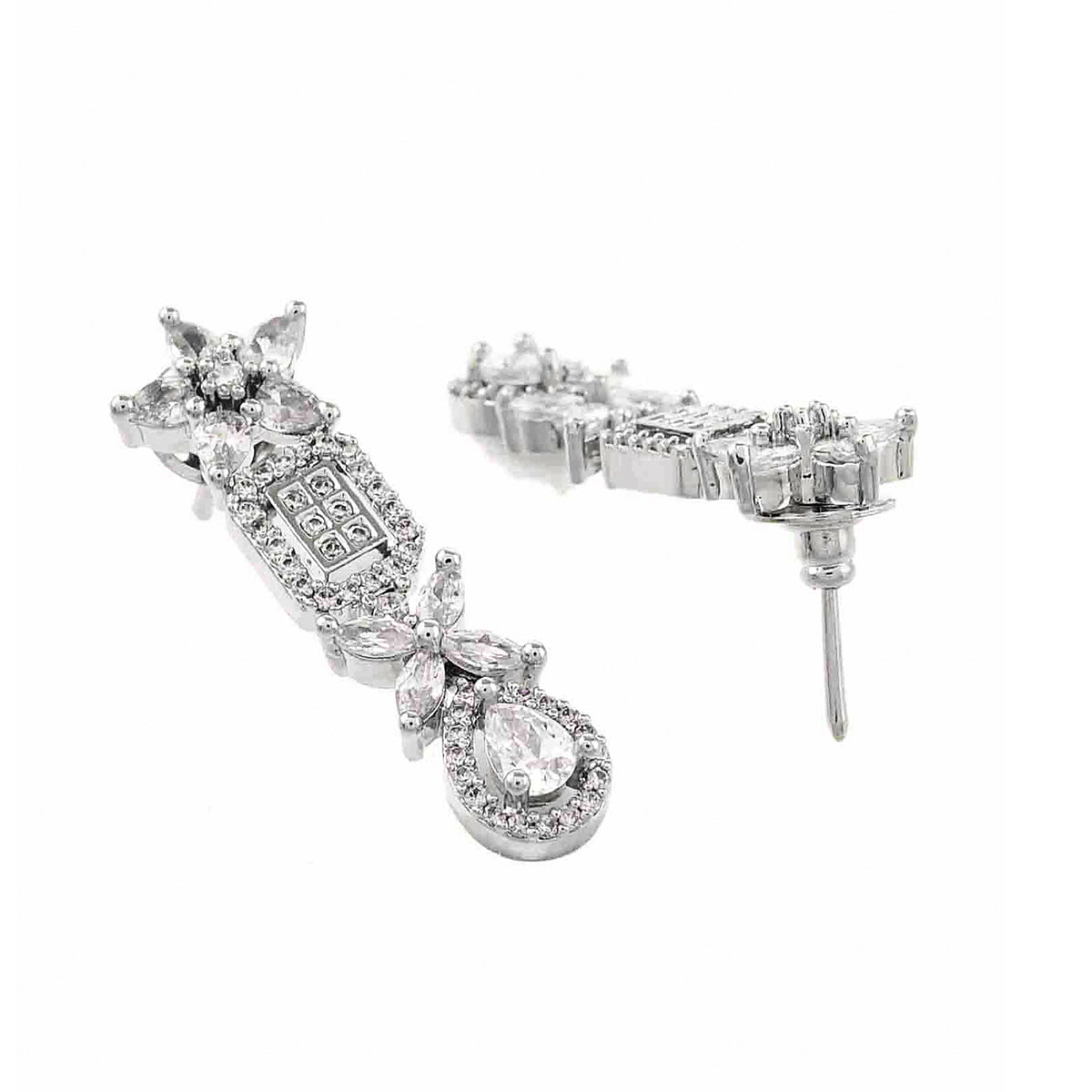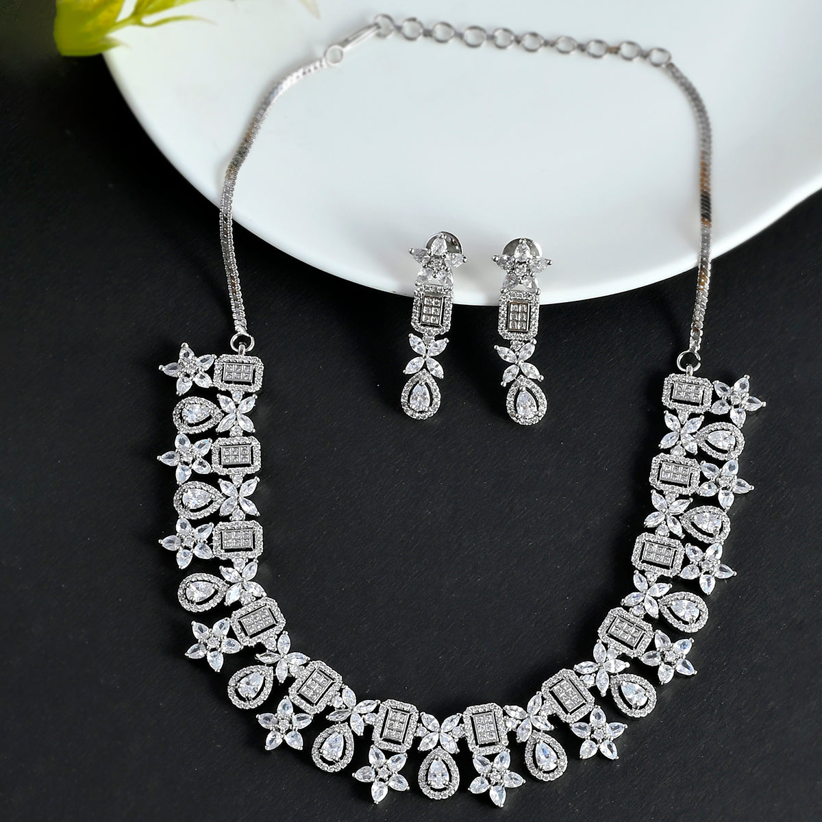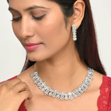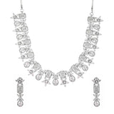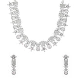 Zirconia gemstones in floral and cluster settings embellished brass jewellery set with a classic silver plating. The glamourous set can be paired with designer sarees as well as cocktail gowns.