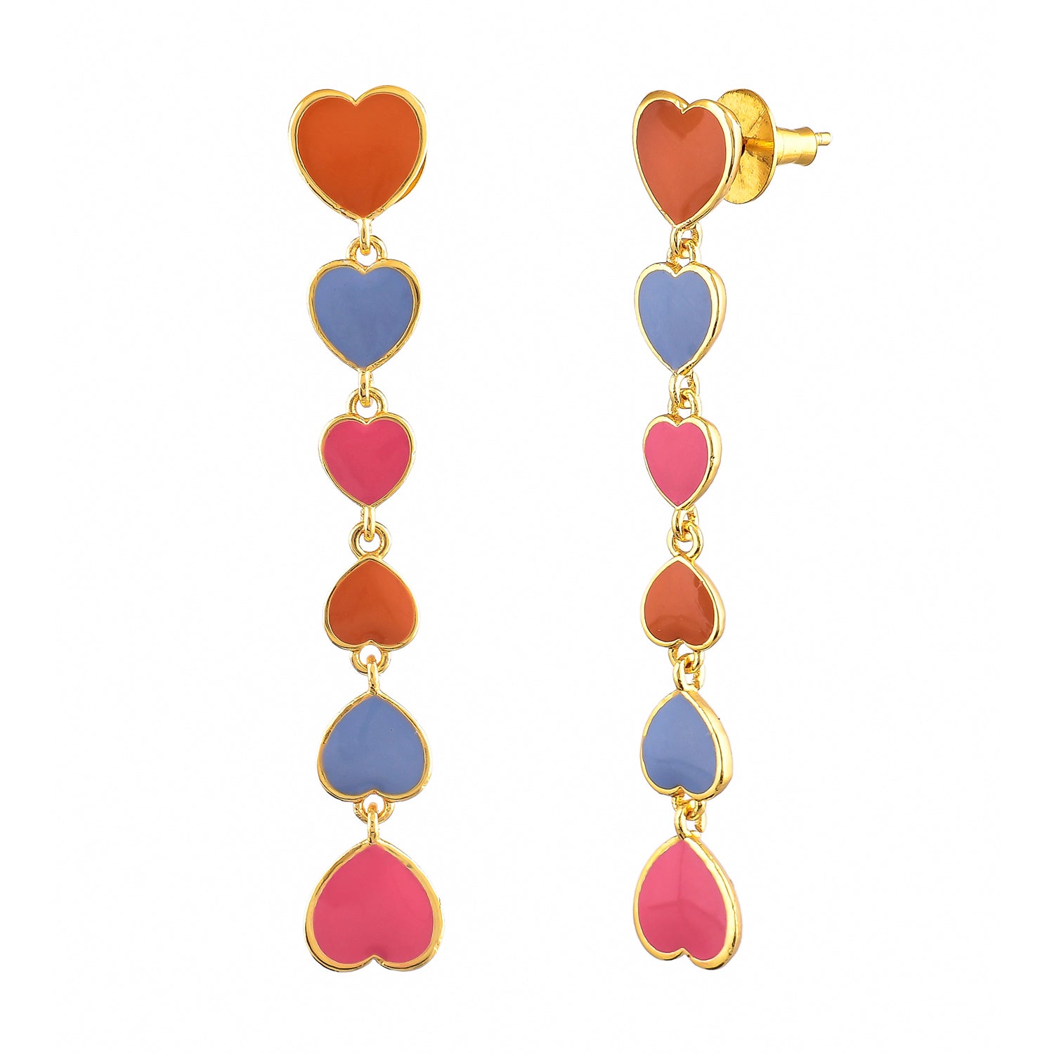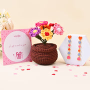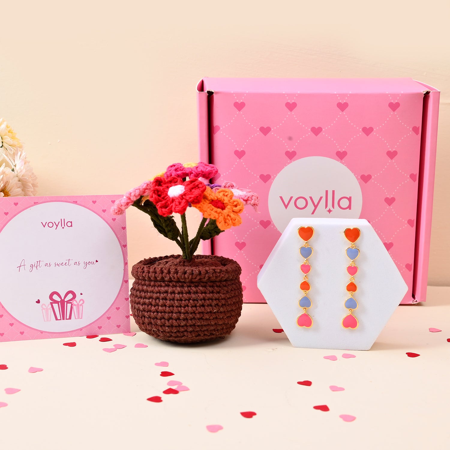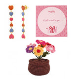 Celebrate special moments with the Endless Love Valentine Hamper from Voylla. This thoughtfully curated collection features elegant enamelled brass earrings, a charming crocheted flower pot with colorful flowers, and a heartfelt greeting card with the message, "A gift as sweet as you." The high-quality Stone Earrings, crafted from brass and coated with vibrant enamel, showcase five heart-shaped segments in alternating shades of orange, blue, and pink, perfect for party wear or festive occasions. The handcrafted crocheted flower pot adds a touch of handmade charm with its colorful flowers. The beautifully designed card completes this perfect gifting experience.