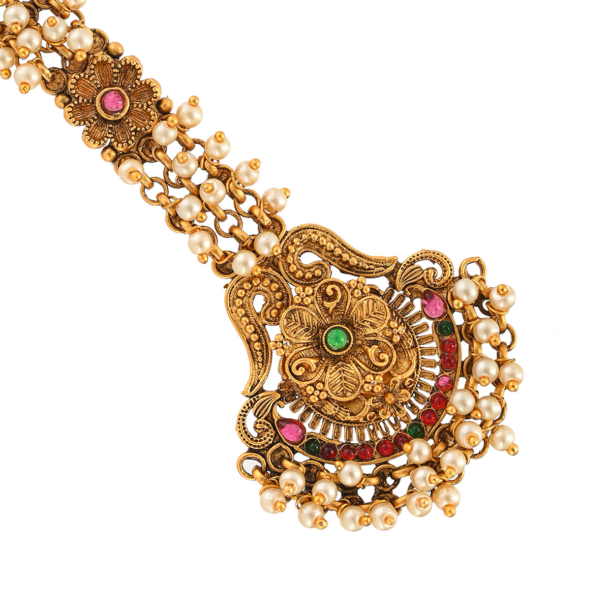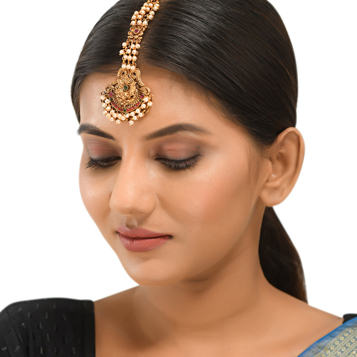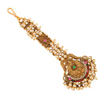 Ethnic Faux Pearls Adorned Brass Gold Toned Maang Tika