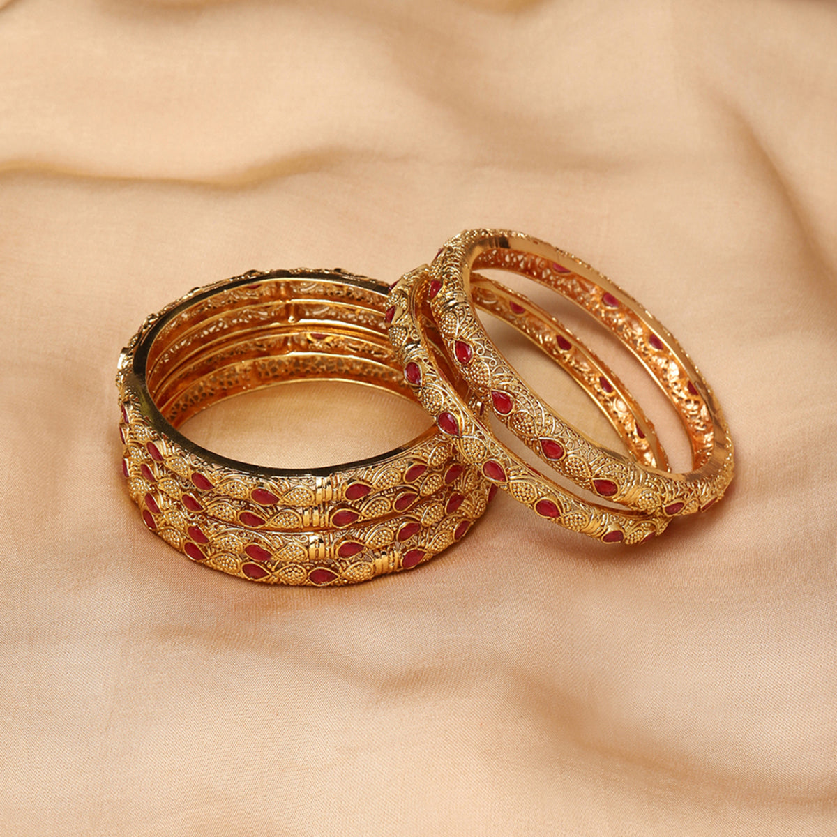 Wedding Season is right around the corner to treat yourself with our ruby gold bracelets. Their minimalistic beauty will stand you out amongst all. It can be styled with all your traditional collections. The pattern is lightweight to comfort your wrist. Go, grab them and dance your heart out.