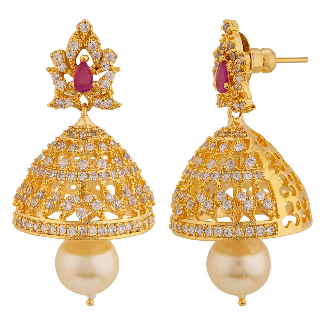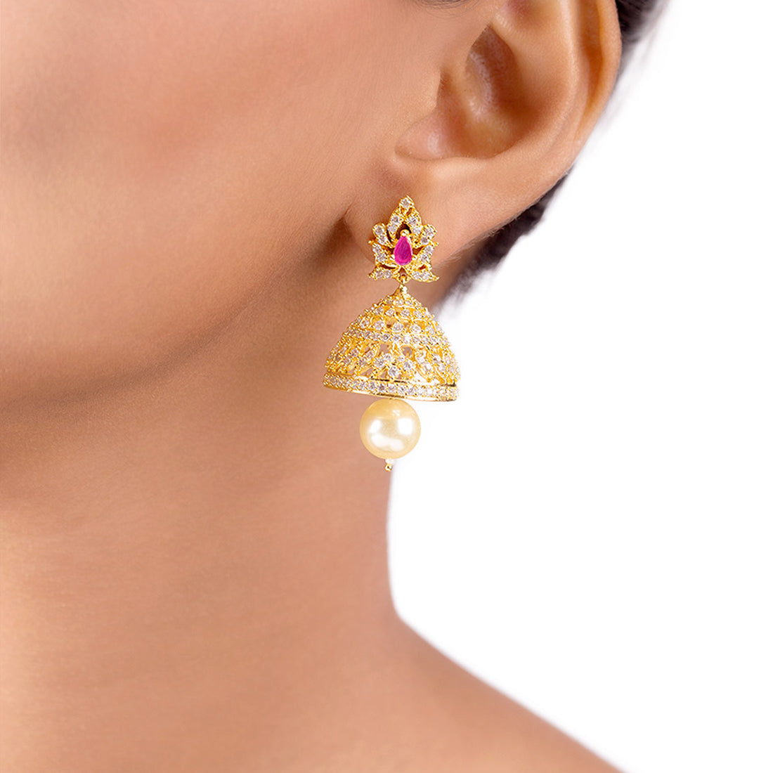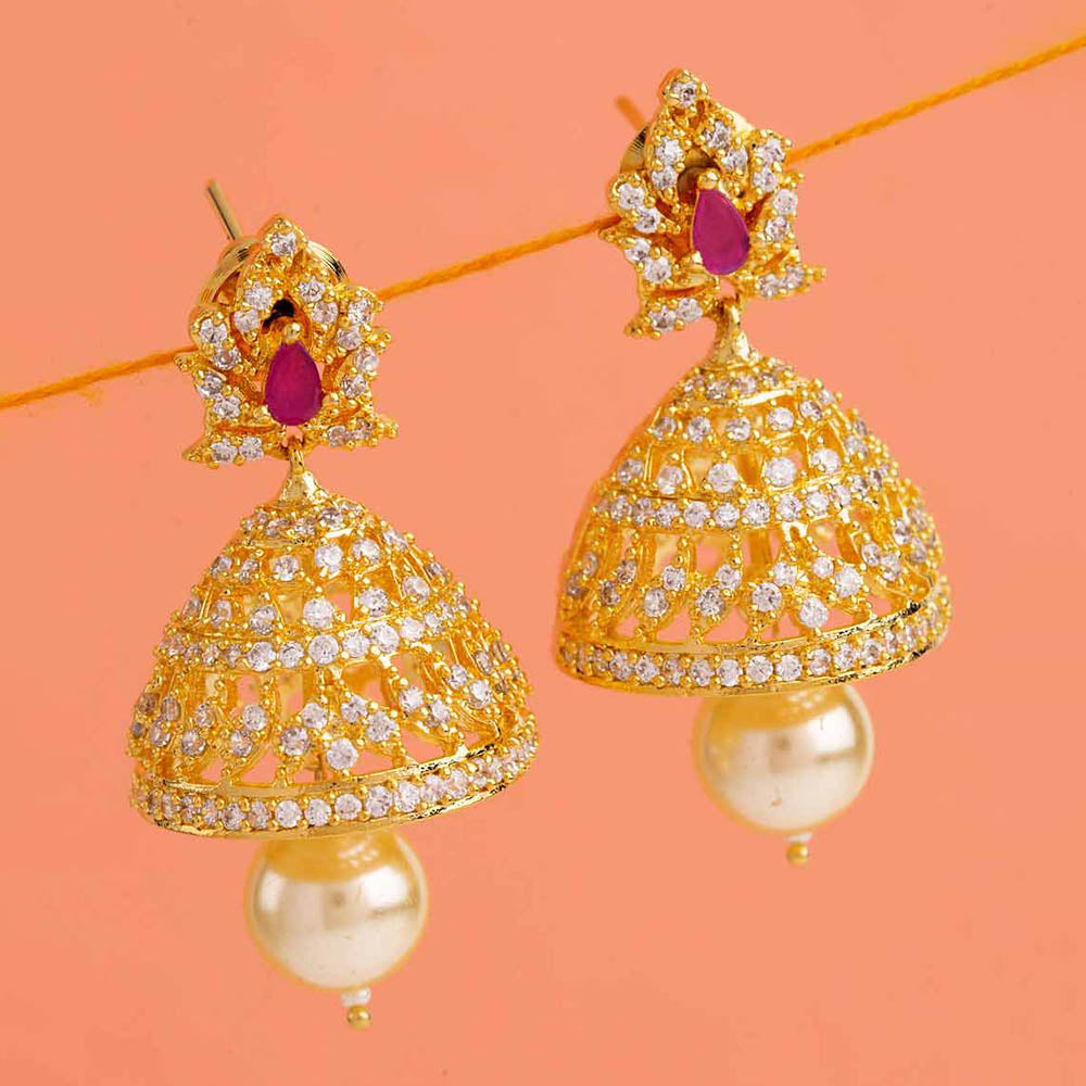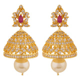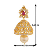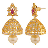 Ethnic style brass jhumka earrings embellished with gems. Yellow gold plated and good for casual wear.