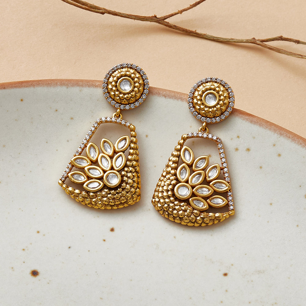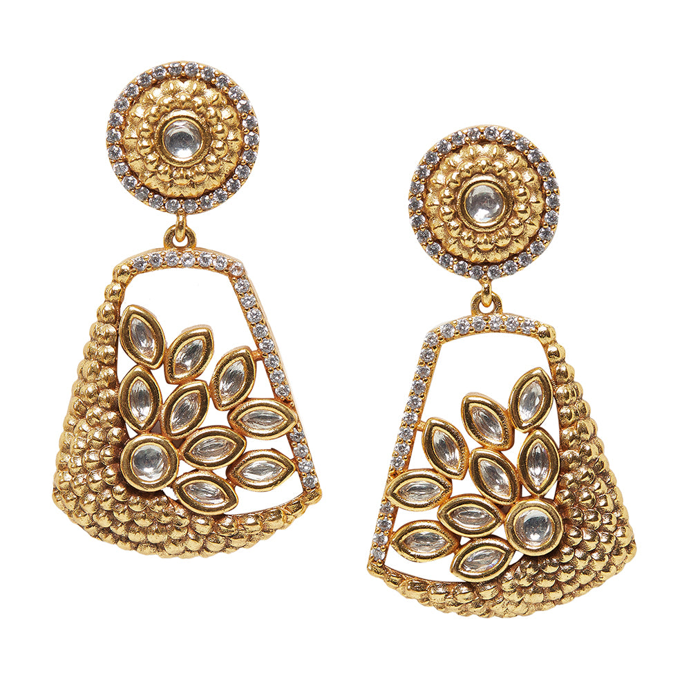 Brass drop earrings, fashioned into an ethnic design and yellow gold plated. Embellished with faux kundan gems and pearls, the pair will look splendid when matched with Indian and Indo-Western outfits.