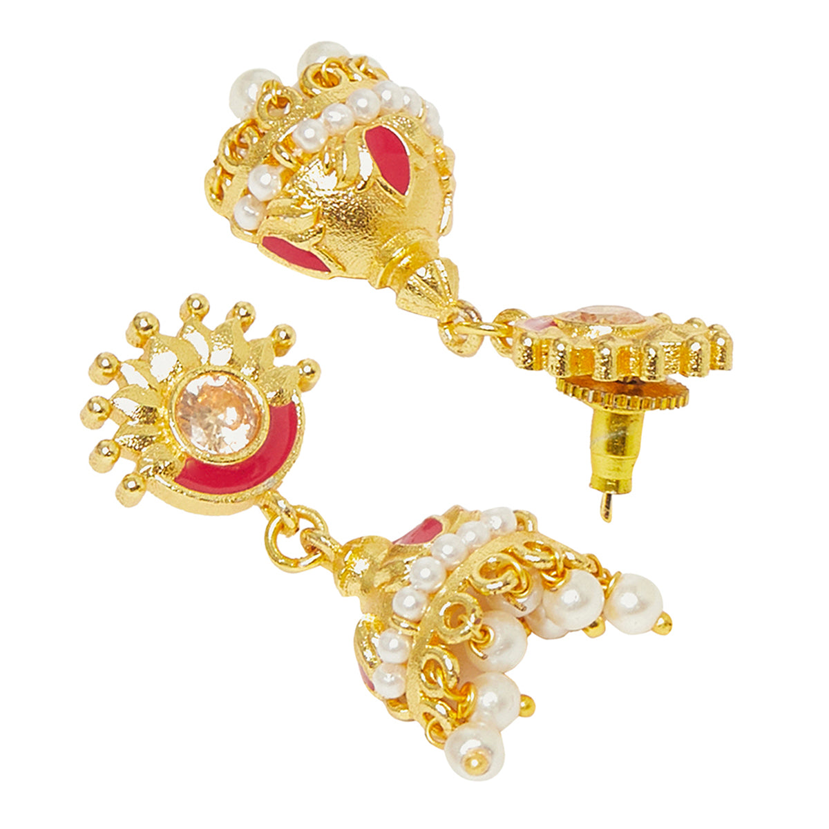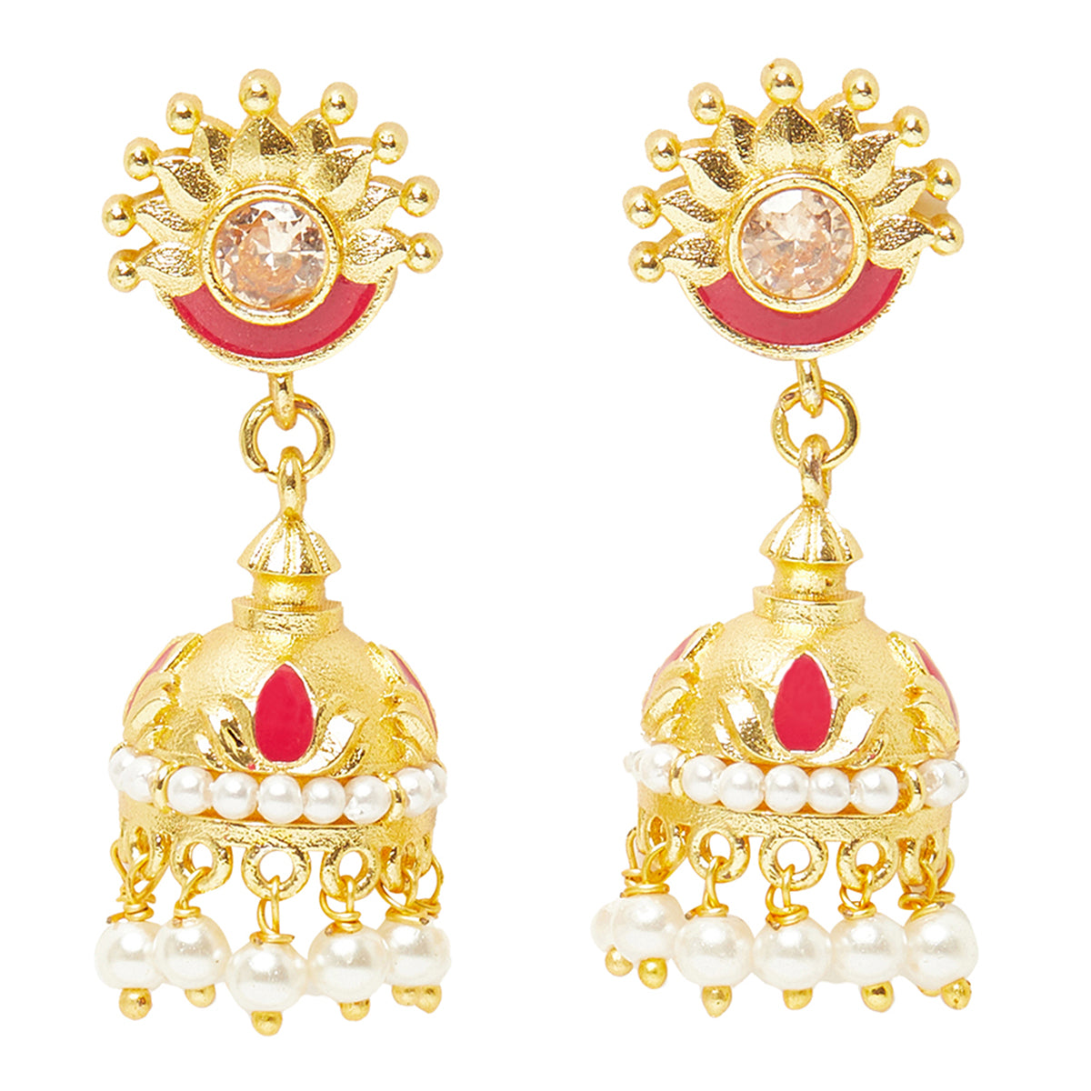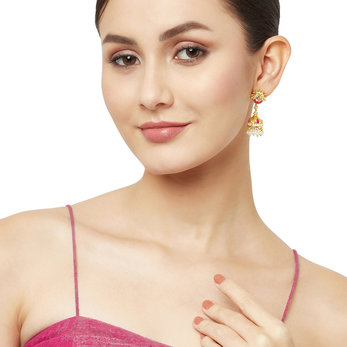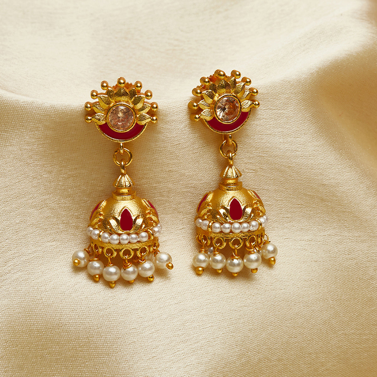 Inspired by ethnic jewellery pieces, these gold plated earrings have been crafted into a classic jhumka design. Brass has been used in the making of this faux pearls embellished pair. Wear these with a traditional silk saree to add a touch of glitter to the look.