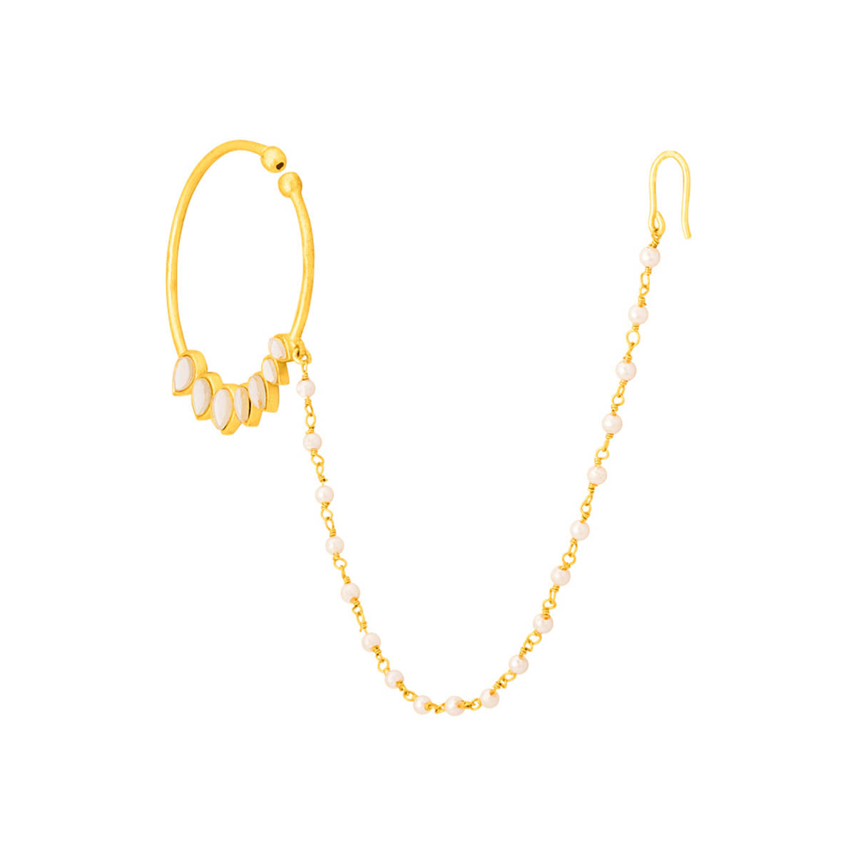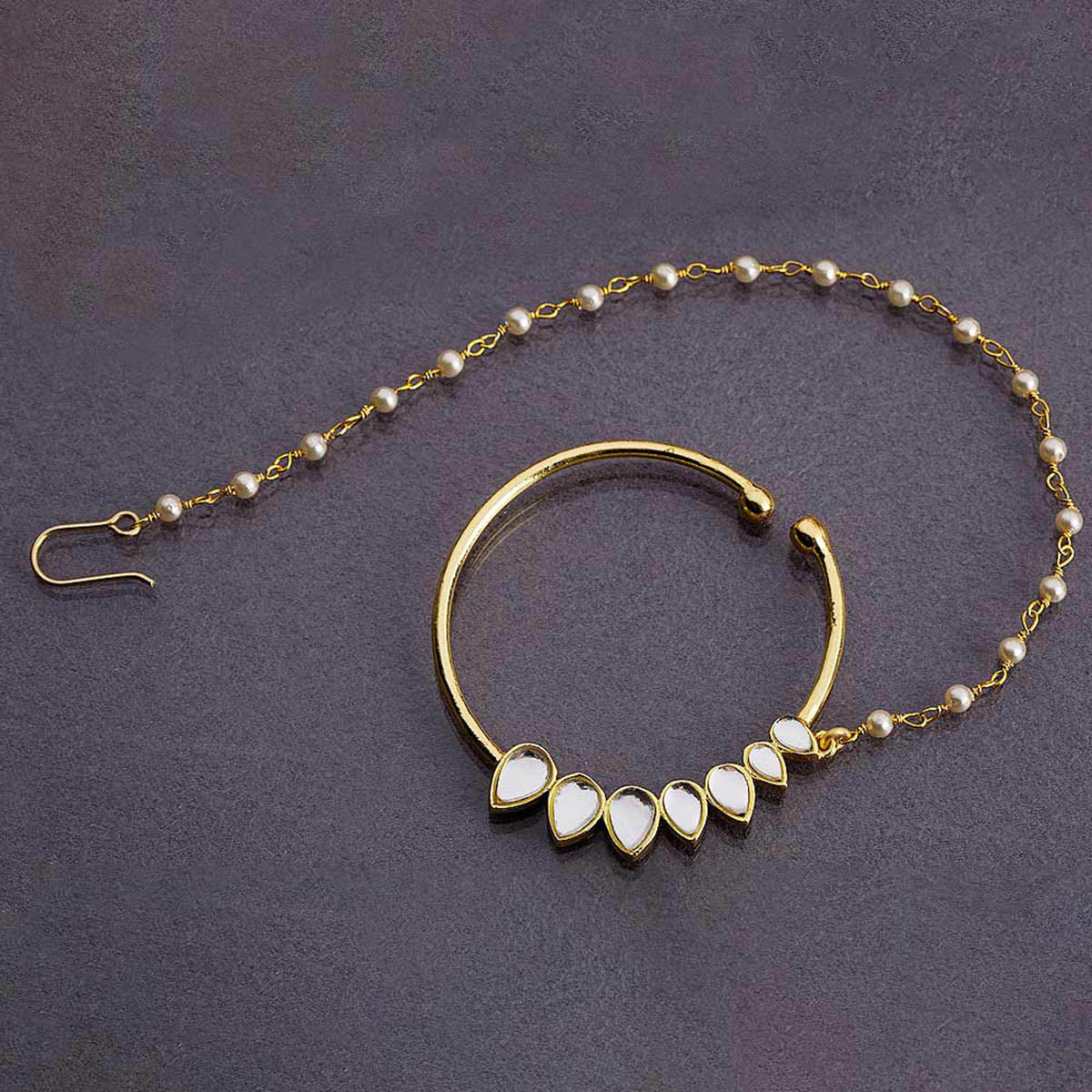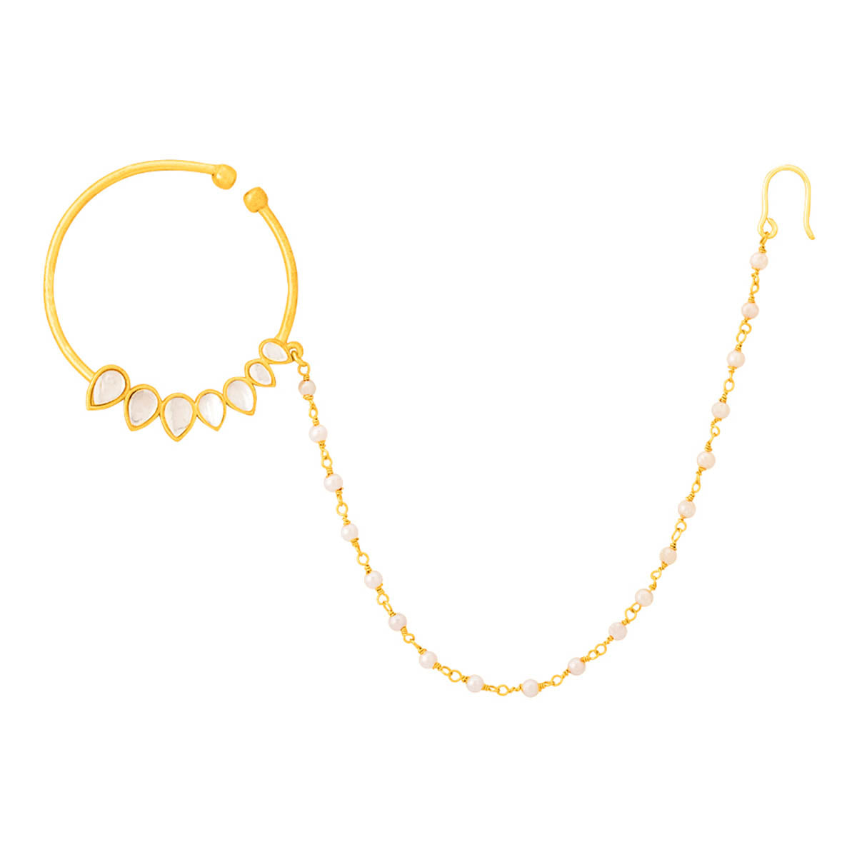 Crafted into a timeless, ethnic design, this beautiful nath boasts flawless design execution and a perfect finish. Kundan and pearl embellishments add to the charm of this breathtakingly beautiful piece, which has been fashioned out of brass and made absolutely brilliant with a striking yellow gold plating. The non-piercing nose ring will match all your Indian and Indo-Western looks.