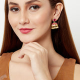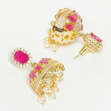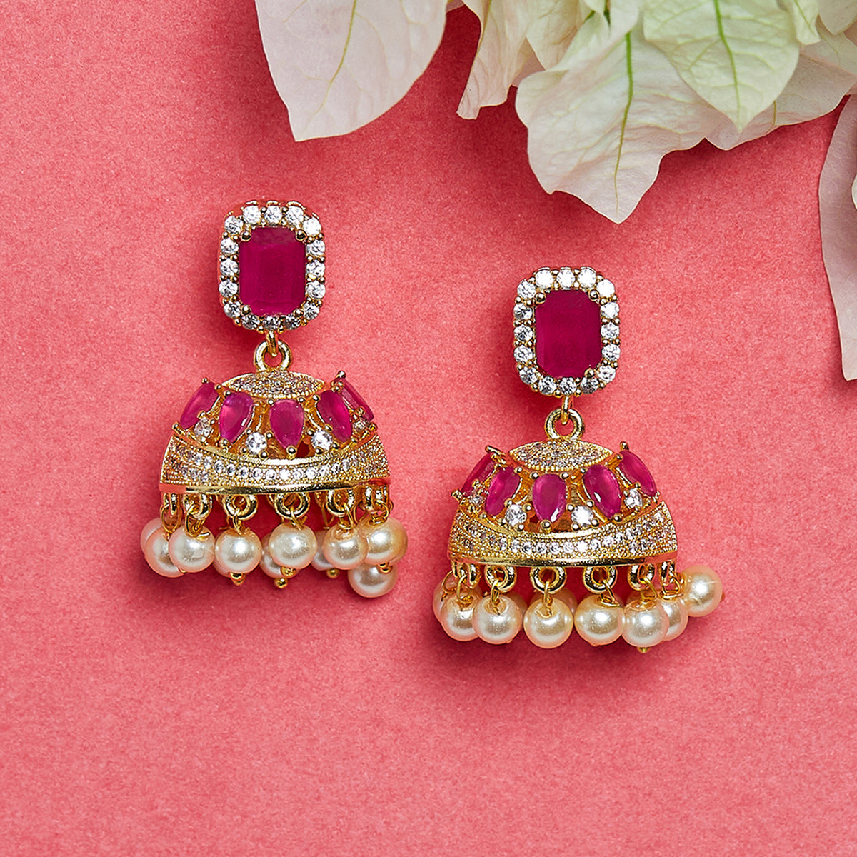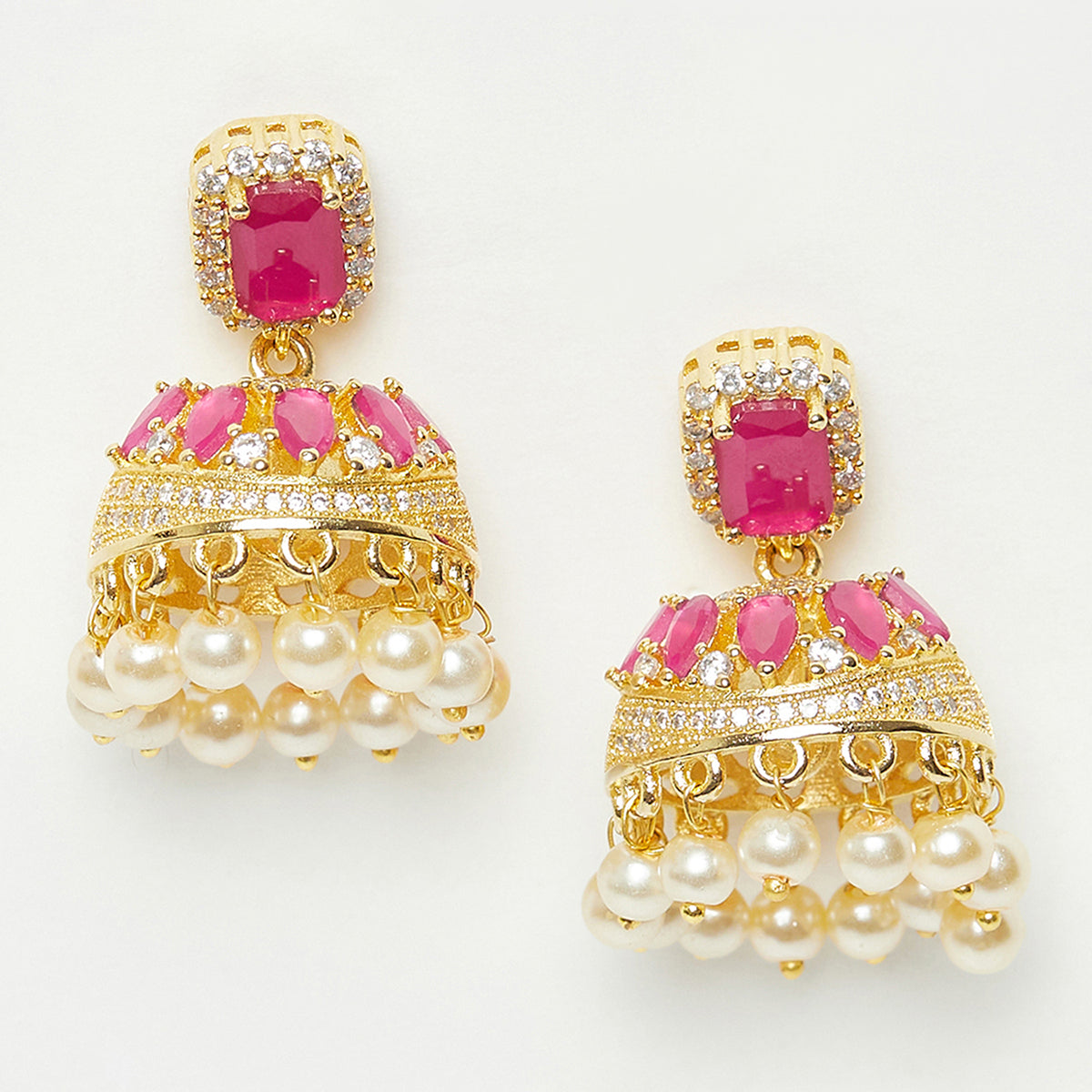 Yellow gold plated brass jhumka earrings embellished with faux pearls and pink stone. Pair with a silk saree.