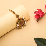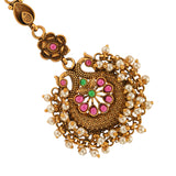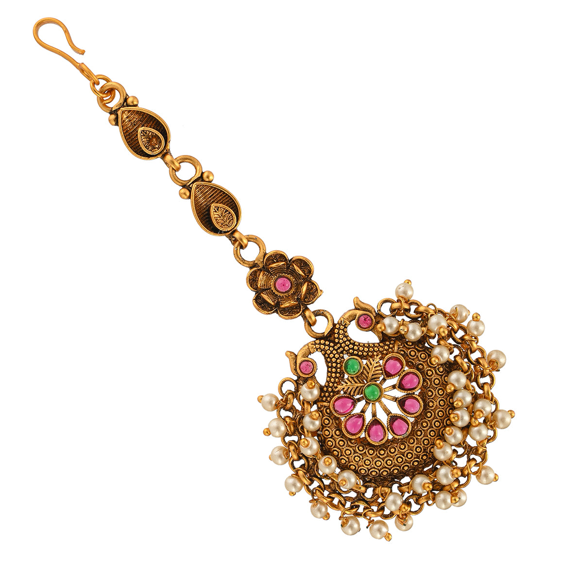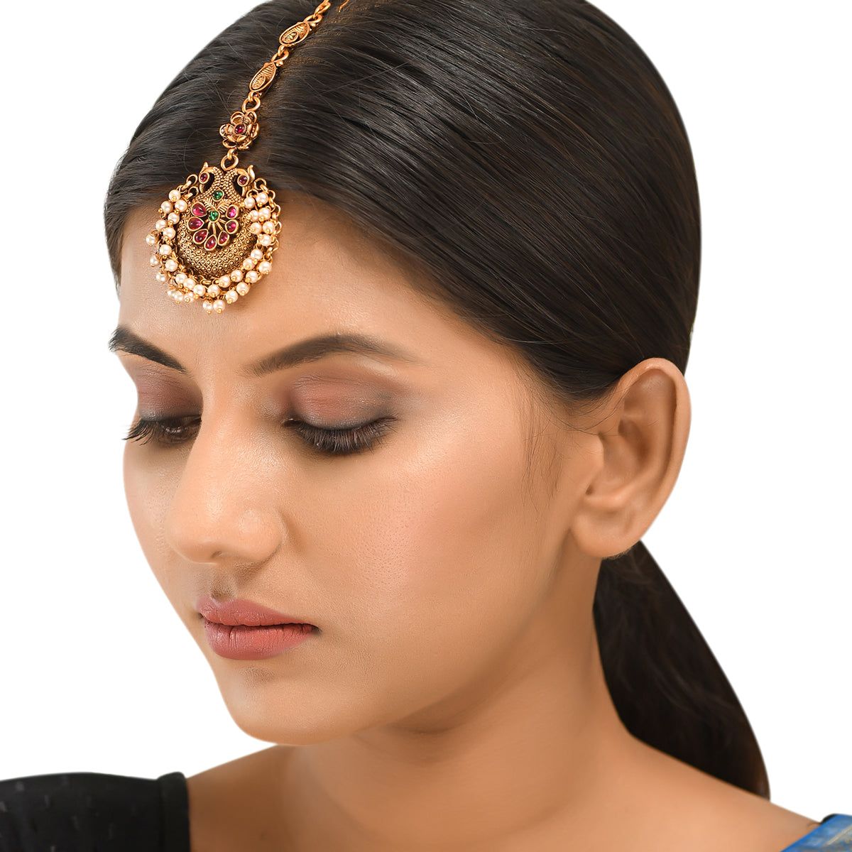 Ethnic Temple Design Faux Pearls Gold Plated Brass Maang Tika