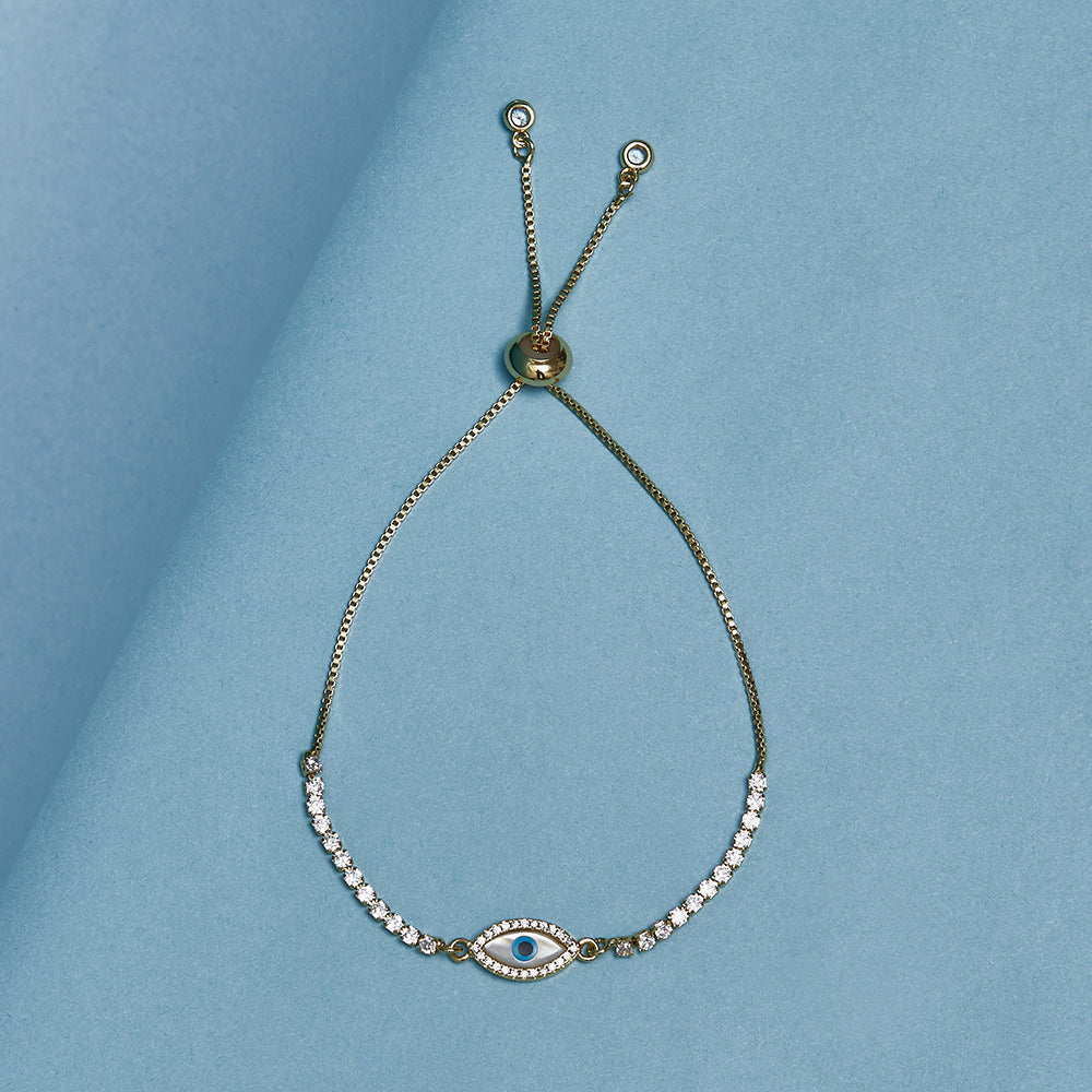 Round cut zircon gemstones adorned evil eye charm bracelet in a classic slip-on design. Brass has been used in the making of this yellow gold plated piece, which is li=lightweight and versatile. Pair the bracelet with your everyday looks.