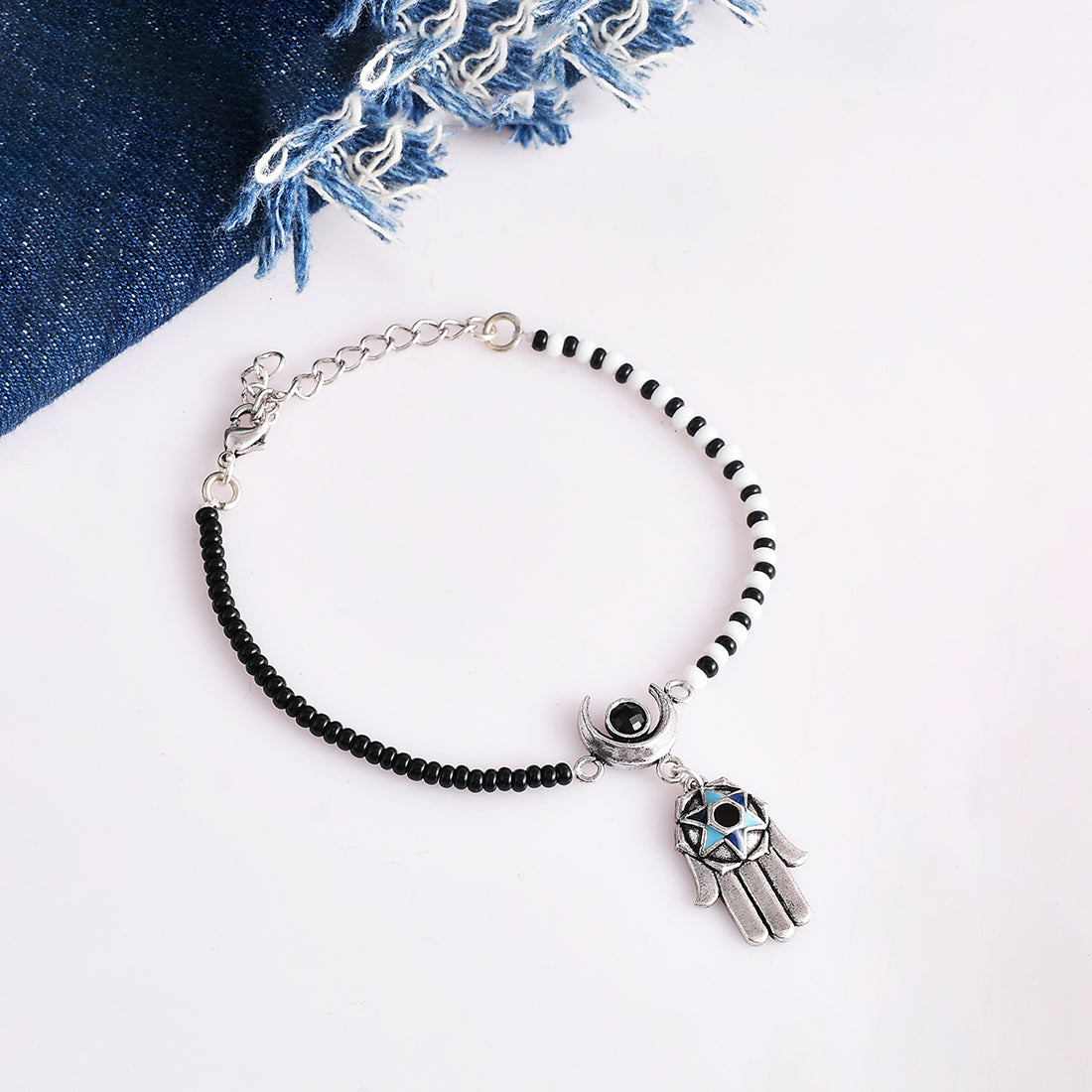 This stunning bracelet boasts a mesmerizing silver-oxidized evil eye design engraved in a captivating circle, offering both style and protection. The addition of a charming Lord Shiva moon adds a touch of spirituality to the piece. With its two different chains, this bracelet is truly unique and perfect for any occasion. Embrace positive energy and style with this eye-catching and meaningful piece.