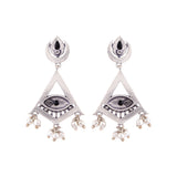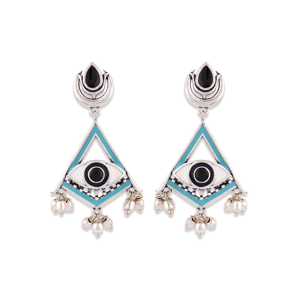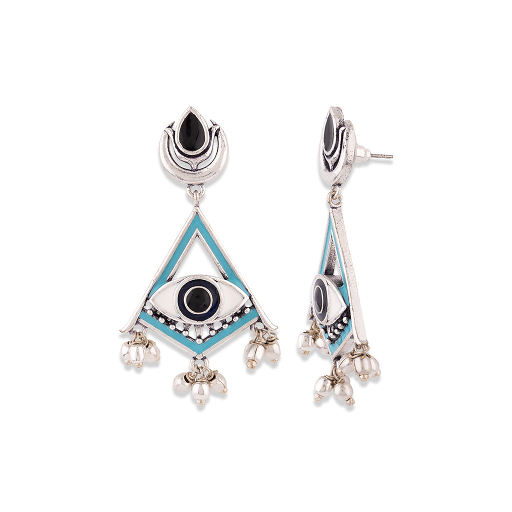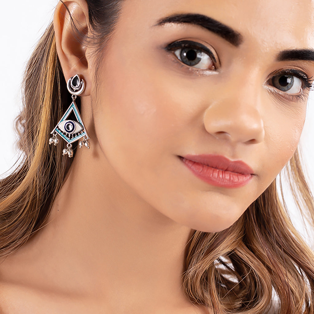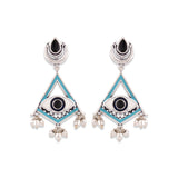 Aztec triangles motif earrings, made from brass and enameled. Oxidised silver plated and lightly embellished. Good for everyday wear.