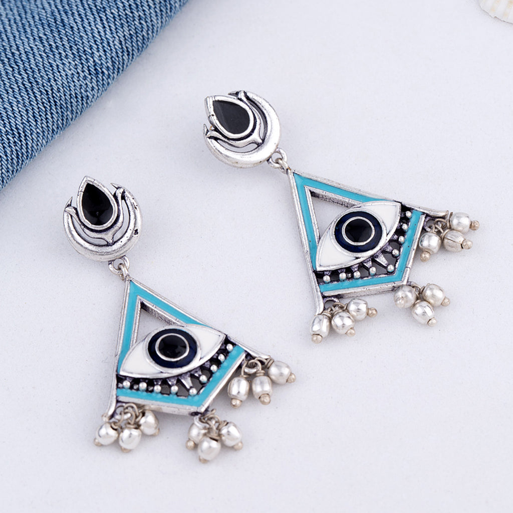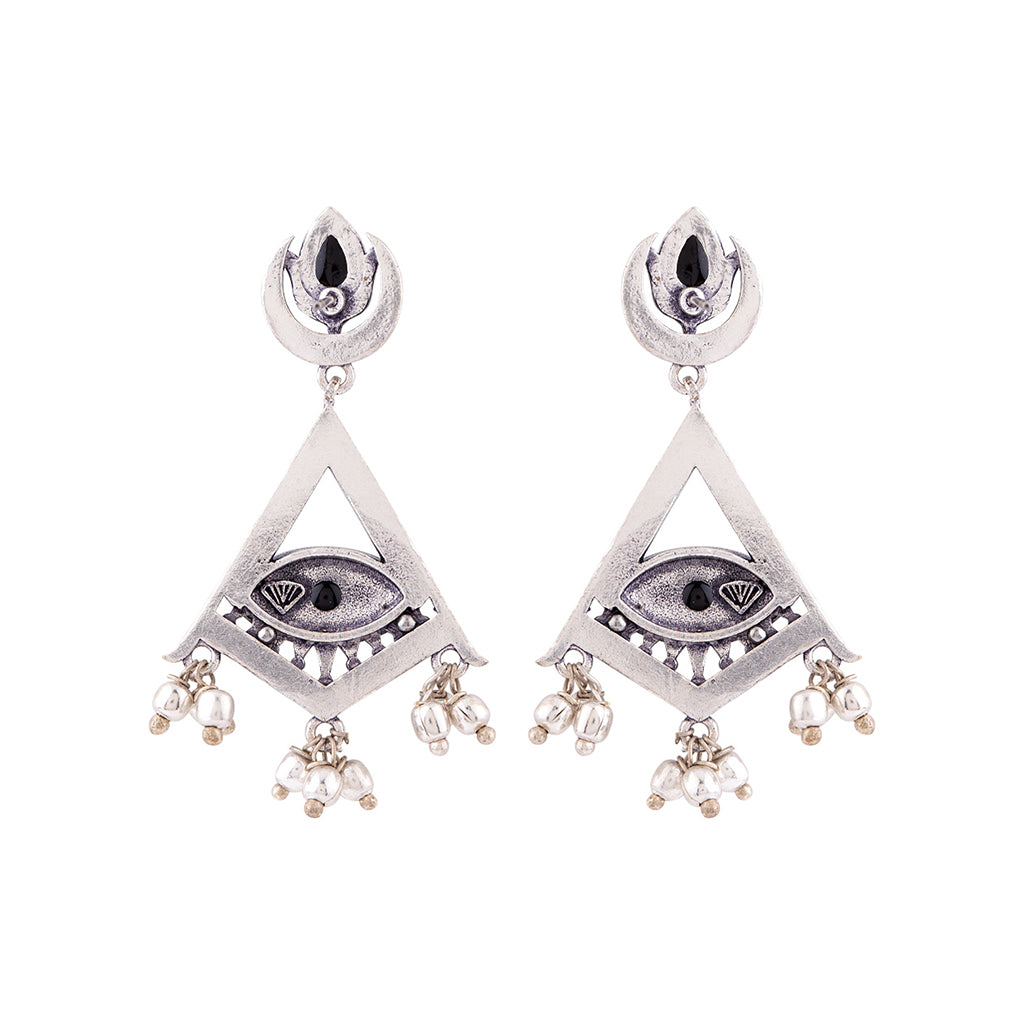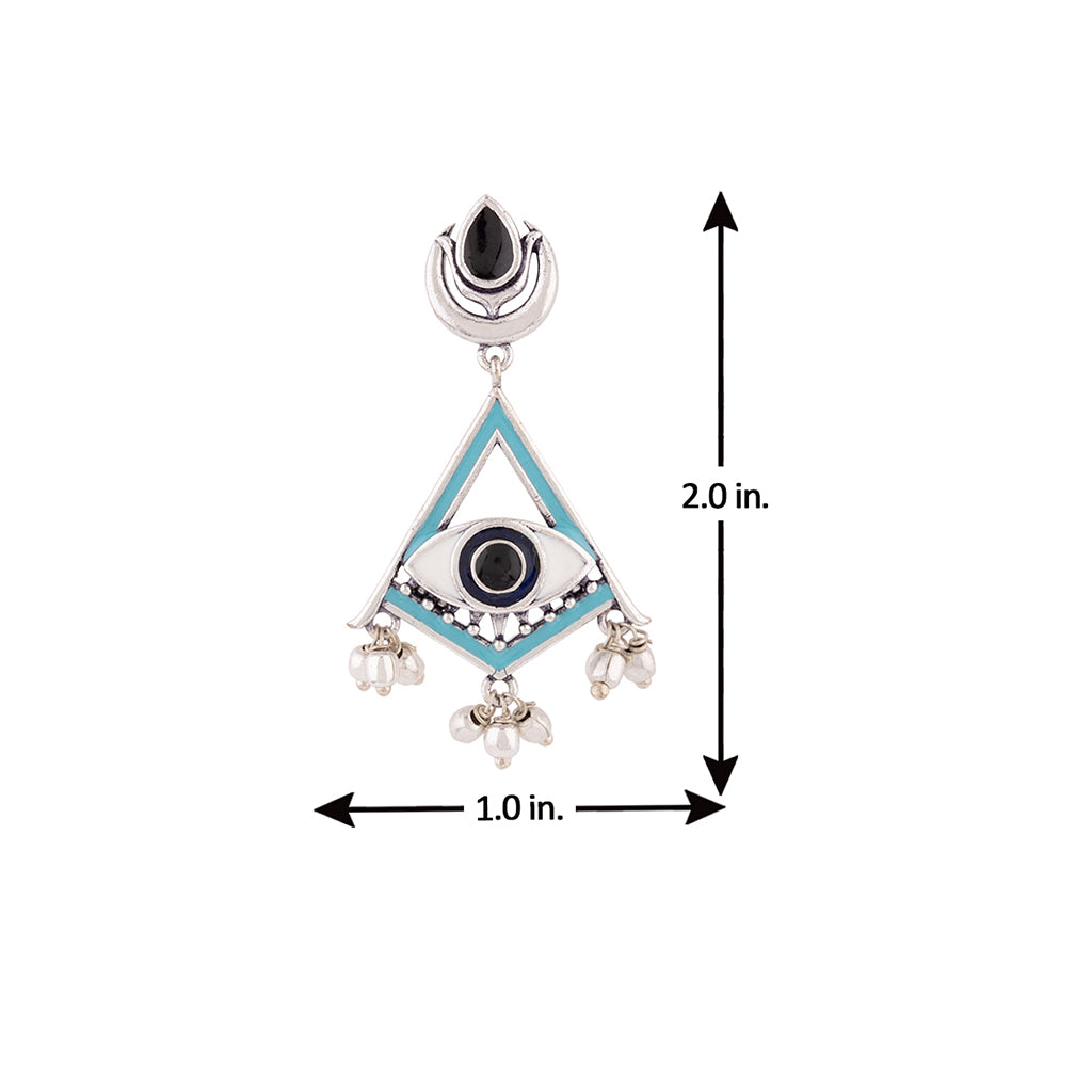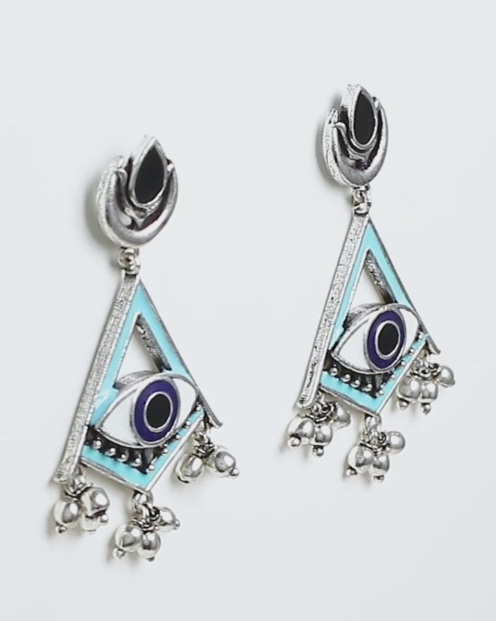 Aztec triangles motif earrings, made from brass and enameled. Oxidised silver plated and lightly embellished. Good for everyday wear.