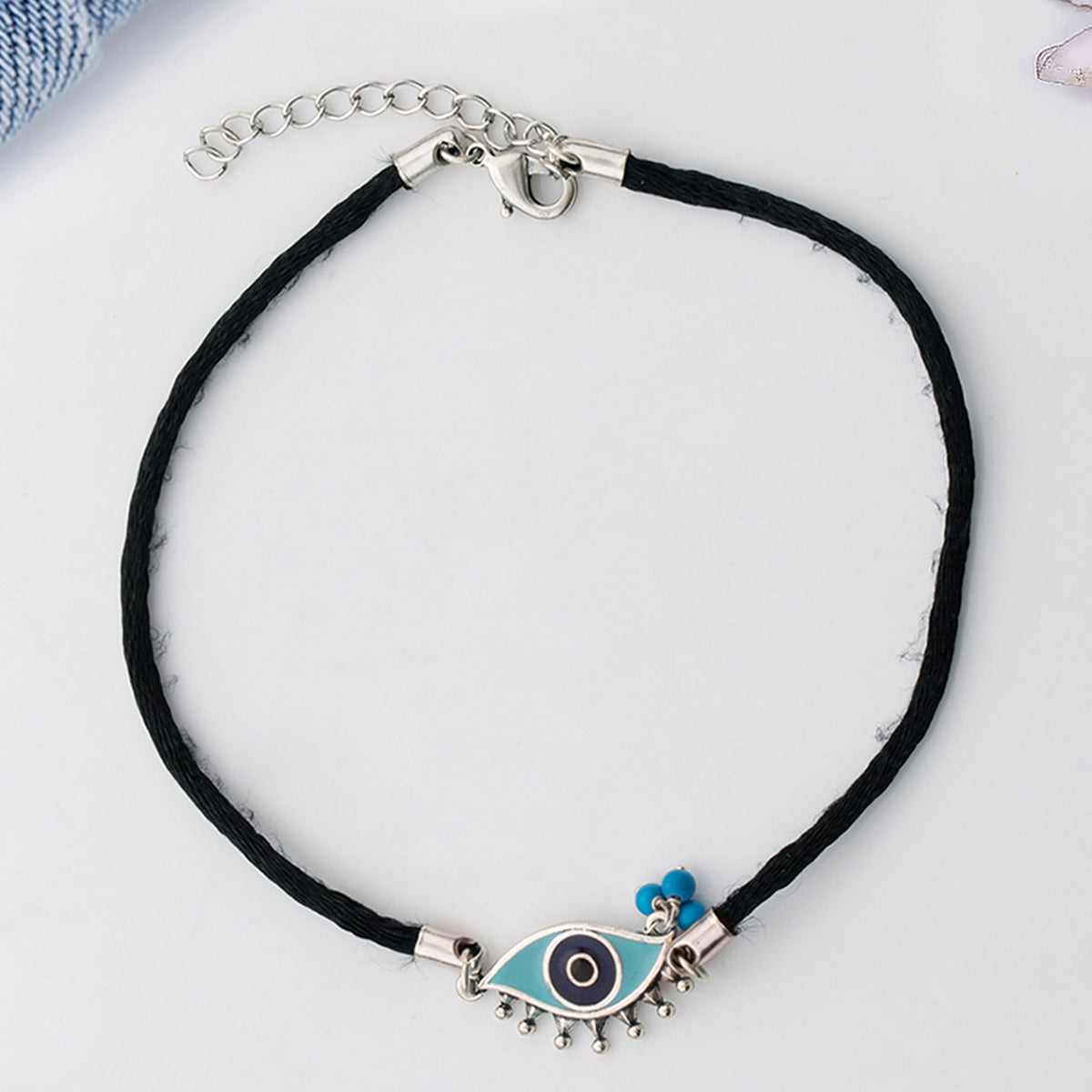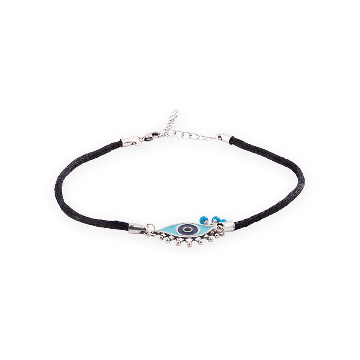 Enamelled eye motif anklet, fashioned out of brass and oxidised plated. Lightly embellished, the anklet can be paired with Indo-Western and Bohemian looks.