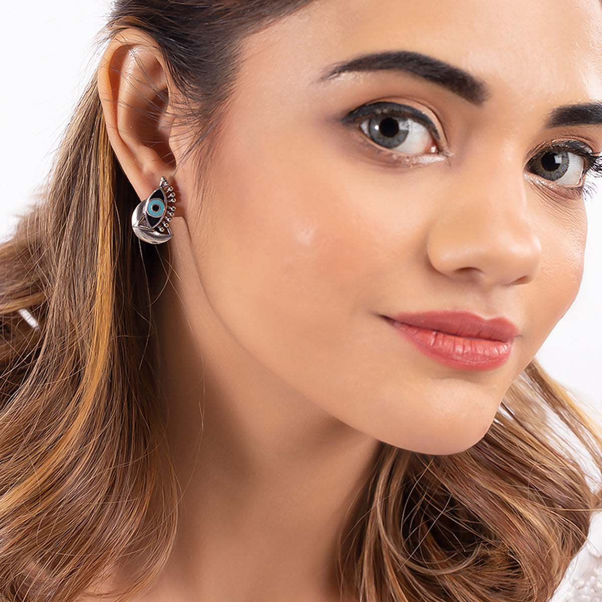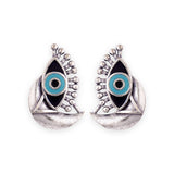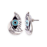 Brass eye motif earrings with light embellishments. Silver plated and enamelled, the earrings are lightweight, comfortable and versatile.