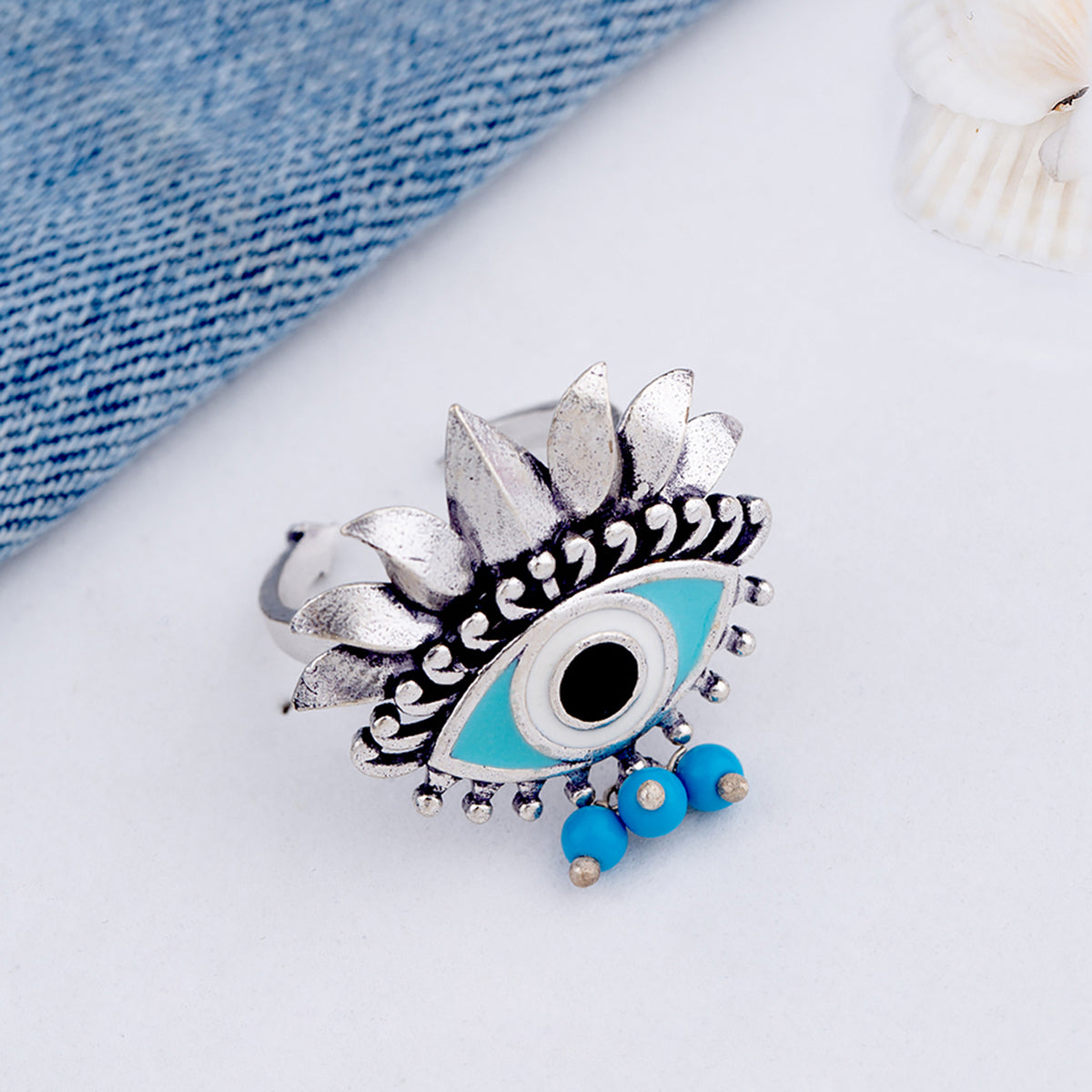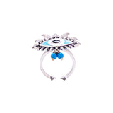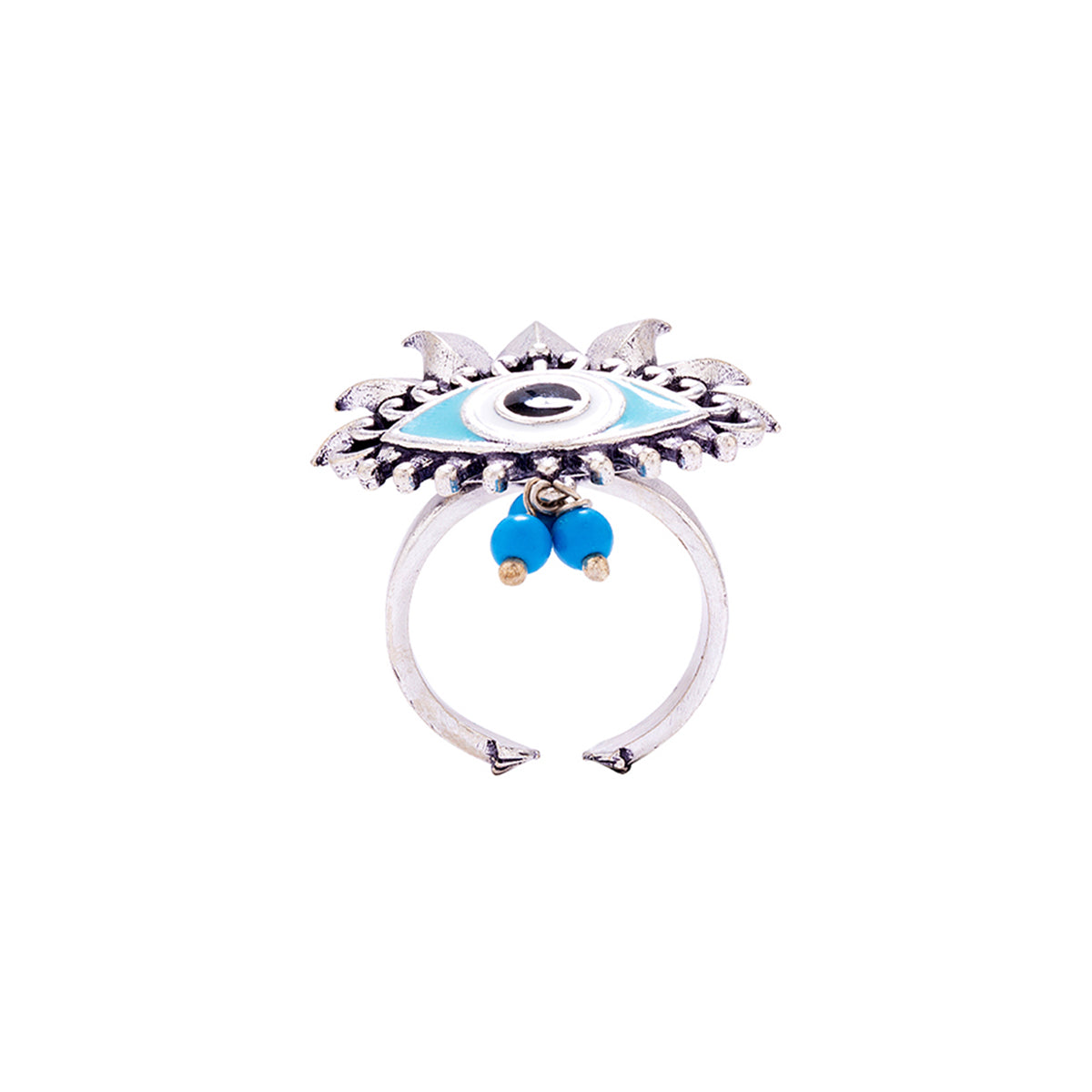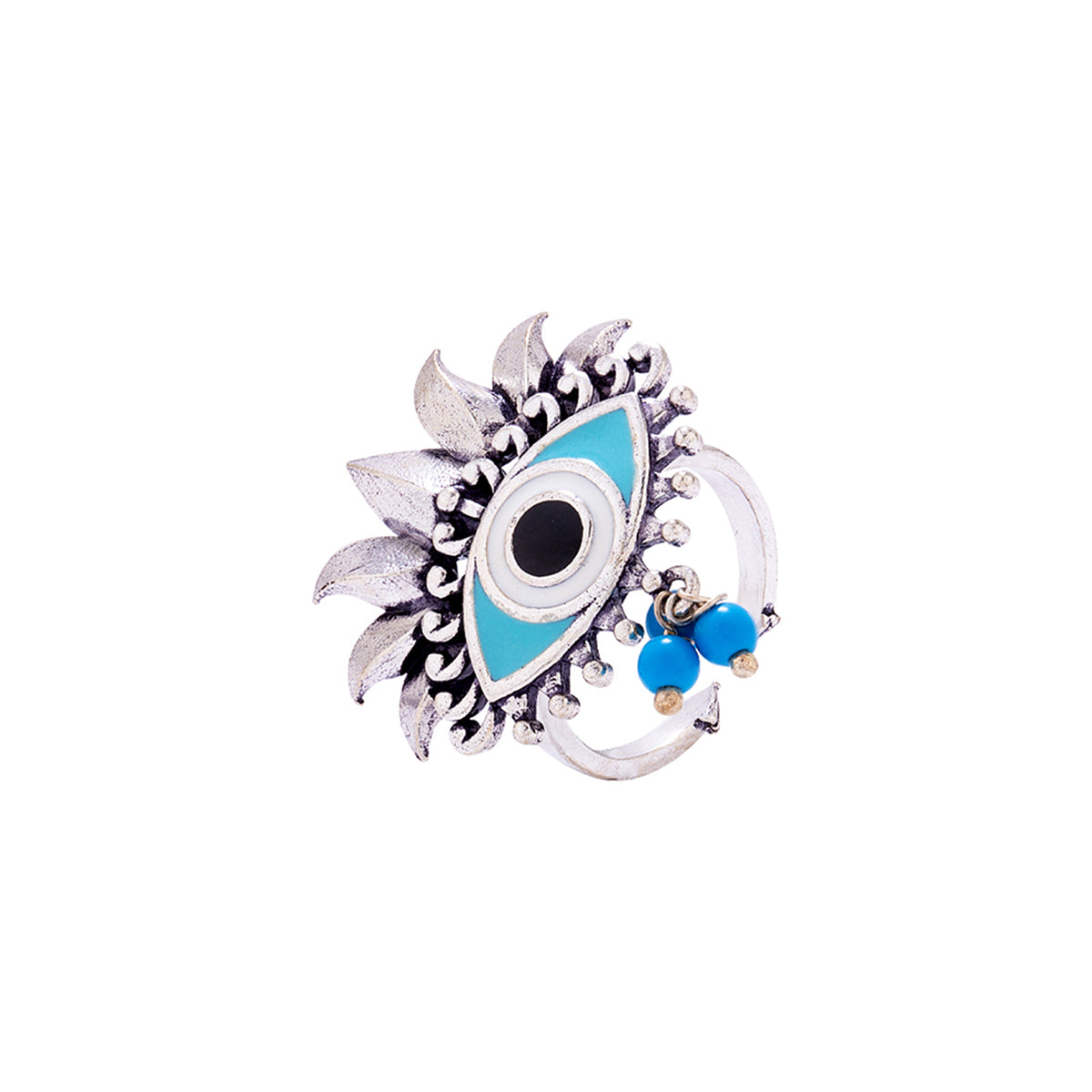 An eye motif statement ring, fashioned out of brass and silver plated. The enamelled ring has been embellished with metal details. Pair with casual attire.