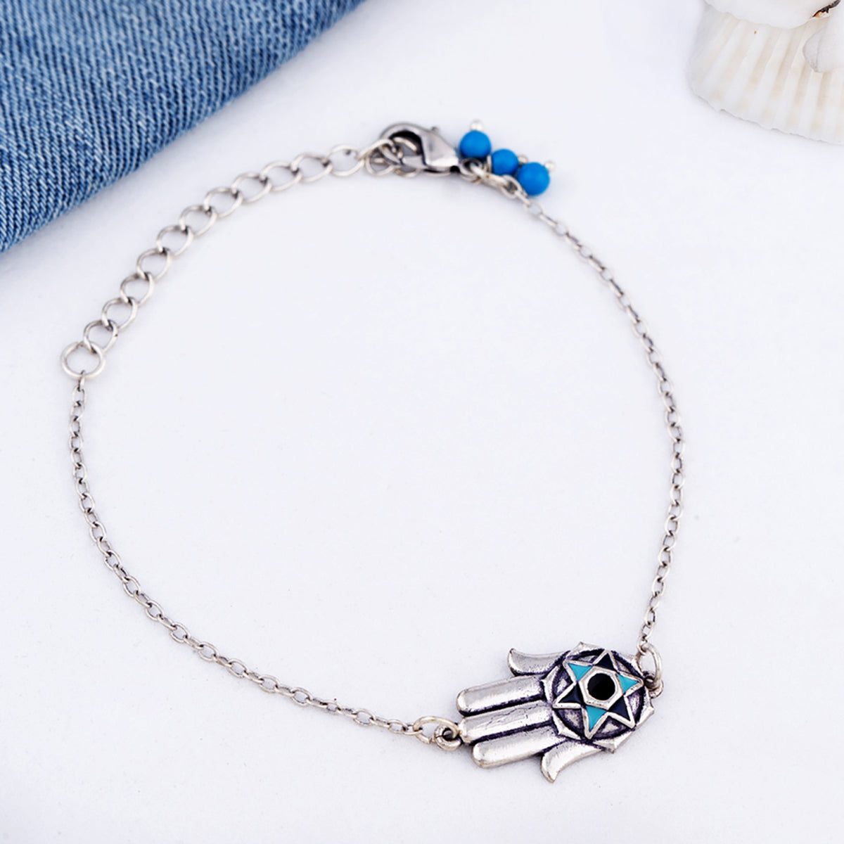 Hamsa charm women's bracelet, made from brass. Oxidized silver plated and enameled. Pair the lightly embellished bracelet with a summer dress.