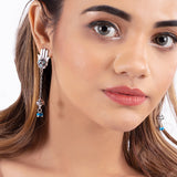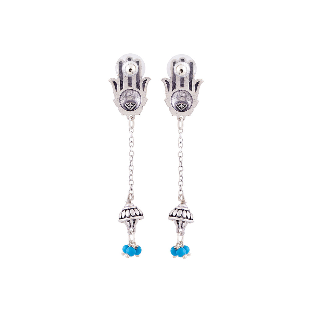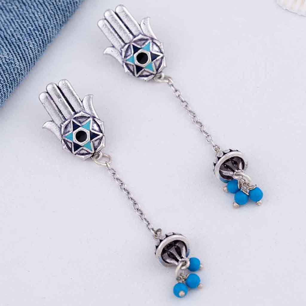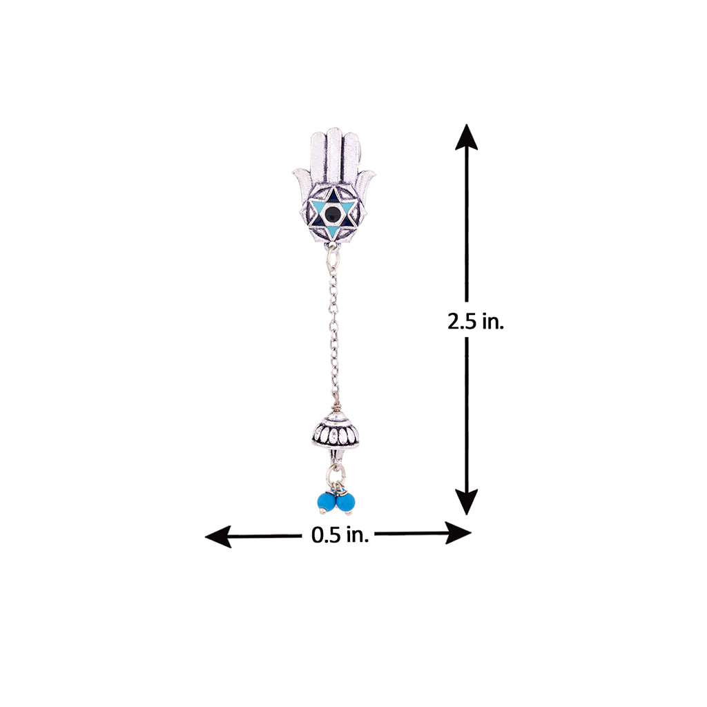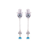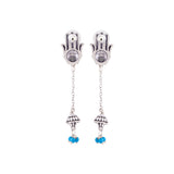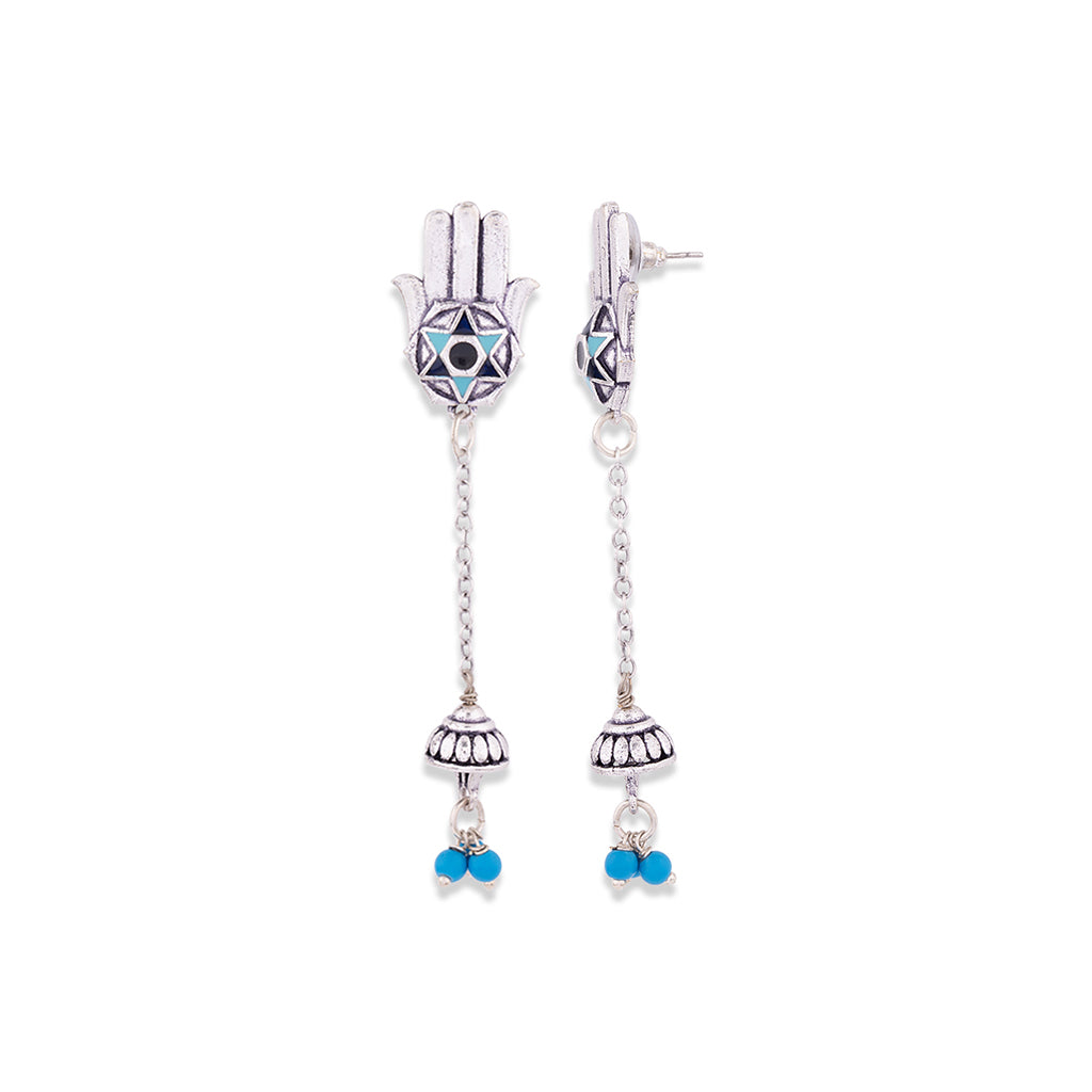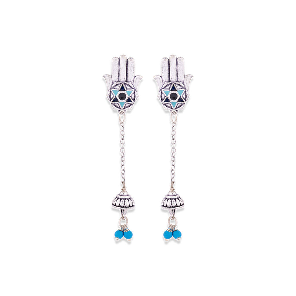 Hamsa drop earrings, made from brass and lightly embellished. Oxidised silver plated and enameled. Wear with a casual summer dress.