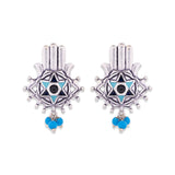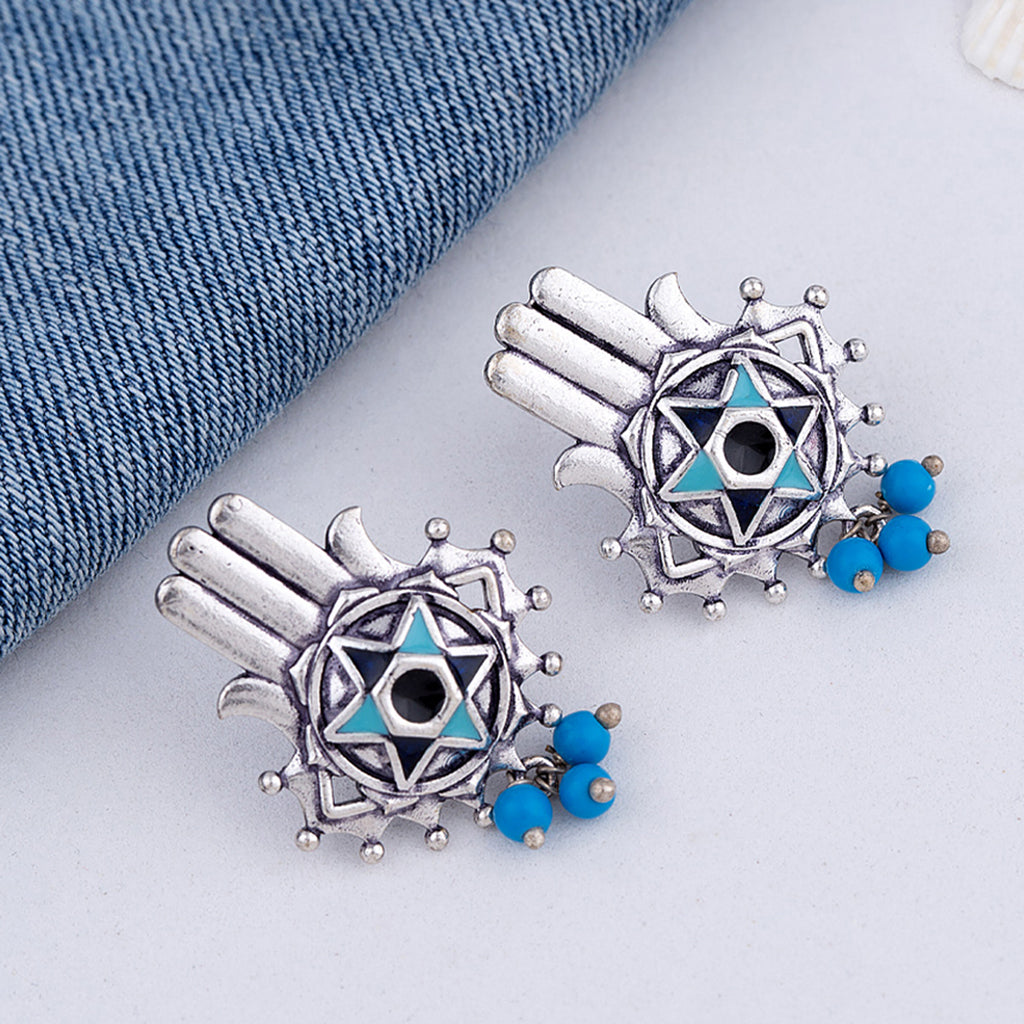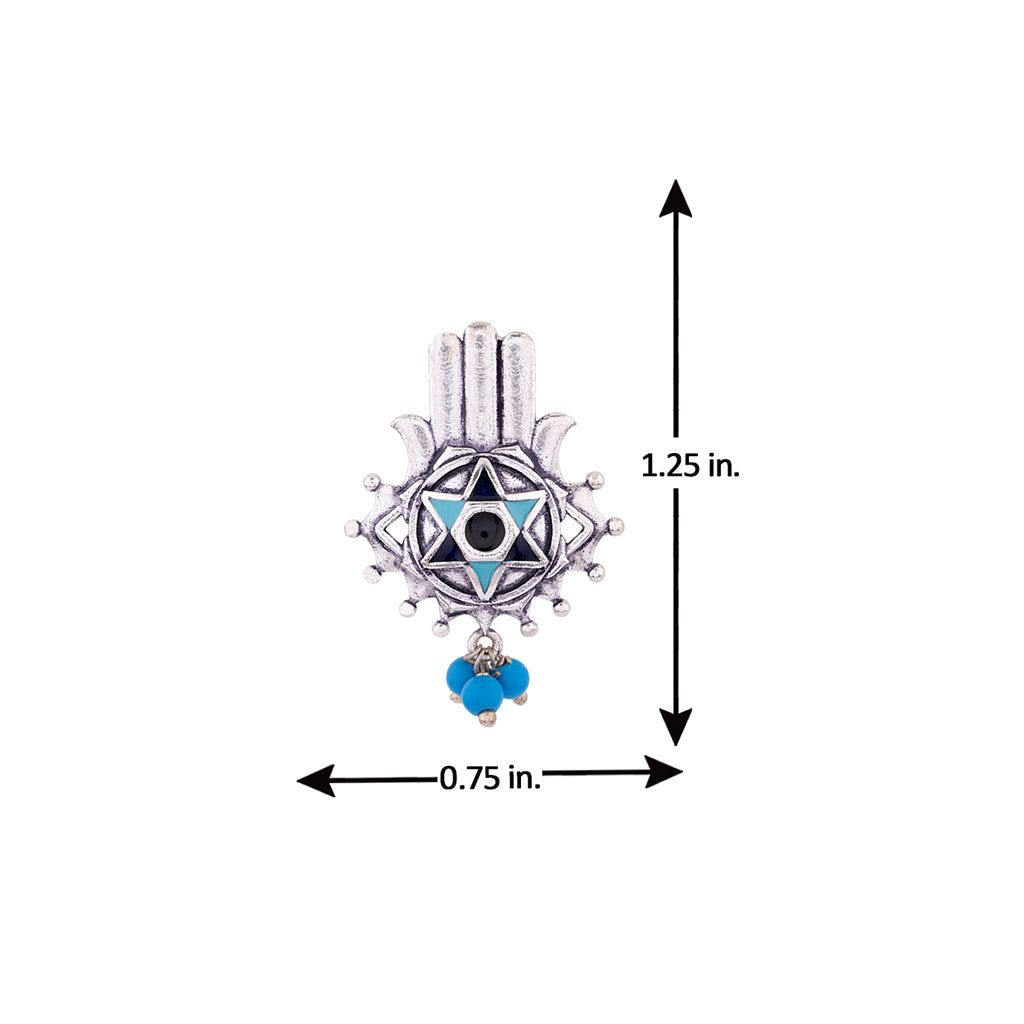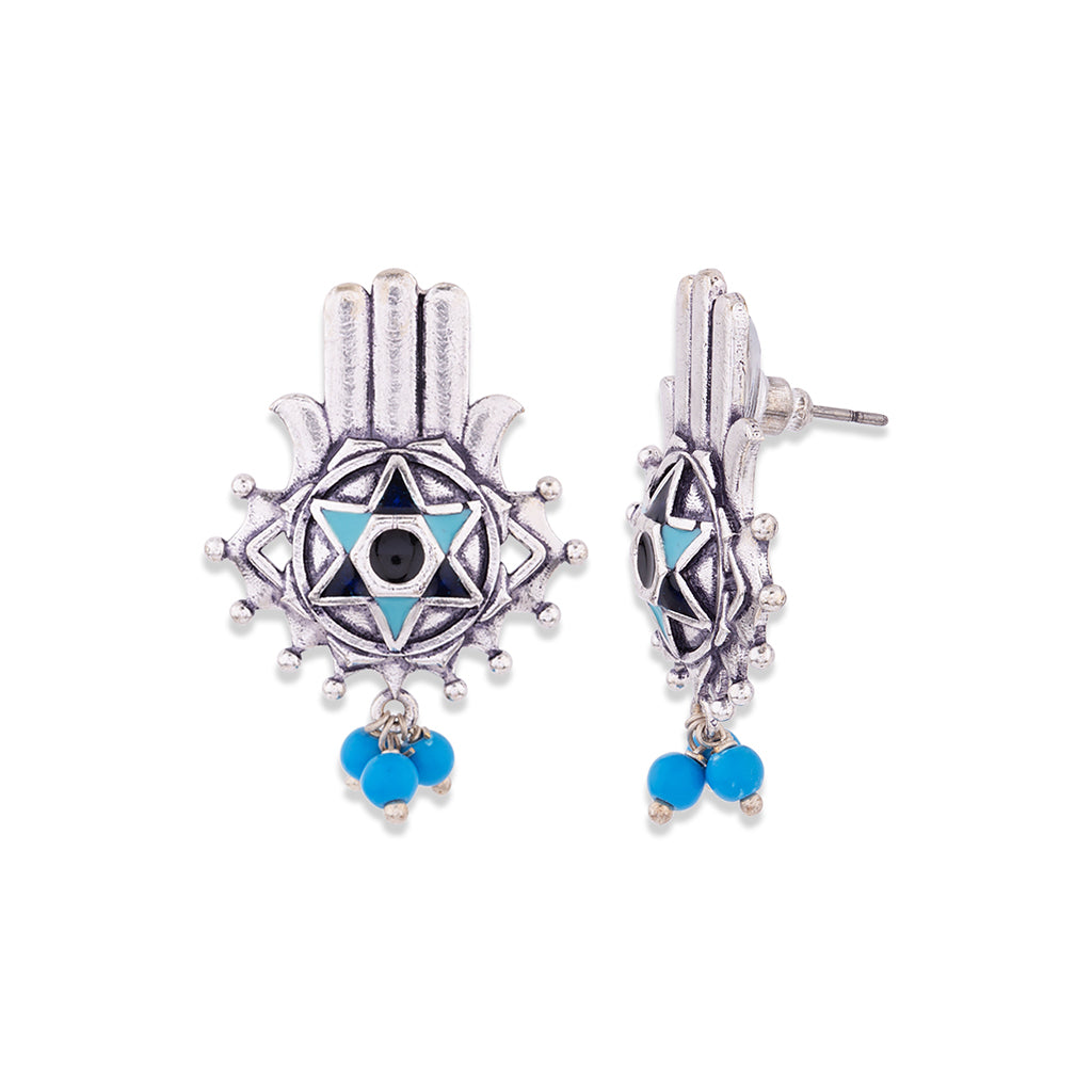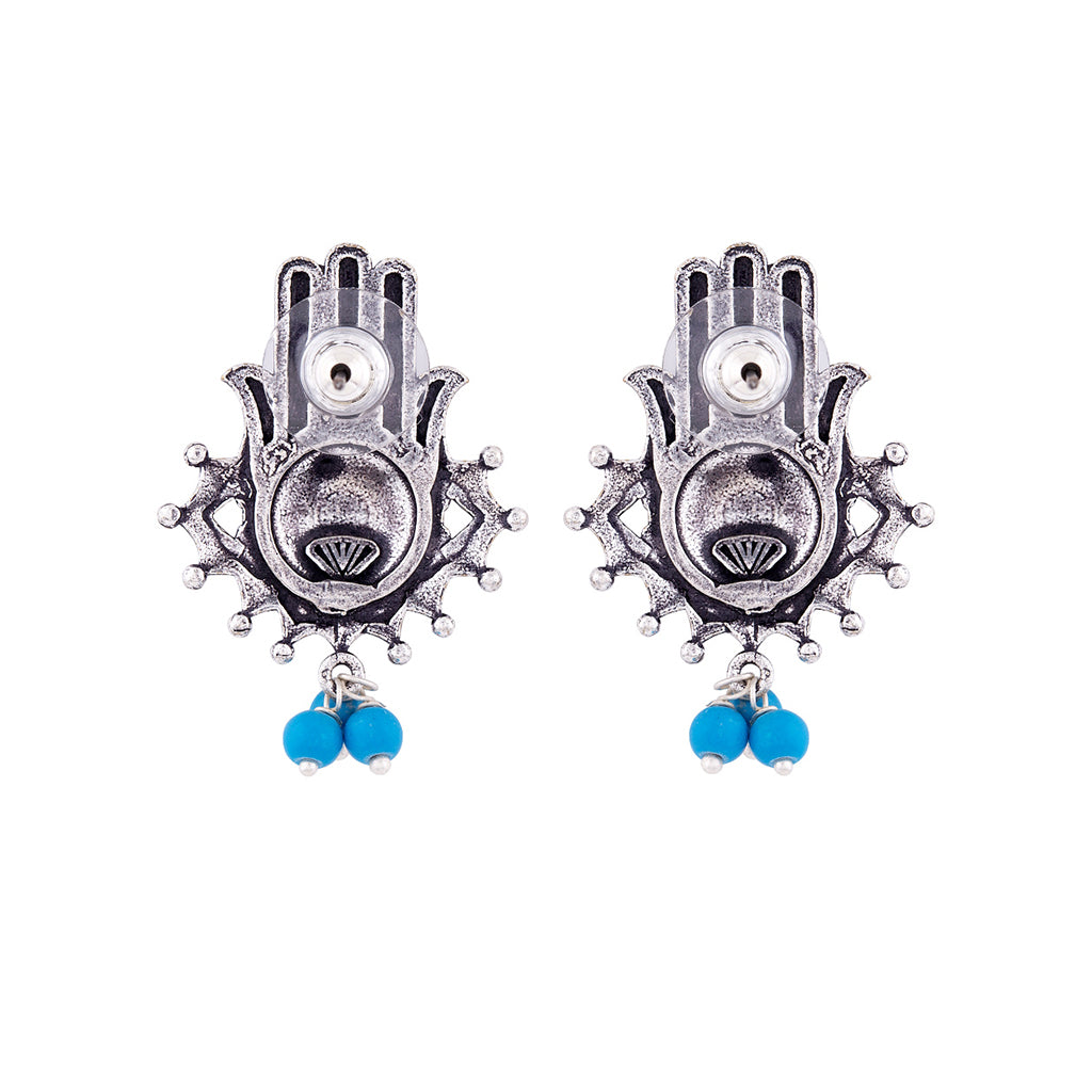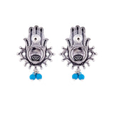 Lightly embellished hamsa stud style earrings, fashioned out of brass. Enameled and oxidised silver plated, the earrings can be paired with a causal kurta, saree or even a summer dress.