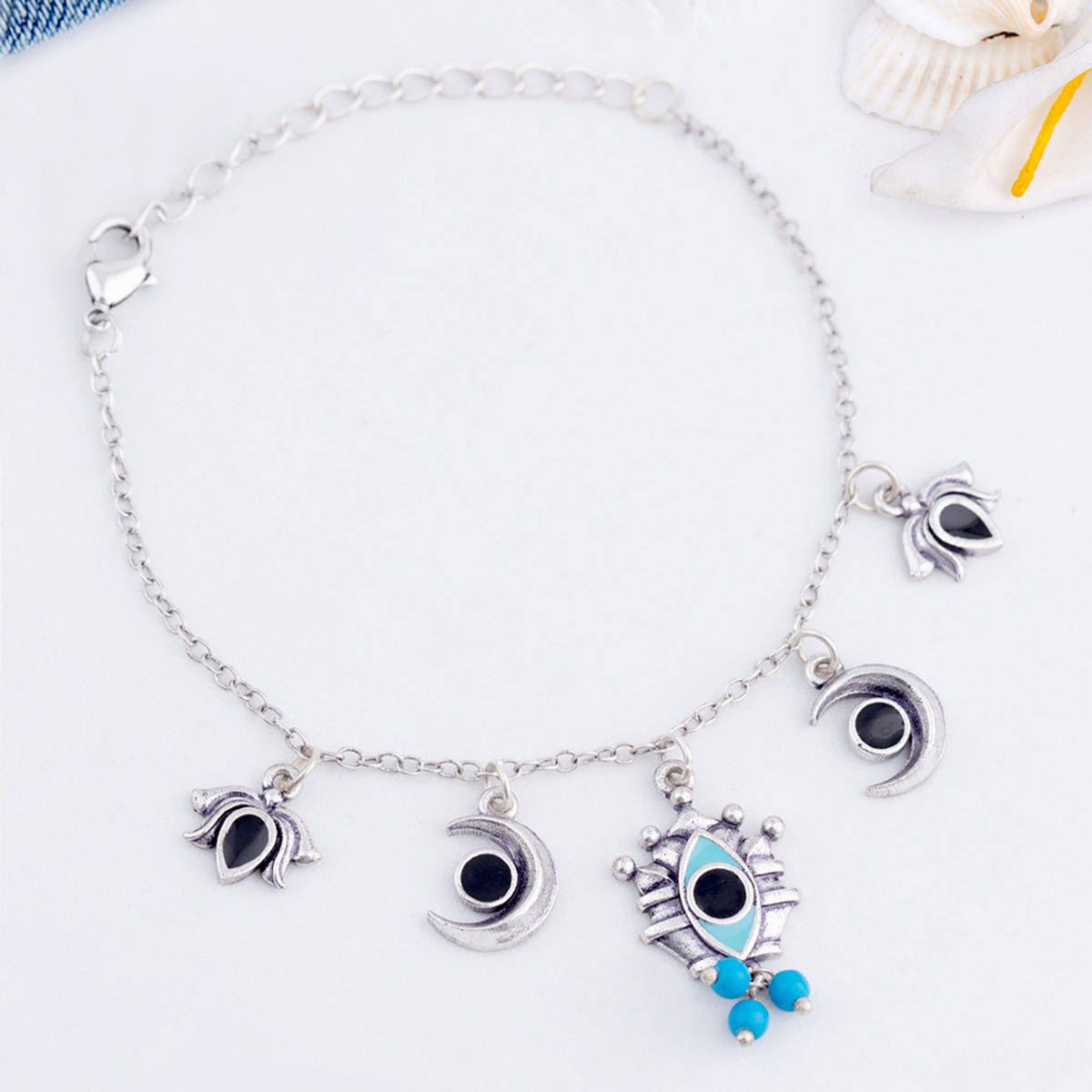 Women's brass bracelet with traditional tribal charms. Oxidized silver plated and enameled, the bracelet can be paired with ethnic and Indo-Western looks.