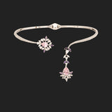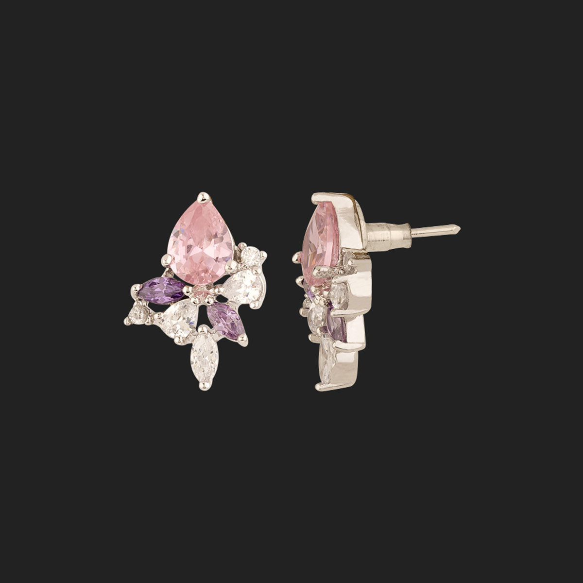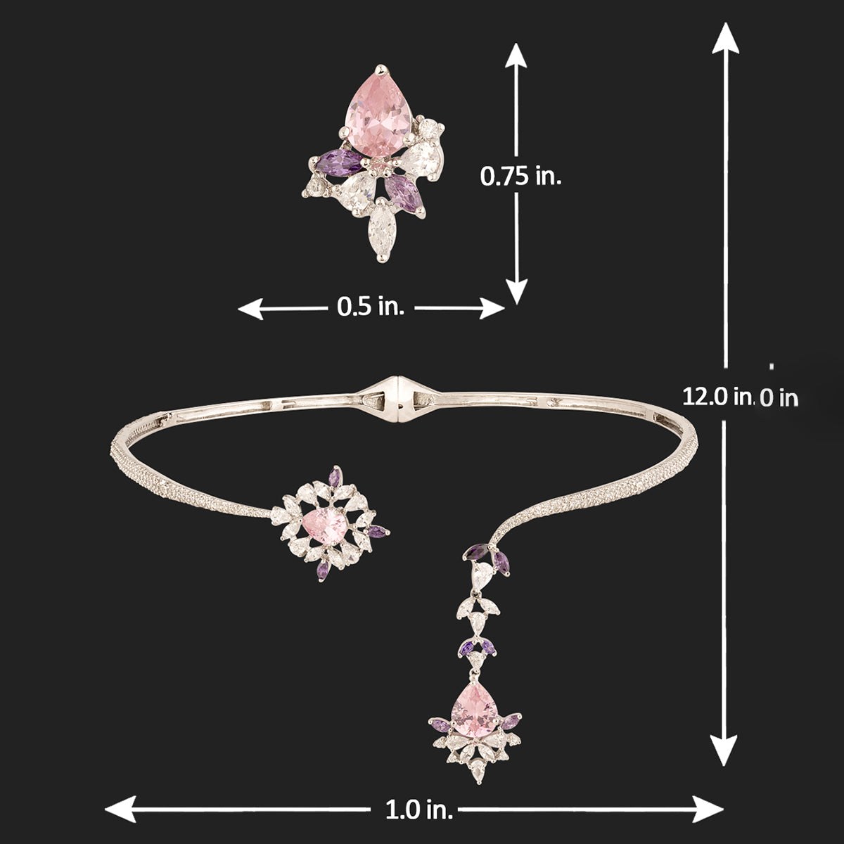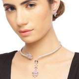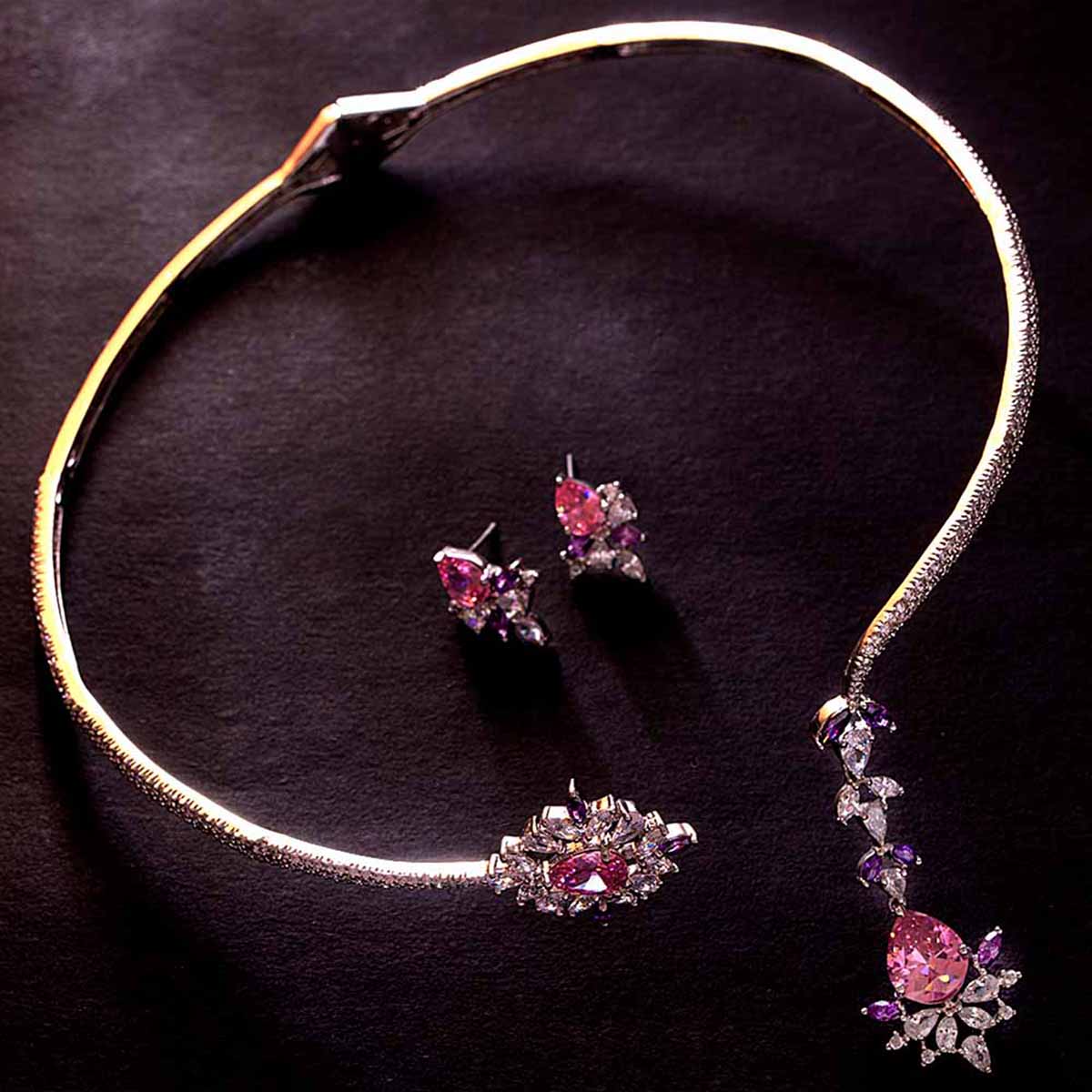 Inspired by the hottest hues of the season, this brass necklace set has been embellished with pink and white gems. Wesr the silver plated set with a cocktail gown.
