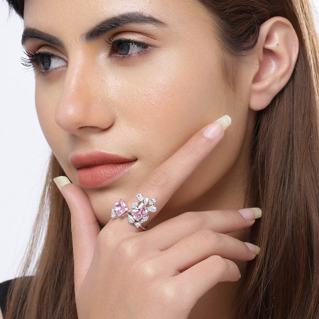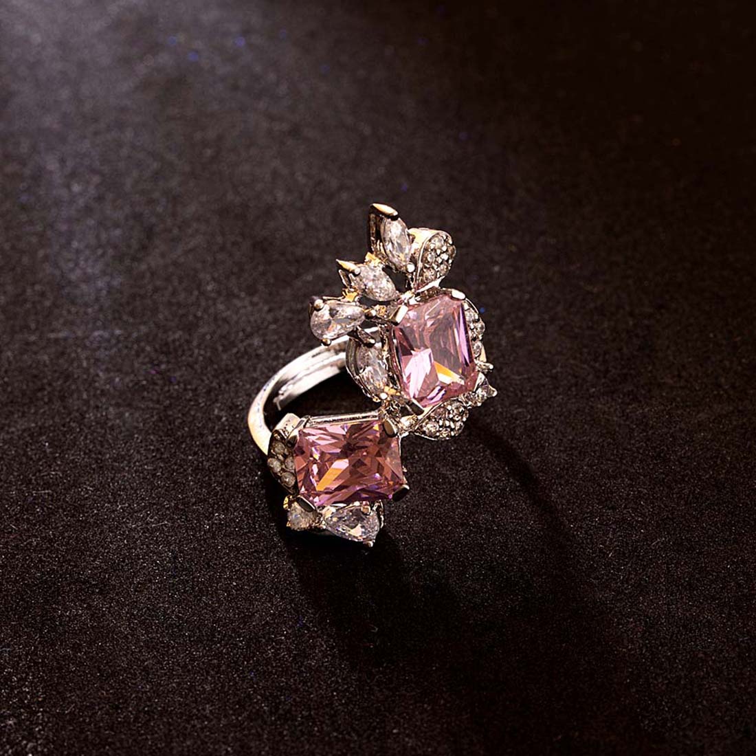 Inspired by the popular runway hues of the season, this brass ring has been embellished with gems. Silver plated and a good match for formal looks.
