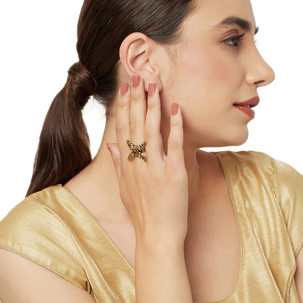 Adorned with faux kundan gems, this brass ring has been fashioned into a tribal inspired design. Yellow gold plating adds to its charm. The ring is adjustable for maximum comfort and will pair well with ethnic and Indo-Western looks of all kinds.