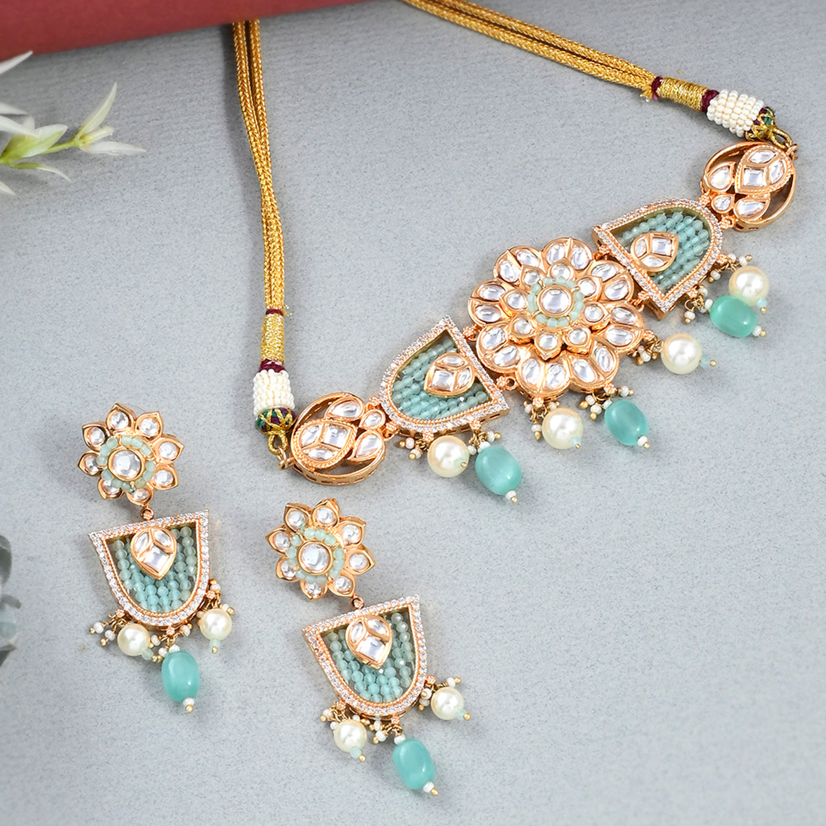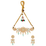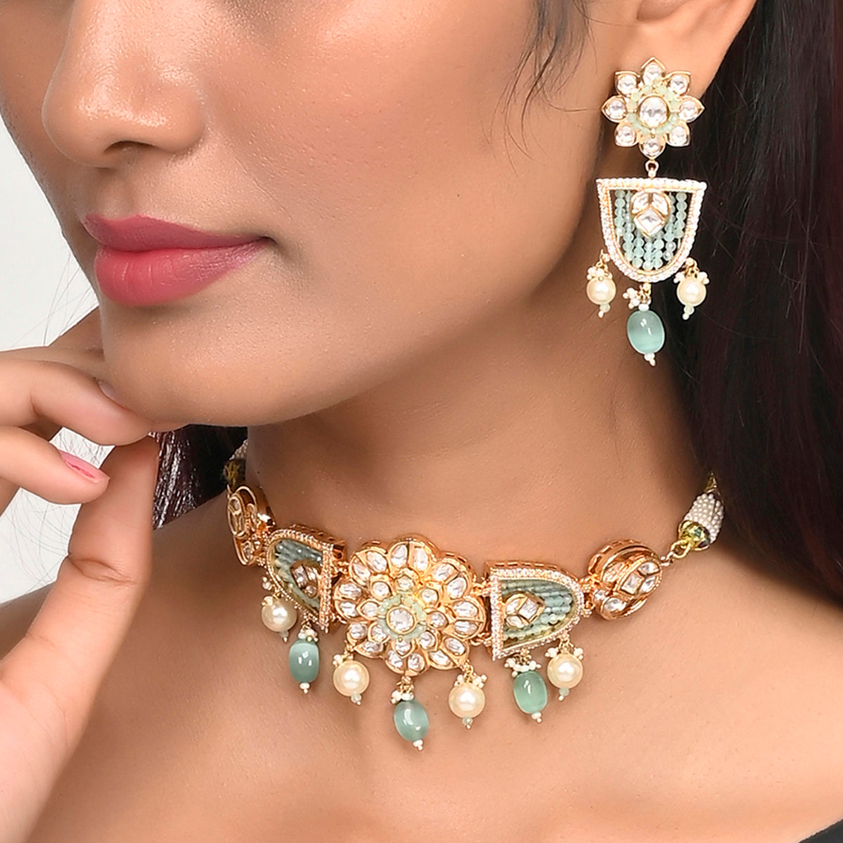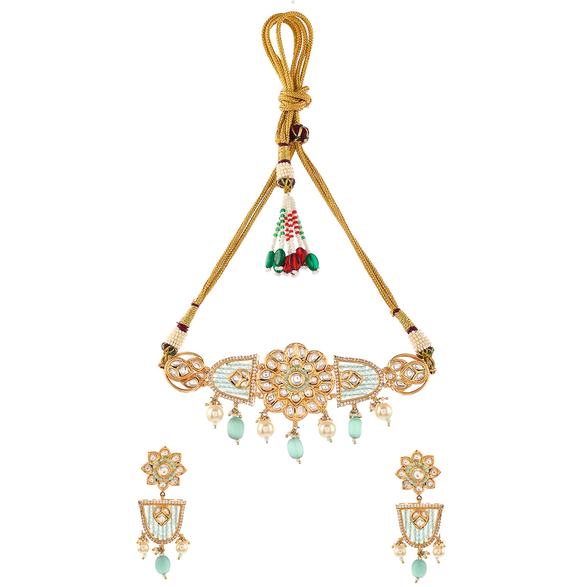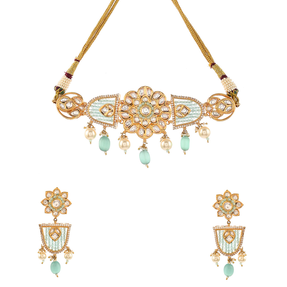 A luxurious jewellery set, fashioned after classic royal pieces. Made from brass and gold plated, the choker and drop earrings have been embellished with pearls and faux kundan gemstones in various alluring cuts. Lightweight and comfortable, the set can be paired with a wide variety of ethnic outfits.