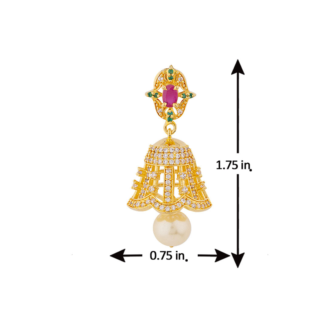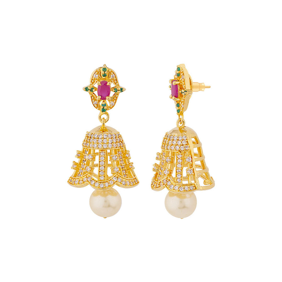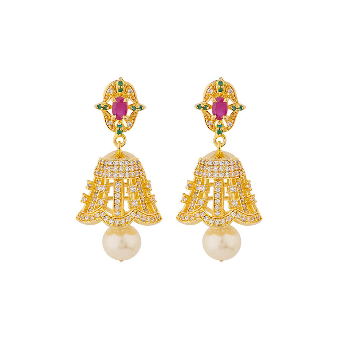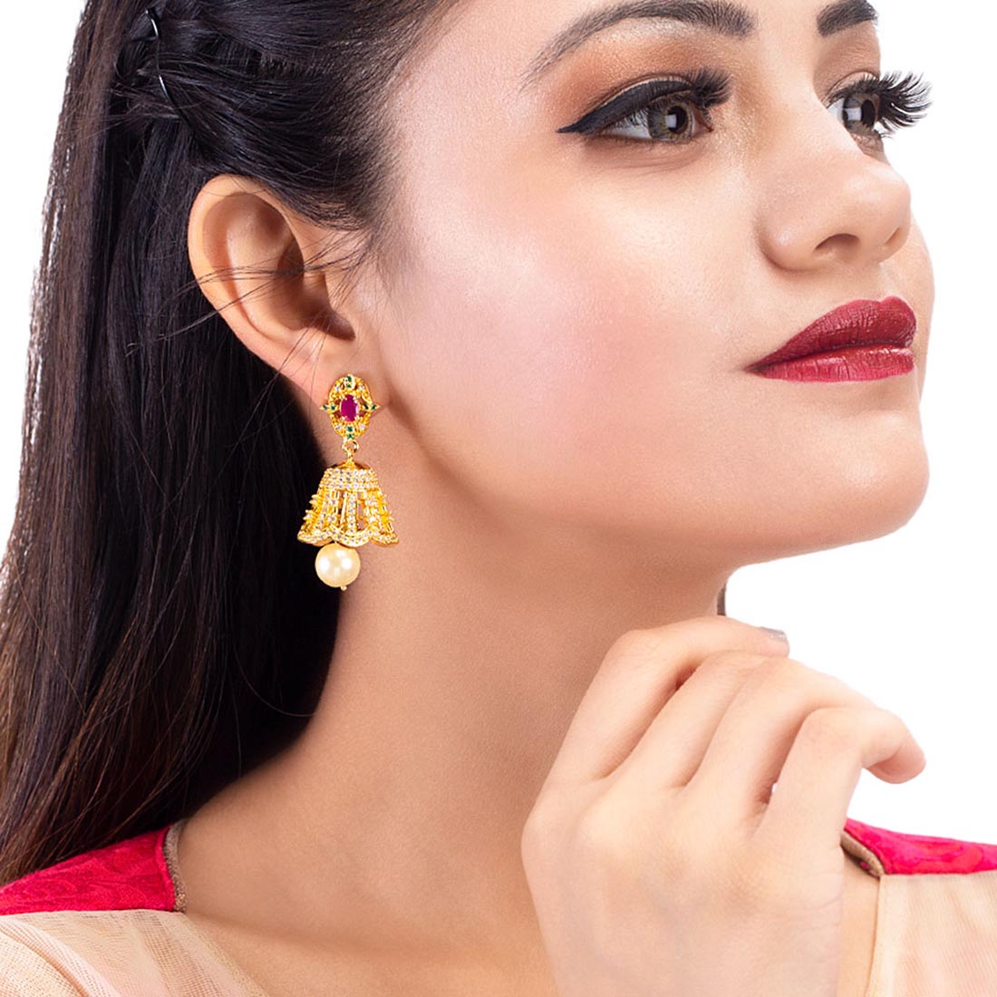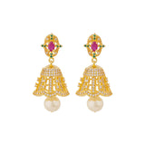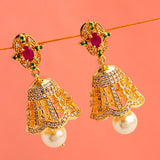 Faux pearls and American Diamond gems embellished jhumka earrings. Made from brass and yellow gold plated. Good for ethnic looks. This piece of jewelry comes with the Voylla assurance of quality and durability.